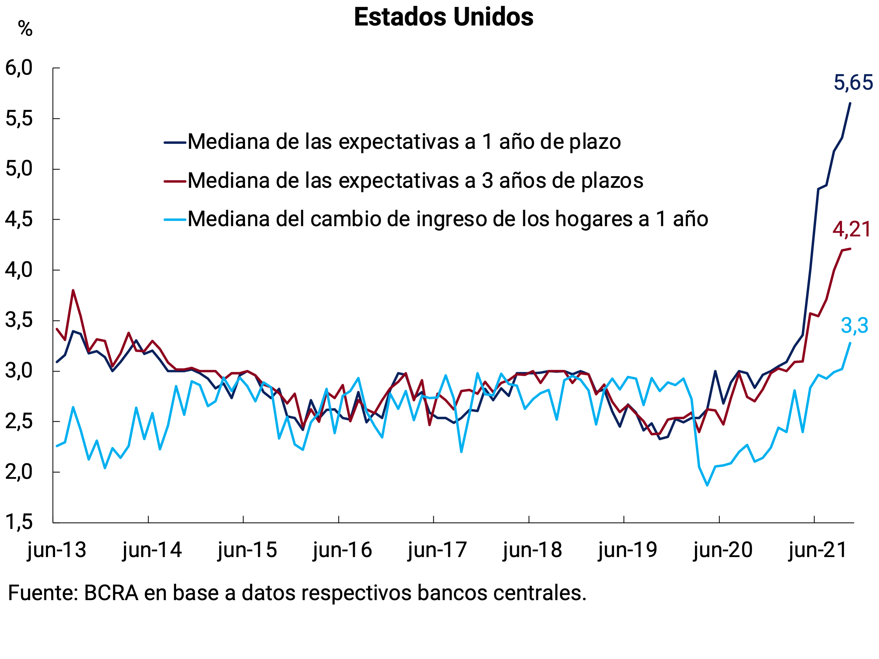 Los cambios de la política monetaria global responden a una inflación creciente. La misma se explica a partir de descalces de oferta, el efecto base de comparación, el aumento del precio de las materias primas, principalmente las energéticas; todo ello en un contexto de medidas de apoyo monetario tomadas desde marzo del año pasado (ver Apartado 1). En las economías emergentes, el impacto de los mayores precios de materias primas fue potenciado por la depreciación cambiaria; esto es a la inversa de lo que ocurría durante el auge de las materias primas (2003-2008), cuando sus mayores precios se compensaban con apreciaciones cambiarias. Los bancos centrales de países emergentes han respondido más rápido ante una aceleración mayor de la inflación (ver Gráfico 2.10 y el Gráfico 2 del apartado 1), y al riesgo de que las expectativas de precios se desanclen. En tanto, las expectativas de inflación de los países desarrollados han aumentado, pero se mantienen en la mayoría de los casos ancladas en el mediano plazo. En Estados Unidos los indicadores de inflación esperada por el mercado muestran un leve aumento en el margen, pero se observa un mayor repunte de la inflación esperada en encuestas a consumidores. La inflación esperada en la Zona del euro se encuentra anclada (ver Gráfico 2.11).