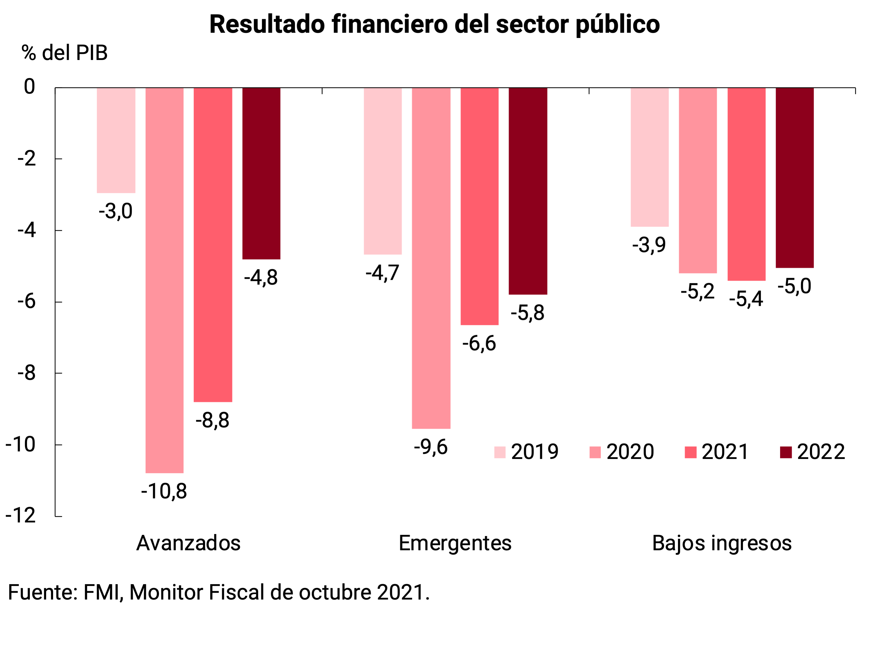 En muchas economías avanzadas, la política fiscal siguió siendo expansiva y se está orientando hacia gastos más vinculados con infraestructura, acumulación del capital humano, cambio climático y transformación digital. El Plan de Empleo y del Plan de Familias en Estados Unidos y el plan “Nueva Generación” en la Unión Europea son los ejemplos más relevantes. Por el contrario, en las economías emergentes y en desarrollo el impulso fiscal se ve más limitado ante los desafíos de financiar grandes déficits, dado el menor acceso al mercado y el escaso margen para recaudar impuestos en el corto plazo.