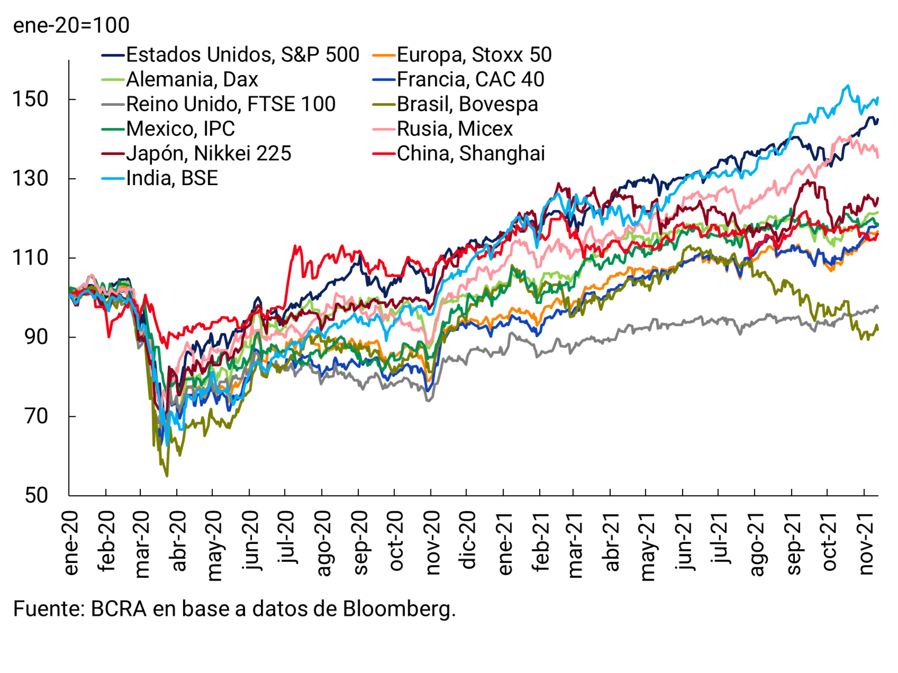 En septiembre hubo algunos días de turbulencias en los mercados de acciones ante el temor de cual podría ser el impacto global de los problemas para enfrentar los vencimientos de deuda por parte de Evergrande y otros desarrolladores inmobiliarios chinos; aunque se fue diluyendo el temor de contagio financiero, se estima que el impacto en el sector real puede ser considerable. Los mercados de criptoactivos continuaron con euforia y elevada volatilidad. La capitalización de mercado se triplicó en 2021 a un máximo histórico de US$2.6 billones actuales, aunque pasando antes por un máximo de US$2,4 billones en mayo para caer a US$1,2 billones en julio, lo que muestra la elevada volatilidad.