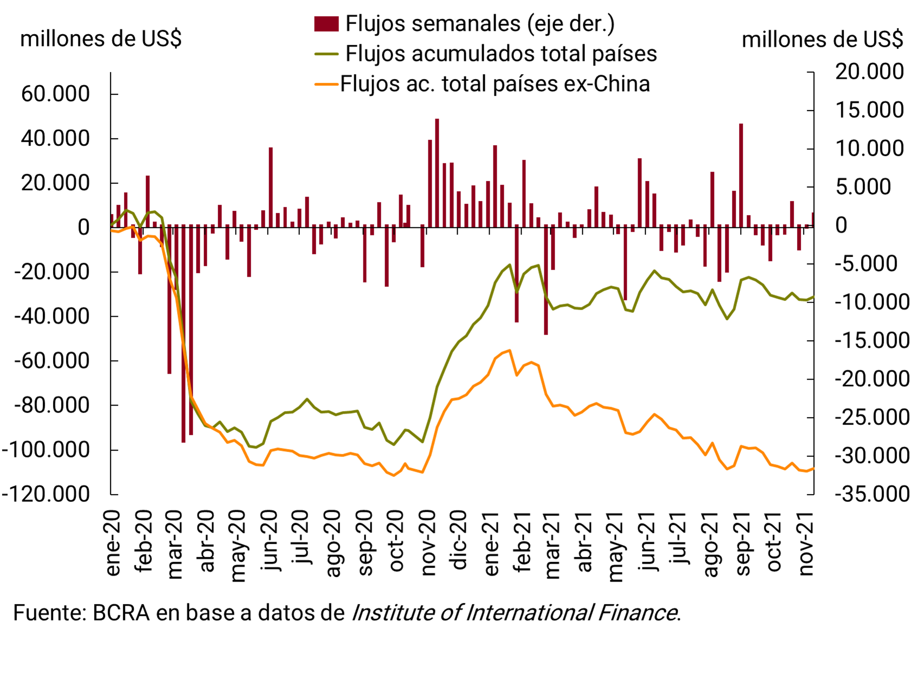 Los flujos de capitales hacia países emergentes no tuvieron grandes cambios en los últimos meses, acumulando una entrada neta de US$9,9 mil millones desde el IPOM anterior y un número similar desde comienzos de año (ver Gráfico 2.14). De todas maneras, hay que remarcar que gran parte de ellos se dirigieron a China y son negativos hacia el resto de los países. Desde el inicio de la pandemia, los países emergentes (excluyendo China) acumulan salidas de capitales por US$31 mil millones, mientras que China registra influjos por US$77 mil millones. Finalmente, los precios de materias primas no mostraron mayores movimientos (caída de 2% desde el cierre del IPOM anterior de acuerdo al IPMP del BCRA), a excepción del precio del petróleo que subió un 25% en el mismo período.