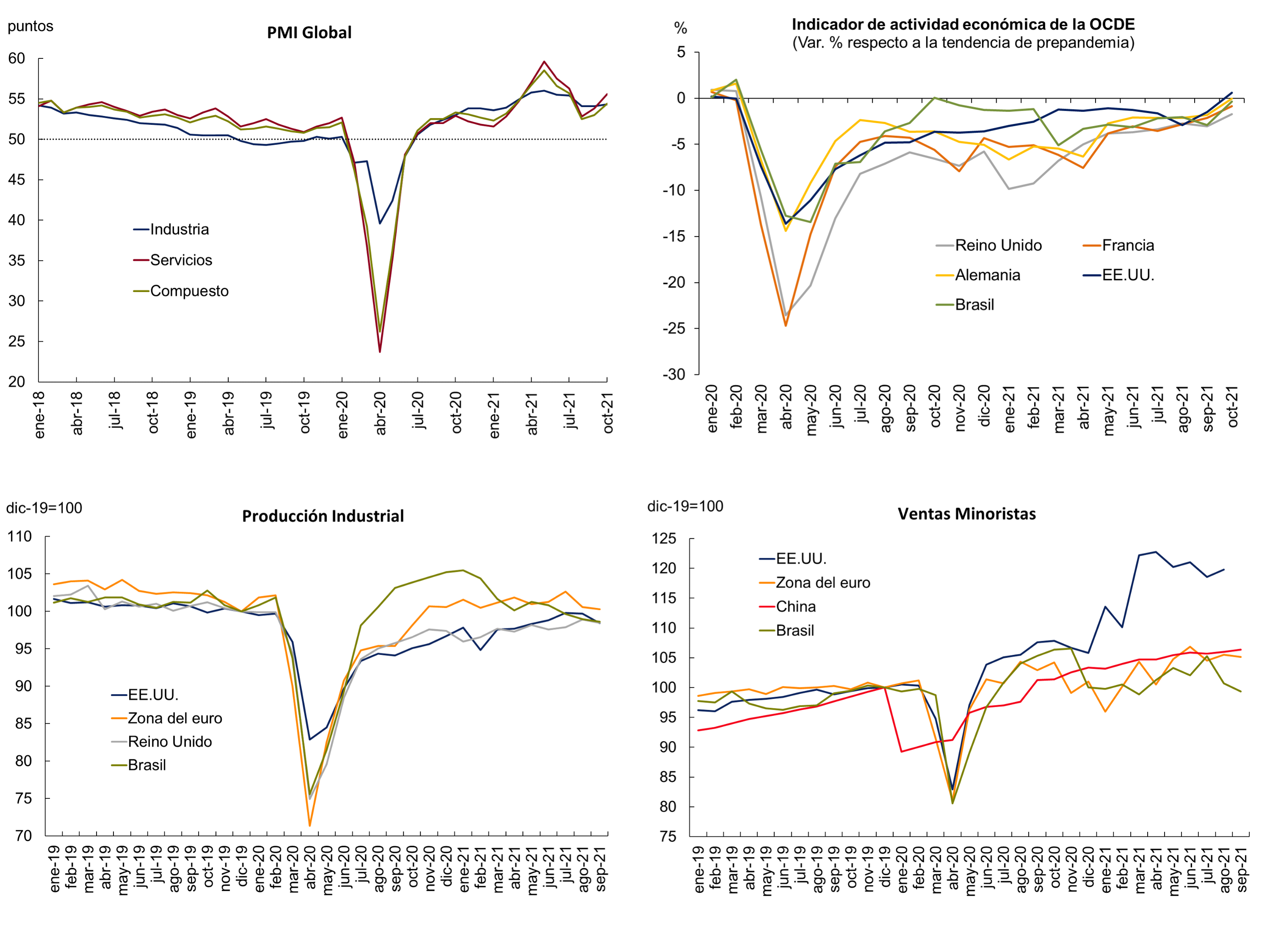 Los datos de alta frecuencia reflejan también un menor crecimiento de la economía global en el tercer trimestre del año. El indicador de gerentes de compras (PMI, por sus siglas en inglés) global muestra una tendencia decreciente desde el máximo de 15 años registrado en mayo, con una caída más marcada del sector de servicios, aunque continuó en terreno expansivo (por encima de 50)1. Por otra parte, los indicadores de producción industrial se estancaron en el tercer trimestre, debido principalmente a los “cuellos de botella“ globales en materias primas, semiconductores y transporte marítimo; mientras que las ventas minoristas evidenciaron una menor tasa de crecimiento que trimestres previos (ver Gráfico 2.5). Entre septiembre y octubre se aprecia una recuperación del PMI en Estados Unidos y China. El indicador de actividad económica de la OCDE también muestra un mejor desempeño en octubre en Estados Unidos, los principales países de la zona del euro y Brasil (ver Gráfico 2.5)2.