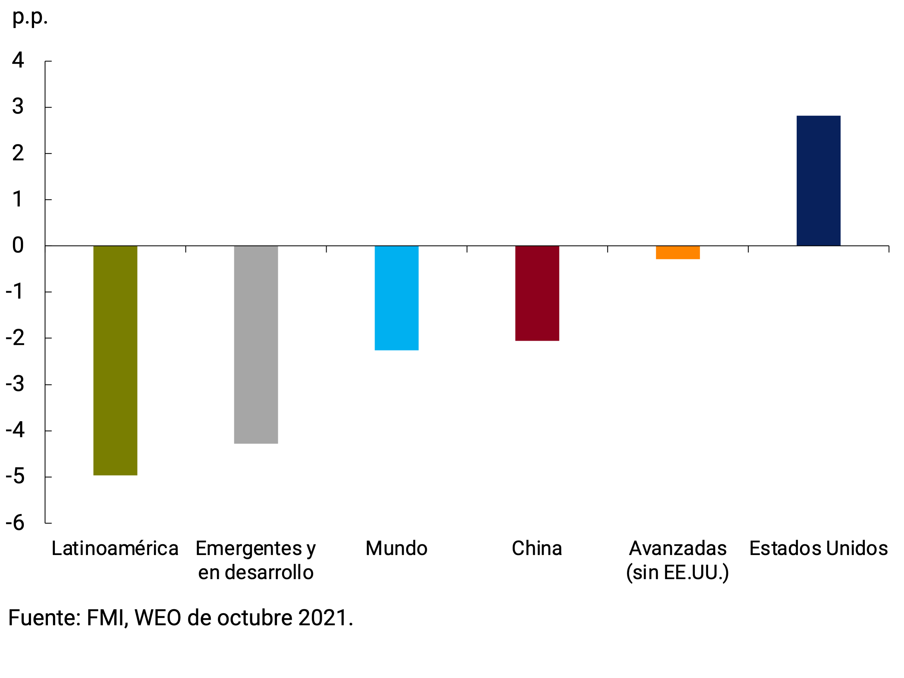 Fuente: FMI (WEO) y otras fuentes: OCDE (mundo y China), ECB (zona del euro), Fed (Estados Unidos), Bacen – Encuesta Focus (Brasil). (1) Corresponde a octubre 2021. (2) Corresponde a mayo de 2021. (3) Corresponde a junio de 2021.