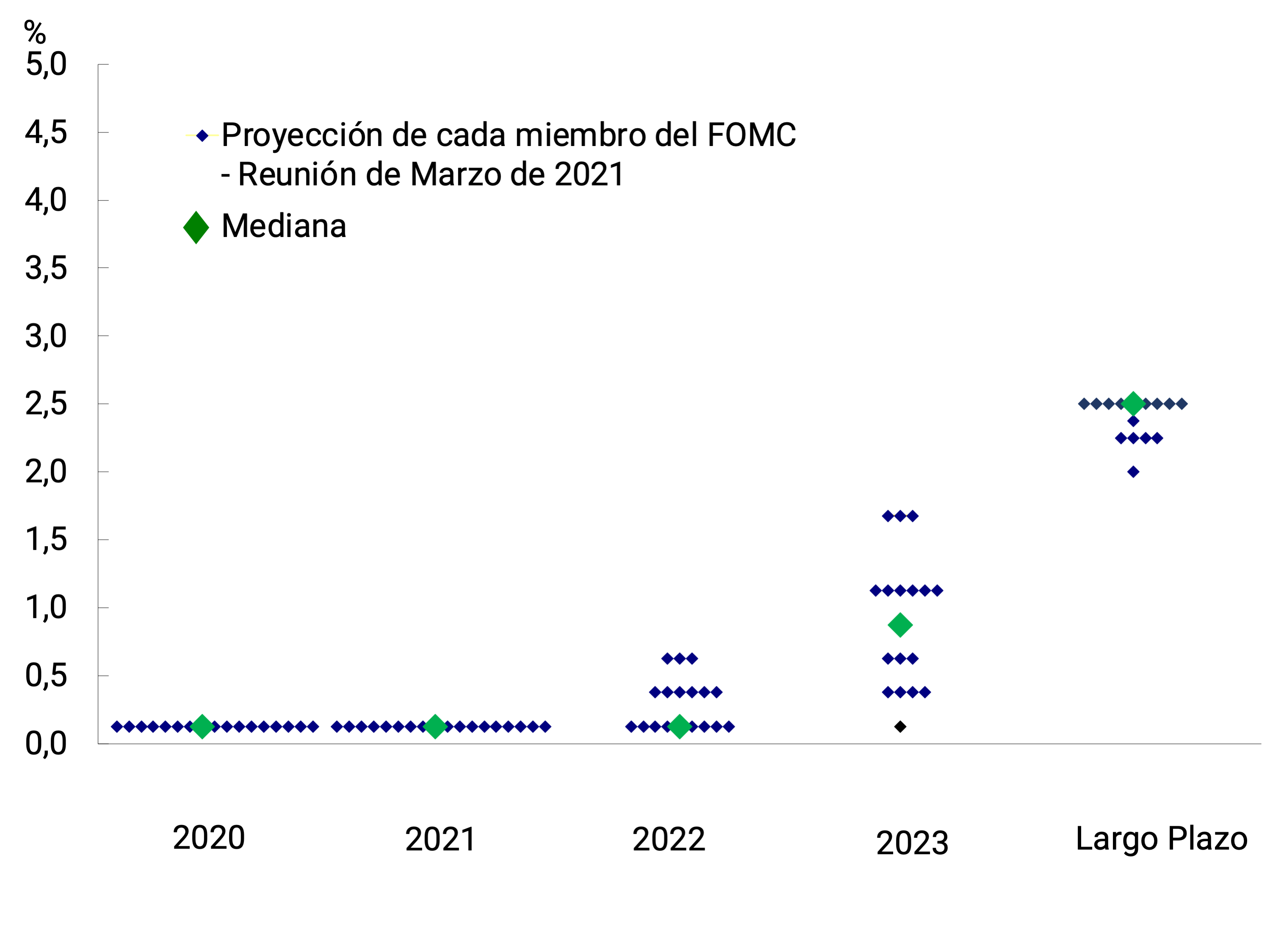 Gráfico 2.9 | Proyección de la evolución de las tasas de interés de los miembros del Comité de Mercado Abierto de la Fed