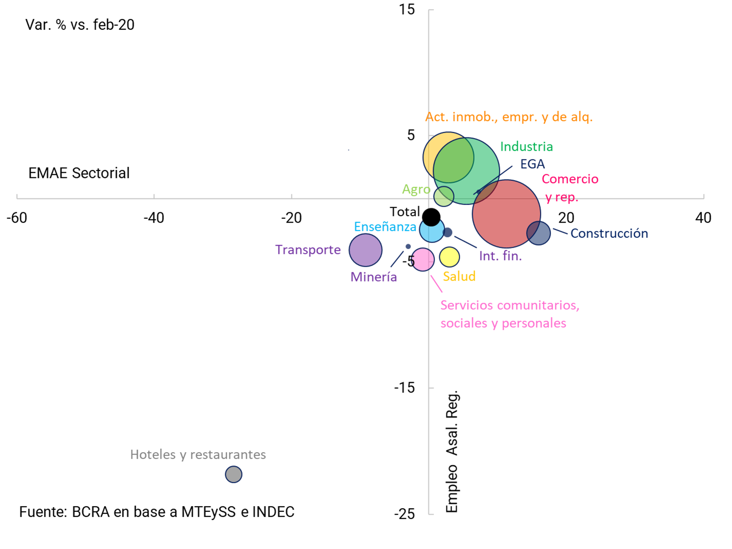 En el cuadrante superior izquierdo se encuentran los bloques que han alcanzado o superado su nivel prepandemia, liderados por la construcción y el comercio. Estos sectores sufrieron un fuerte impacto por la pandemia en 2020, pero se recuperaron velozmente y superan en más de 10% s.e. el nivel observado en febrero de 2020. En el cuadrante inferior izquierdo se ubican las ramas con peor performance relativa, siendo el segmento de Hoteles y restaurantes el que ha mostrado la recuperación más débil y aun continua muy lejos de sus niveles prepandemia (-28,5% s.e.). El sector “Otros servicios sociales y comunitarios”, que incluye entre otras la actividad de cines, teatros, peluquerías, actividades culturales y deportivas, logró recuperarse más rápidamente y operar prácticamente en niveles prepandemia (-0,9% s.e.).