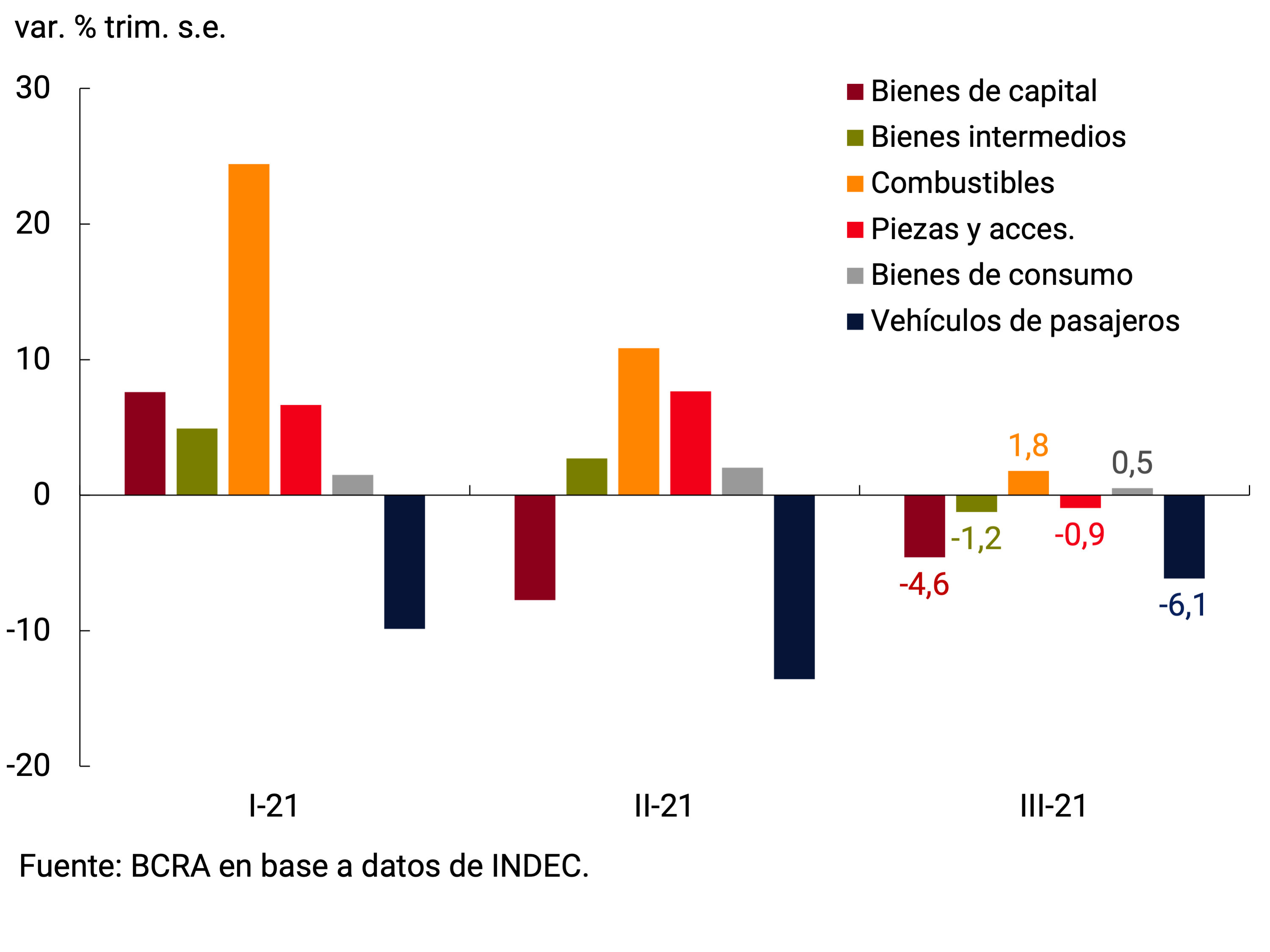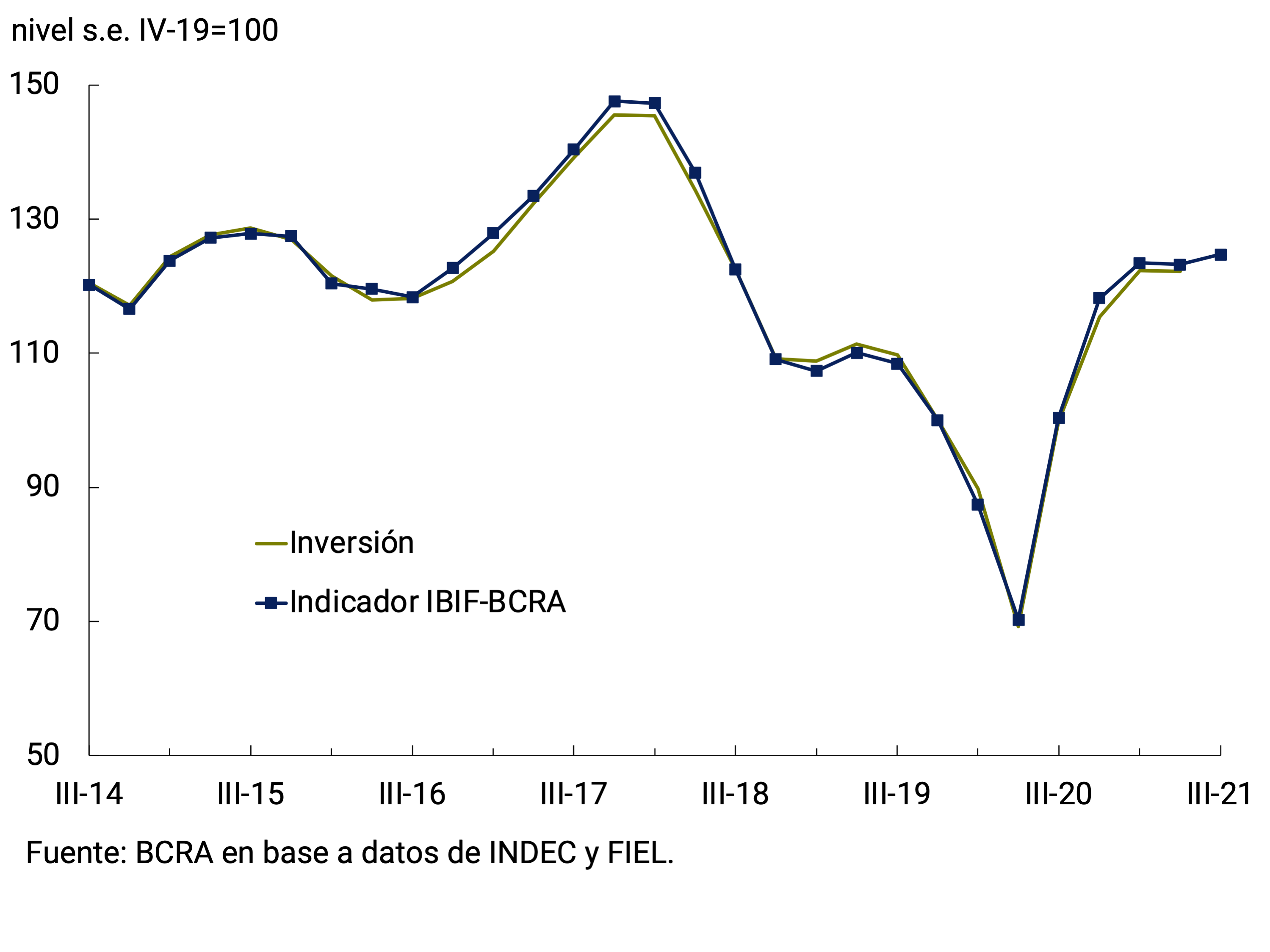 Por su parte, el indicador IBIF-BCRA continuó en aumento y presentó una mejora trimestral de 1,3% s.e. en el tercer trimestre de 2021 (ver Gráfico 3.4). Dicha suba respondió a incrementos de la inversión en equipamiento durable de origen nacional y de la construcción, parcialmente compensados por una caída en el equipamiento importado9. Con respecto al sector externo y de acuerdo con la información referida al Intercambio Comercial de Bienes del INDEC, en el tercer trimestre el aporte de las Exportaciones netas de bienes y servicios a la variación trimestral del Producto habría sido positiva. Las cantidades exportadas de bienes registraron una fuerte suba trimestral (7,6% s.e.), mientras que los volúmenes importados de bienes permanecieron en niveles muy similares a los del trimestre anterior en términos desestacionalizados (ver Capítulo 4. Sector Externo).