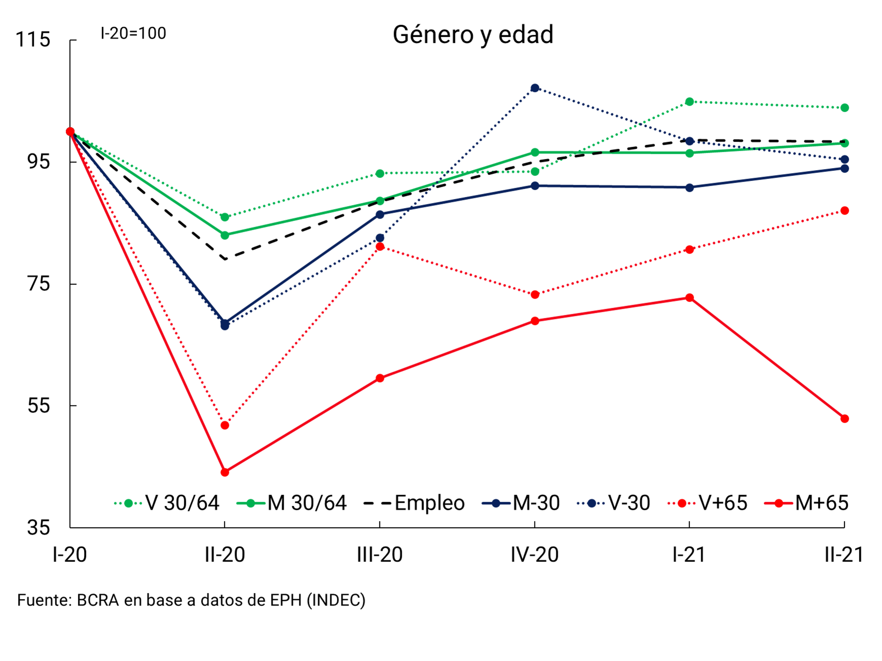 De acuerdo con los datos de la Encuesta Permanente de Hogares (EPH), en el II-21, el mercado laboral detuvo el ritmo de recuperación verificado en los tres trimestres anteriores. Este fenómeno se asocia a la merma transitoria del nivel de actividad fruto de las restricciones implementadas durante la segunda ola de contagios. Las tasas de Empleo y de Población Económicamente Activa (PEA) se situaron levemente por debajo de los niveles vigentes en el primer trimestre (45,9% y 41,5% respectivamente), al tiempo que la tasa de desocupación abierta se ubicó en 9,6%, mostrando una reducción respecto a la del primer trimestre (10,2%; ver Gráfico 3.6)12. En cuanto a la evolución de las distintas categorías ocupacionales, se puede observar que durante el II-21 el cuentapropismo volvió a caer (aunque aún se encuentra por encima de los niveles prepandemia del I-20) y que los patrones mantienen un crecimiento sostenido desde IV-20. Esta dinámica podría obedecer a una continuidad del efecto sustitución entre ambas categorías (cuentapropistas que incorporan empleados a sus tareas y pasan a ser patrones). Por otro lado, el crecimiento de las y los asalariados informales se estancó lejos aún de los niveles prepandemia. Asimismo, el dato más destacado fue el crecimiento por segundo período consecutivo de las y los asalariados con descuento jubilatorio que, con un alza importante, superaron el nivel de I-2013. Por último, el rango etario más afectado continuó siendo el de mayores de 65 años y las mujeres en general fueron las que se encontraron más rezagadas en términos de recuperación del empleo (ver Gráfico 3.7).