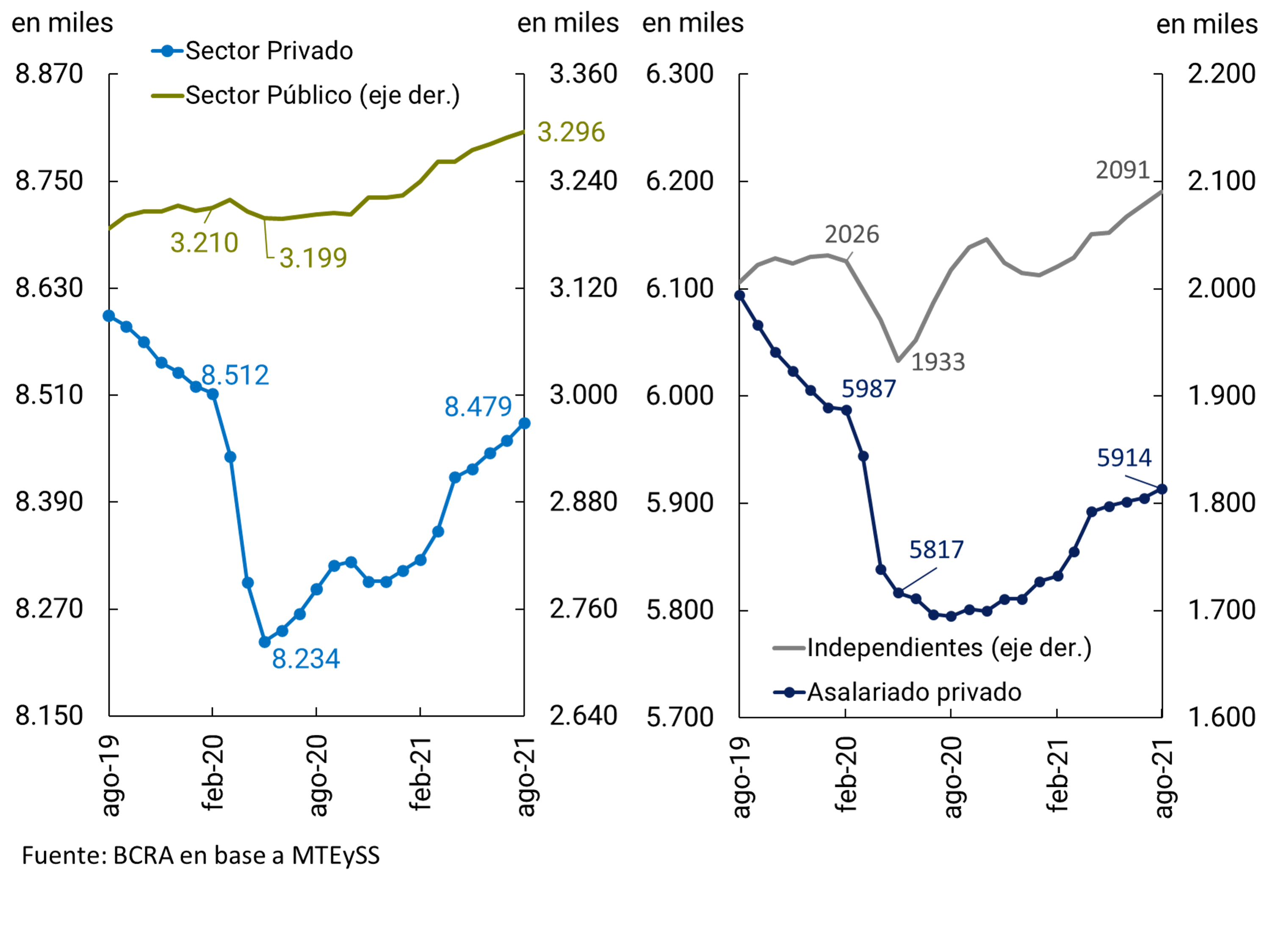 Con datos a agosto para el empleo registrado, el ritmo de expansión durante el tercer trimestre mantendría la dinámica evidenciada desde abril. Según el Ministerio de Trabajo, Empleo y Seguridad Social (MTEySS) el empleo registrado total sostuvo la tendencia positiva iniciada desde principio de año, acumulando entre junio y agosto una suba de 0,6% s.e. Así, este indicador mostró una mejora de 0,4% s.e. respecto a febrero de 2020, nivel previo a la irrupción de la pandemia (ver Gráfico 3.8).