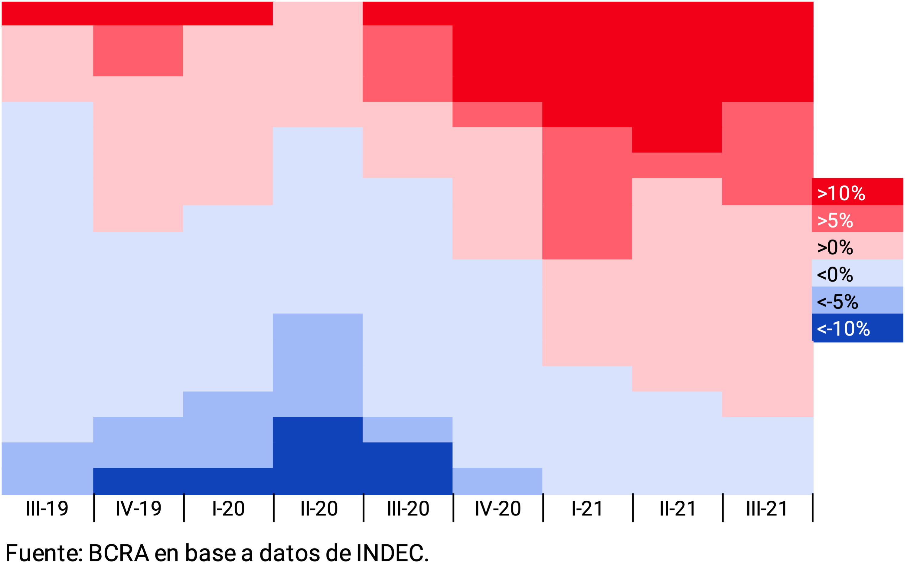 La actividad económica retomó el sendero de recuperación en el tercer trimestre del año, luego de retroceder transitoriamente como consecuencia del impacto de la segunda ola de COVID-19, en línea con lo anticipado en el IPOM anterior. Los datos disponibles del EMAE de agosto mostraron que el desempeño sectorial es aún heterogéneo, en el que conviven actividades que lograron operar y mantenerse en niveles relativamente altos y otras que recientemente comenzaron a tomar mayor impulso. De acuerdo con la evolución de diversos indicadores adelantados la actividad económica continuaría mejorando en lo que resta del año, traccionada fundamentalmente por el desempeño de los servicios.