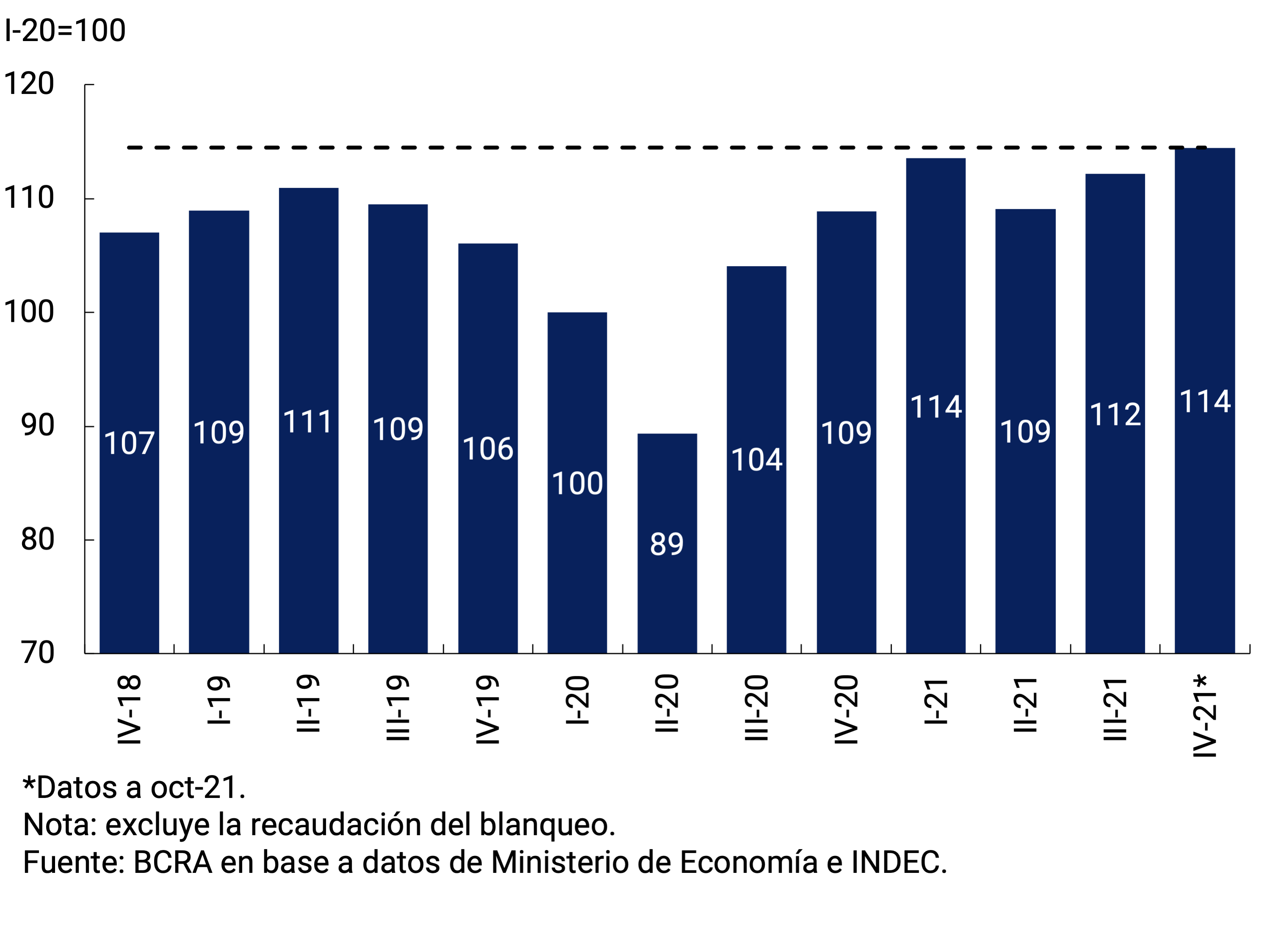 La situación sanitaria permitió implementar nuevas flexibilizaciones a partir del tercer trimestre, con disminuciones graduales de los aforos —hasta cero en algunos casos—, habilitación de viajes grupales, apertura de fronteras terrestres, aéreas y del turismo extranjero sin cupo, ampliación de aforos para actividades recreativas y eventos sociales y el retorno a la presencialidad en la Administración Pública. Estas medidas comenzaron a reflejarse en los indicadores más recientes de actividad. Se espera que la reactivación de las actividades que estaban muy restringidas por la situación sanitaria se intensifique y traccione el crecimiento de la actividad en el último trimestre y durante todo el período estival, favorecida por las medidas de impulso al turismo11.
