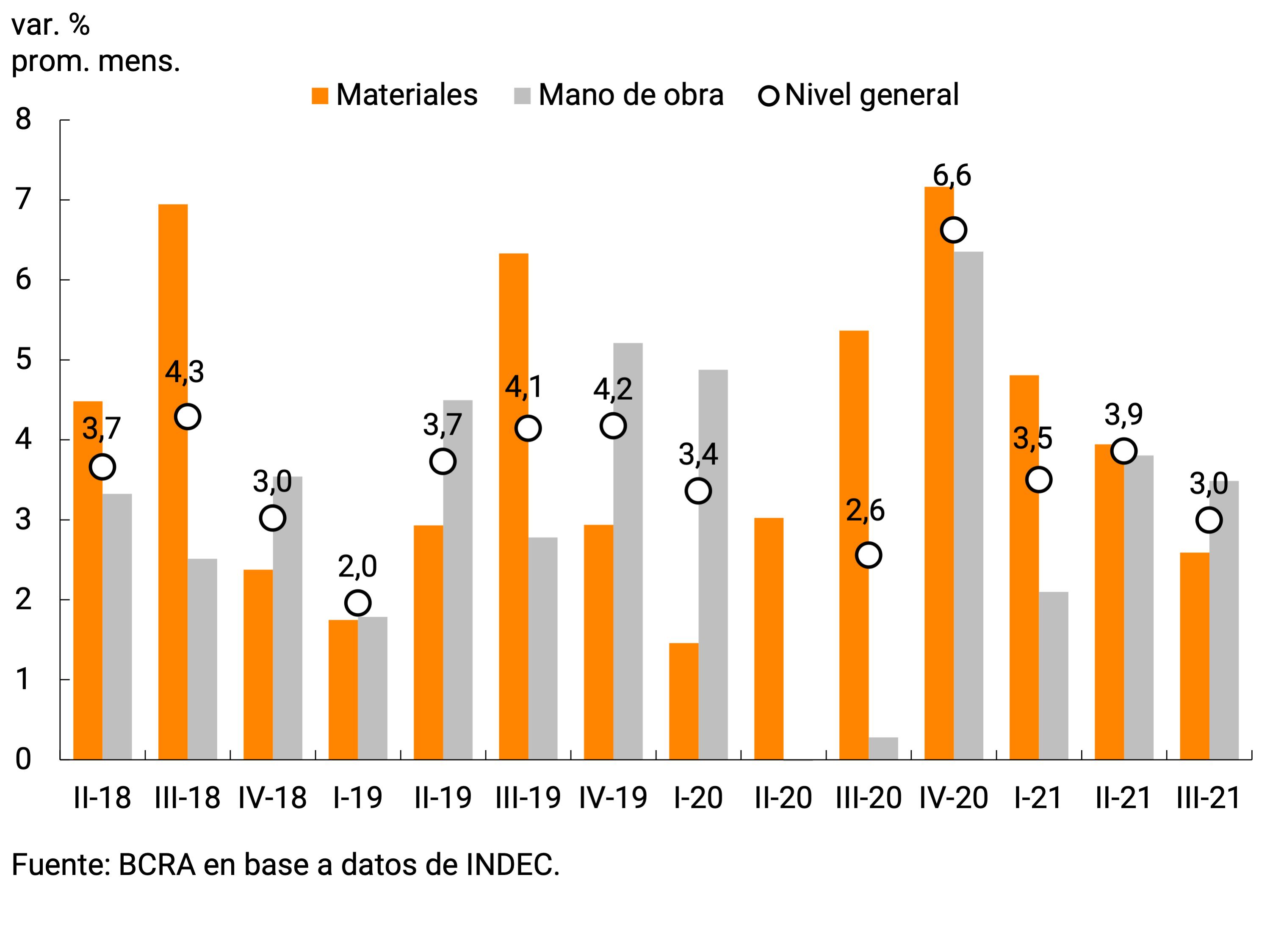 9 Con datos parciales a ago-21, la actividad de la construcción creció 0,9% trimestral s.e. La producción nacional de bienes de capital aumentó 6,1% trimestral s.e. según FIEL en tanto que las cantidades importadas de bienes de capital y equipo de transporte industrial cayeron 2,8% trimestral s.e.