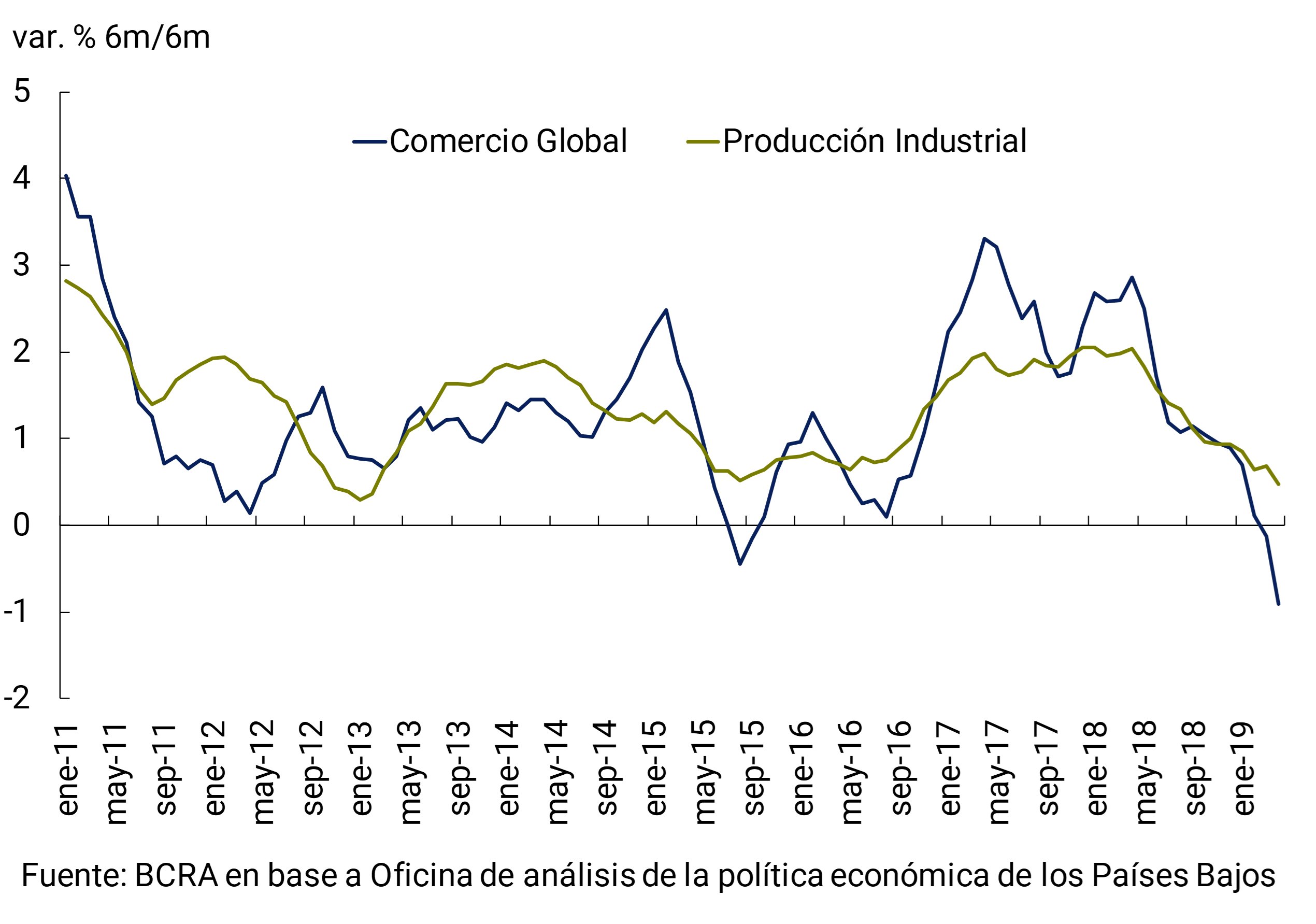 Durante los últimos meses continuaron los signos de desaceleración en la actividad económica mundial.1 En este sentido evolucionaron los datos más recientes de comercio global, que cayó un 2,3% s.e. desde el máximo de octubre de 2018, mientras que la producción industrial cayó un 0,2% s.e. en igual período (ver Gráfico 2.1).