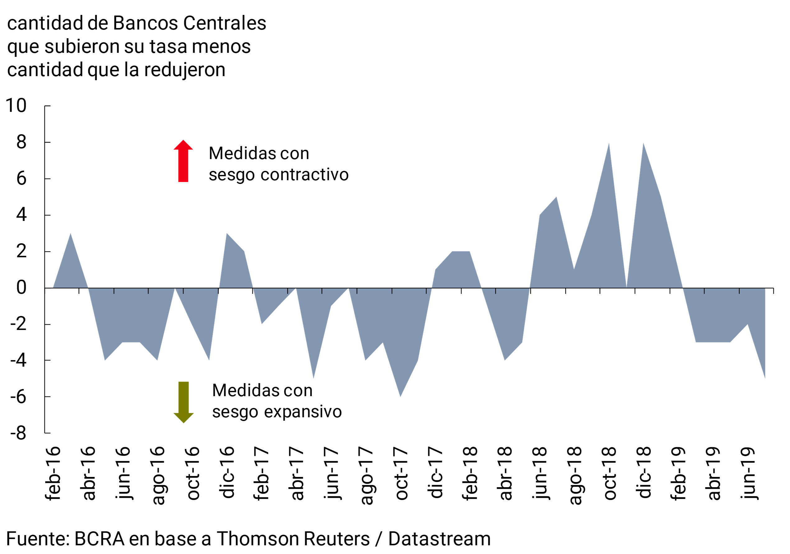 Las autoridades monetarias de las economías avanzadas están respondiendo a este escenario con un sendero de políticas más expansivas. Algo similar se observa en la mayoría de los países emergentes. En este contexto es factible que continúen mejorando las condiciones globales de liquidez para emergentes, siempre y cuando no sea mayor el efecto de la incertidumbre relacionada a las tensiones comerciales y geopolíticas, y que ello derive en un flight to quality.