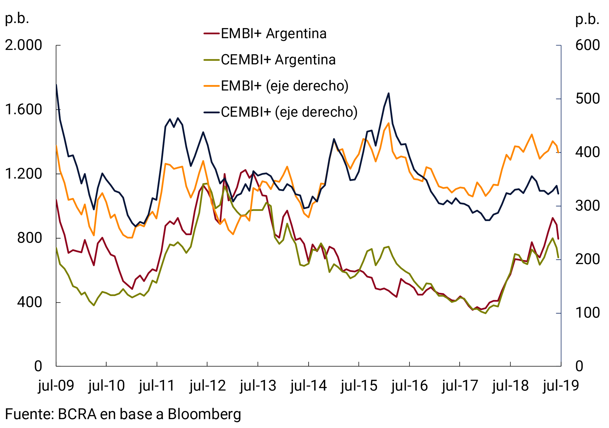 En este contexto, el diferencial de rendimiento exigido en los mercados secundarios para la deuda soberana argentina entre puntas se mantuvo casi sin cambios respecto del IPOM anterior, en torno a los 800 p.b., habiendo superado momentáneamente a principios de junio los 1.000 puntos, para luego caer más de 200 p.b. (ver Gráfico 2.11). En el trimestre no hubo nuevas colocaciones internacionales del soberano, debido a que dado el acuerdo con el Fondo Monetario Internacional y tal como surge del Programa Financiero, el Gobierno Nacional no tiene necesidad de acceder a estos mercados en lo que resta de 2019 y 2020.