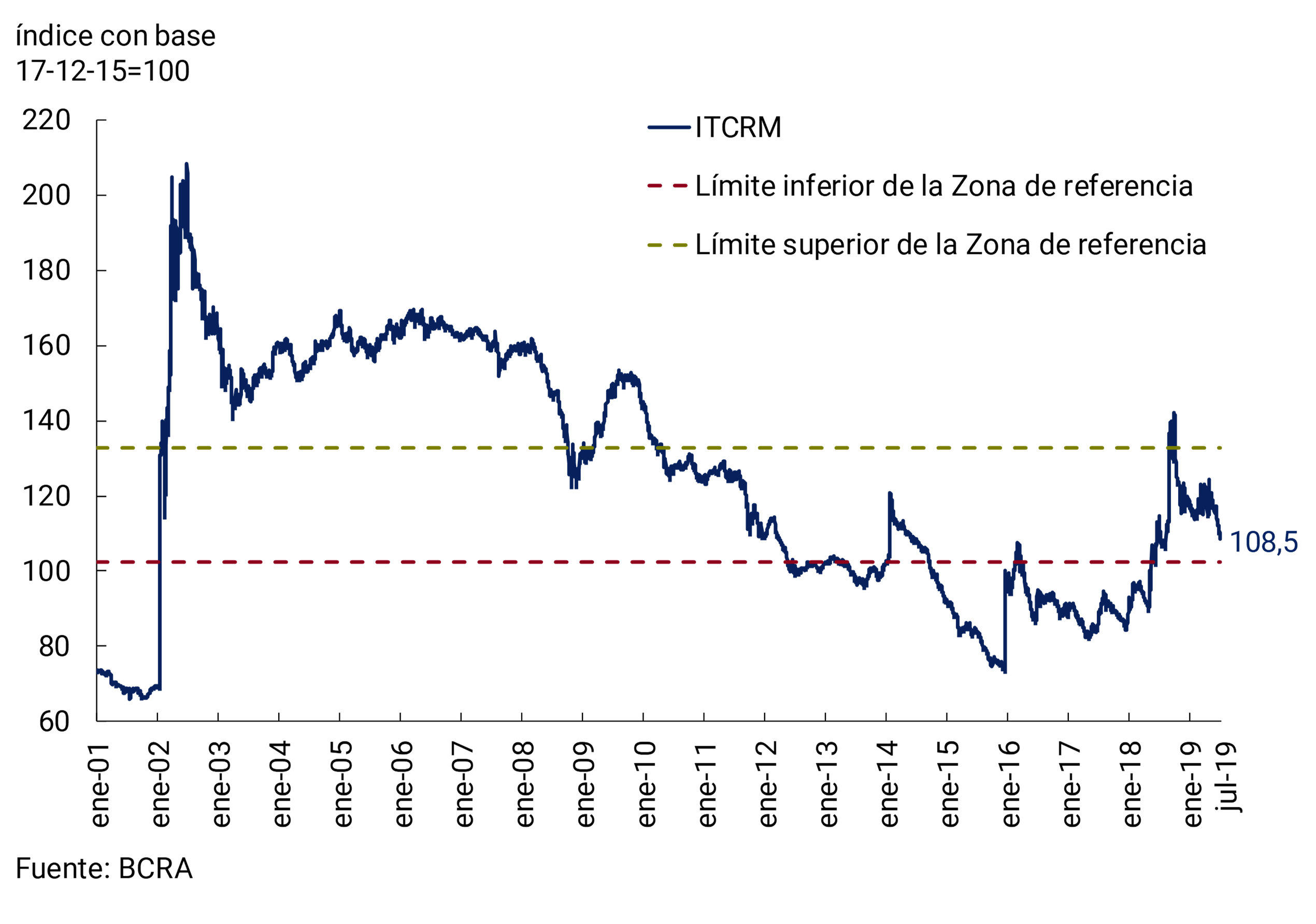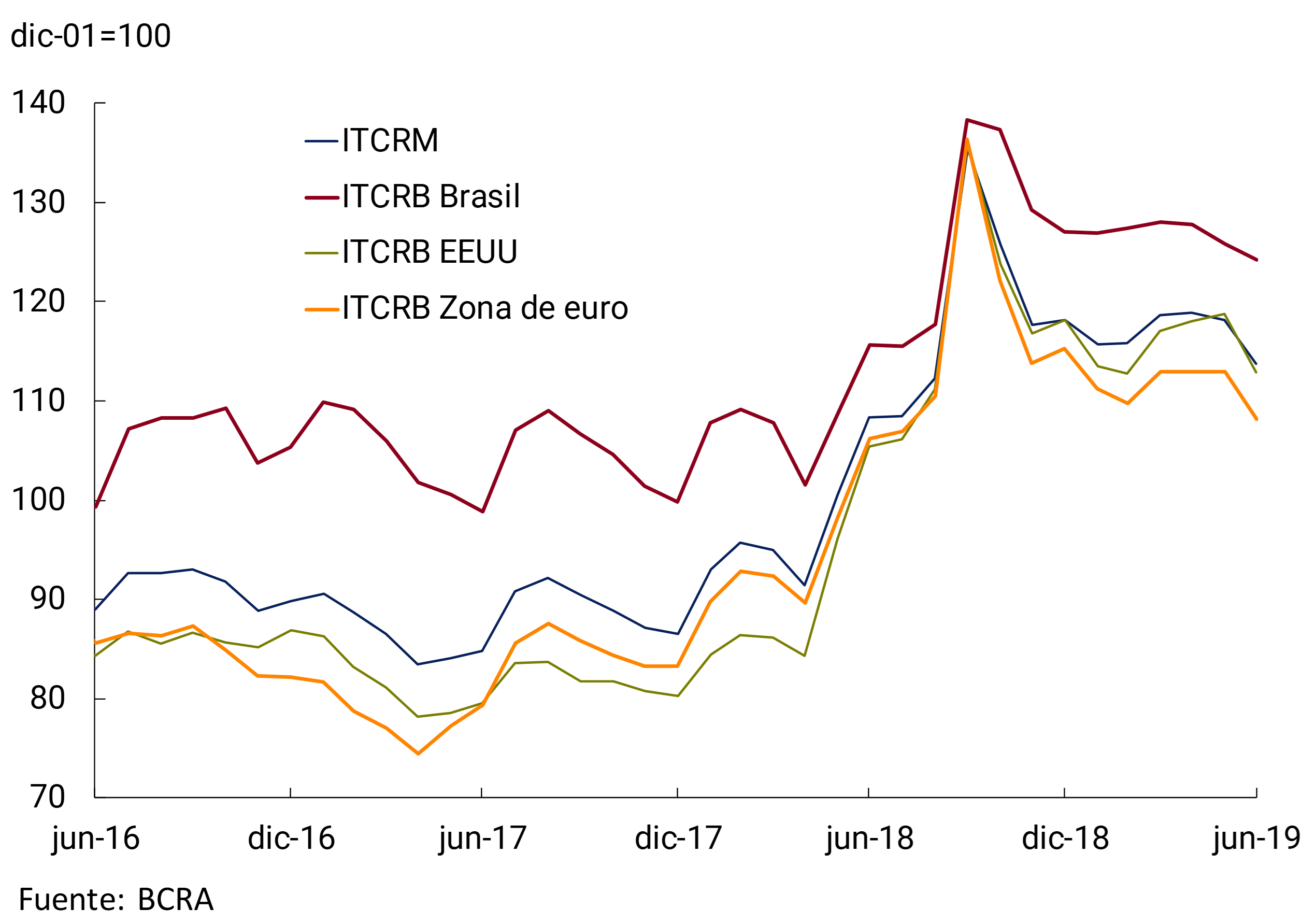 Tras registrar una evolución relativamente estable a lo largo del segundo trimestre, el Índice de Tipo de Cambio Real Multilateral (ITCRM) bajó en los últimos días de junio. De esta forma, a fines de junio se ubicó alrededor de 8% por debajo del nivel registrado a comienzos de abril, y retornó a niveles próximos a los de agosto de 2018. No obstante, se encuentra un 51% por encima del valor de noviembre de 2015 (ver Gráfico 2.12). La evolución del tipo de cambio nominal bilateral del peso argentino con el dólar acompañó el movimiento de las principales monedas latinoamericanas.