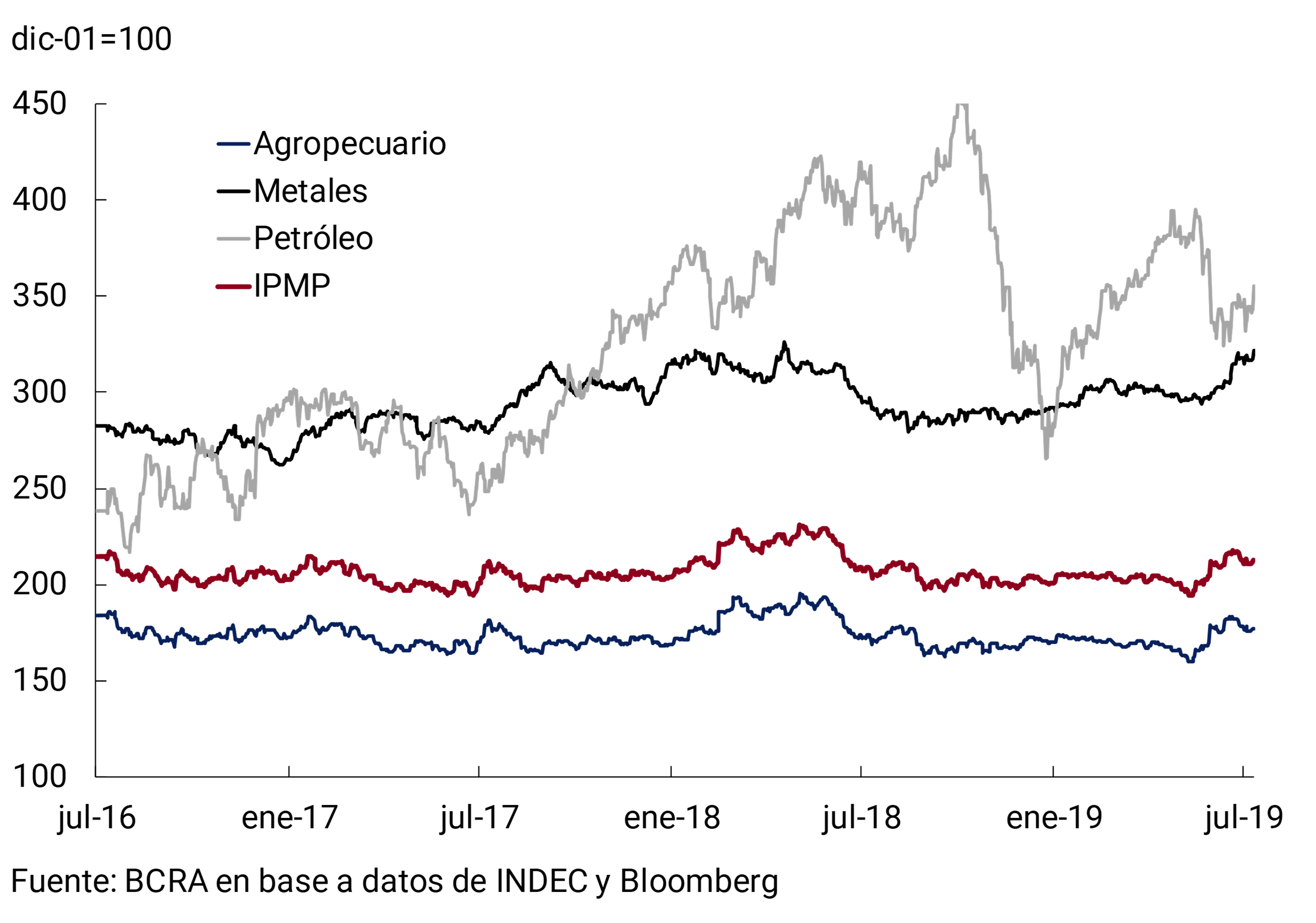 En el segundo trimestre del año los precios internacionales de las materias primas medidos en dólares5 subieron ligeramente con respecto al trimestre previo —fundamentalmente desde fines de mayo—, debido principalmente a la evolución del agrupado de las materias primas agropecuarias y de los metales, mientras que los valores del petróleo crudo cayeron en el margen. Desde fines de mayo, los valores internacionales de los productos agrícolas se vieron impulsados por el retraso de la siembra estadounidense de maíz y de soja debido al exceso de humedad en los suelos. De todas formas, durante el segundo trimestre las cotizaciones de los principales agrupados de materias primas se mantuvieron en promedio por debajo de los niveles que tenían en igual período de 2018, implicando una caída de 9% i.a. en el Índice de Precios de las Materias Primas (IPMP), el cual refleja la evolución de las principales materias primas de exportación de Argentina (ver Gráfico 2.13).