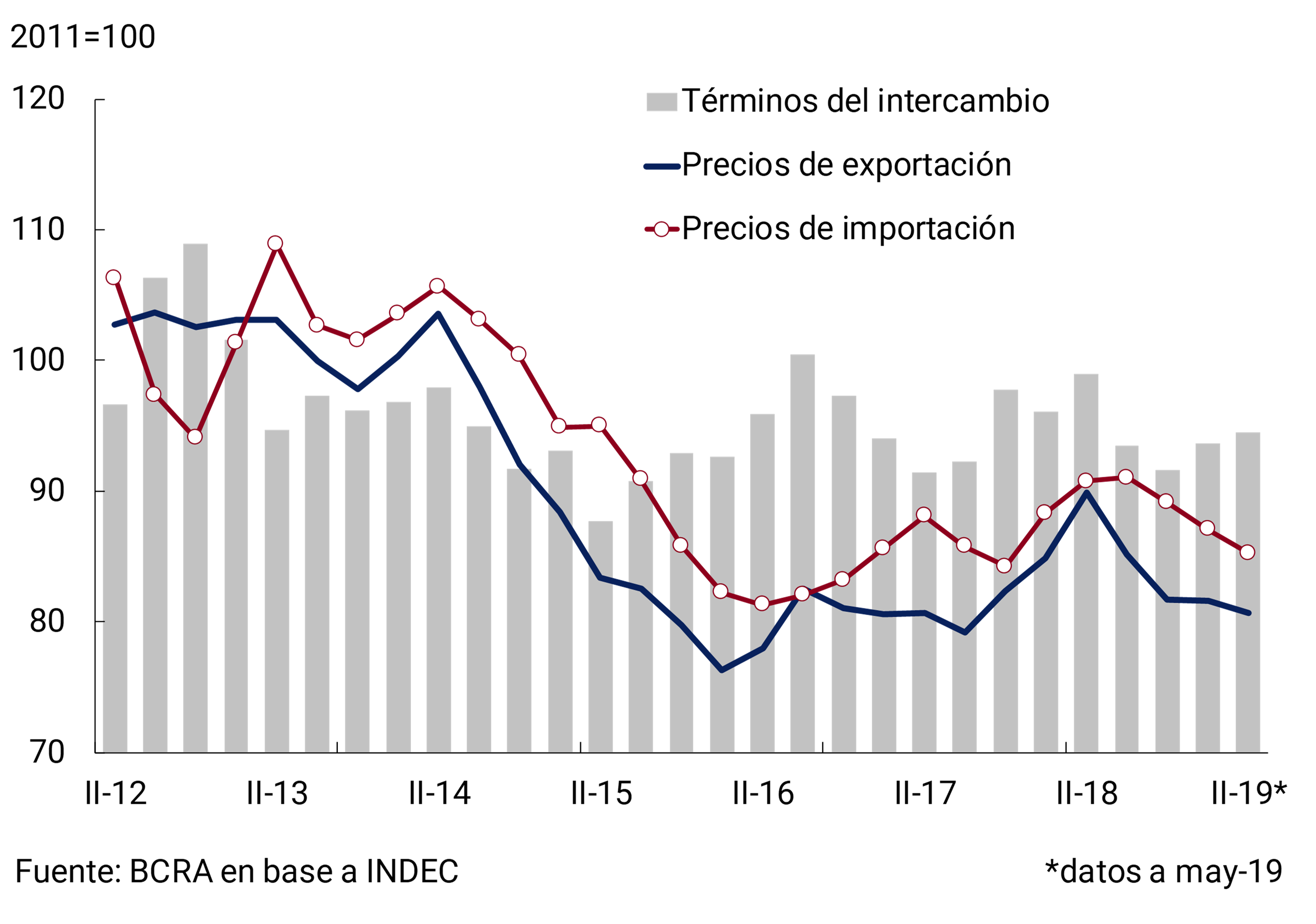 Los datos disponibles sobre el bimestre abril-mayo indican que se registró una caída de 1,2% en los precios de exportación de Argentina en relación con trimestre anterior debido fundamentalmente a la merma en las cotizaciones en dólares de los productos primarios en ese período (-6%). En tanto, los precios de importación mostraron una baja de 2,1% en igual período, con una fuerte incidencia de las reducciones en los precios en dólares de los bienes de capital importados y sus piezas. Como resultado, los términos de intercambio subieron ligeramente (0,9%) y se mantuvieron en torno al nivel promedio de los últimos 3 años (ver Gráfico 2.14). Se estima que a partir de junio los precios de exportación habrían comenzado a reflejar las mayores cotizaciones internacionales de los principales productos agrícolas.