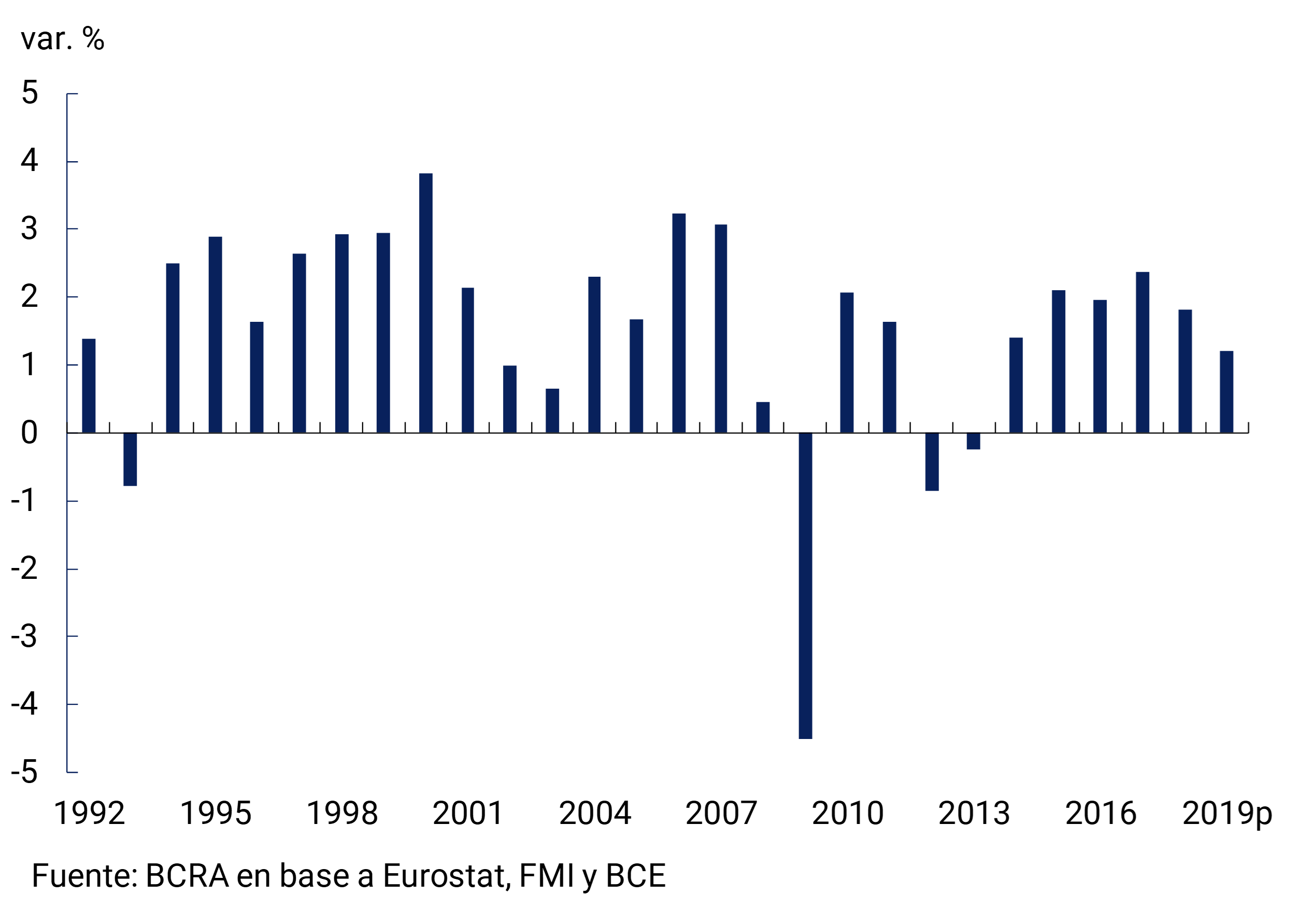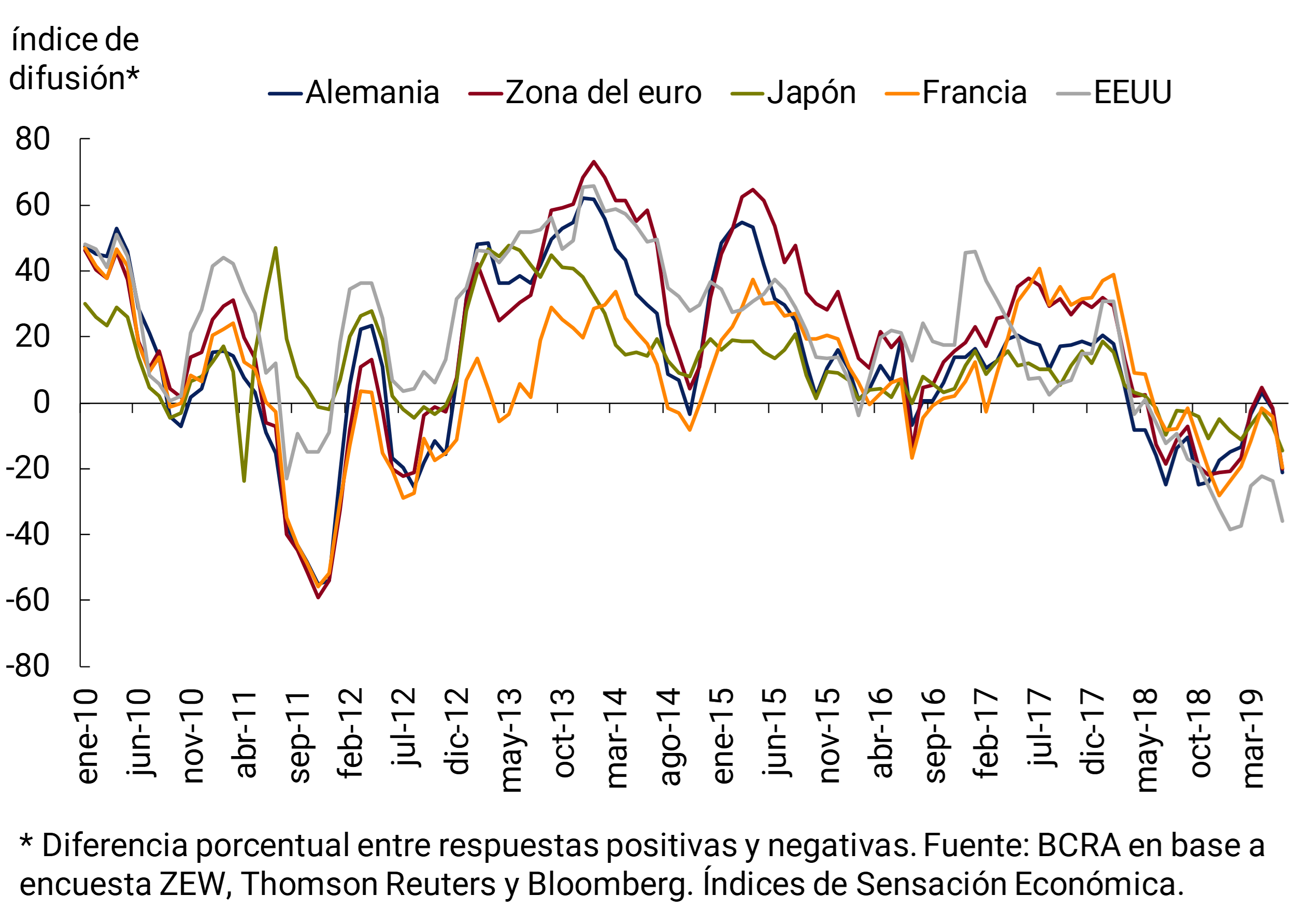 En la zona del euro, en el primer trimestre la actividad económica tuvo un desempeño mejor que el esperado por el consenso del mercado (0,3%), con un crecimiento de 0,4% s.e. Esto se habría debido a factores puntuales, como la demanda excepcional de bienes de la zona del euro por parte del Reino Unido (vinculada al posible Brexit). Además, tras la implementación de los Worldwide Harmonised Light Vehicle Test Procedures (WLTP)3 se observó —especialmente en Alemania— un aumento de la adquisición de vehículos. Por otro lado, se registró en el trimestre un mayor consumo privado debido a medidas de impulso fiscal que entraron en vigencia a principio de año, y cuyo mayor impacto estaría concentrado en el primer trimestre. Por último, mejores condiciones climáticas que en el trimestre previo permitieron un incremento de la actividad de la construcción en algunos países.