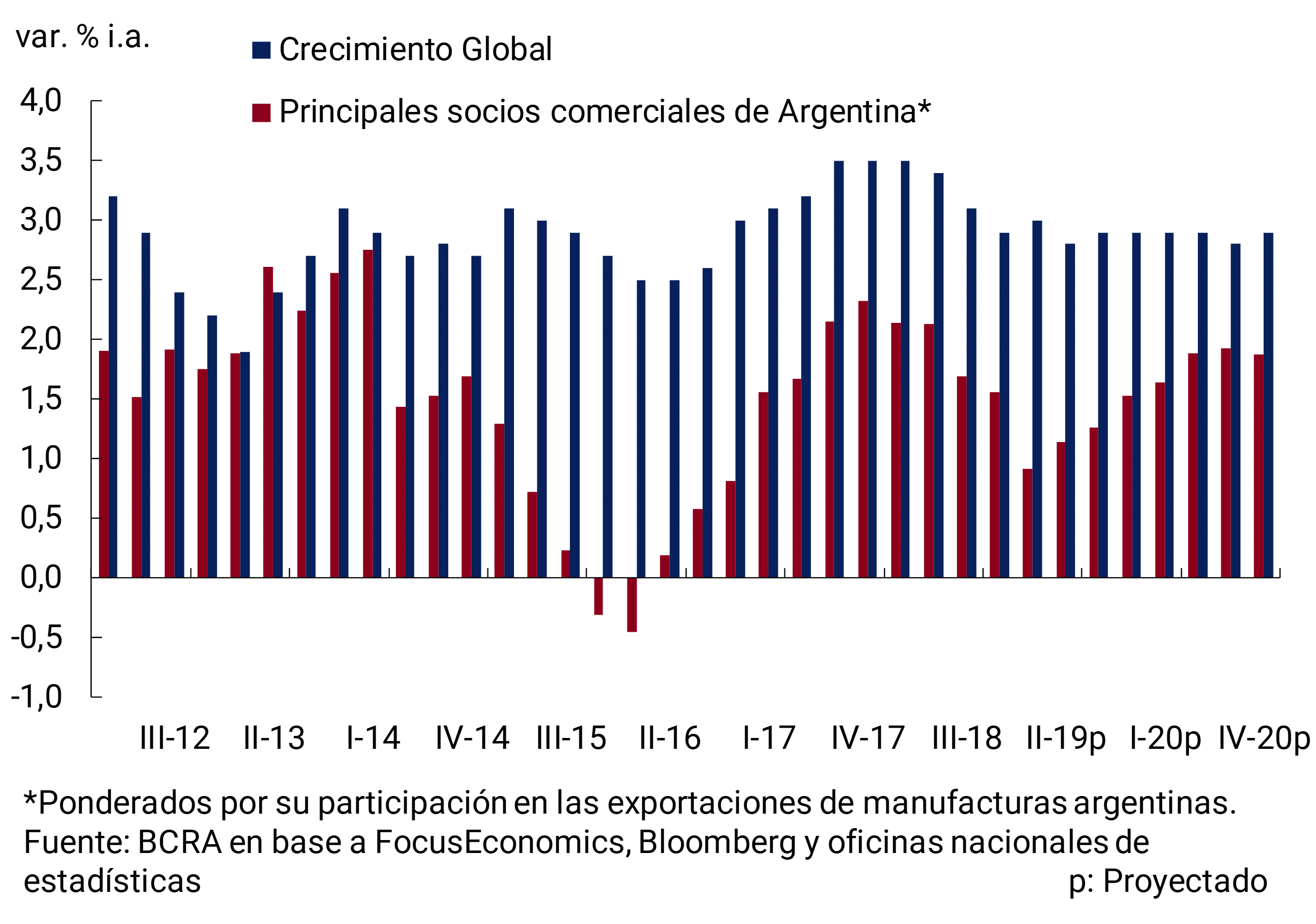 En lo que va de 2019 continuó la desaceleración del nivel de actividad mundial que se había empezado a observar a fines de 2018, extendida ahora a las principales economías desarrolladas y emergentes. Como resultado, el crecimiento esperado para los principales socios comerciales de Argentina pasó de ser el mayor de los últimos seis años en enero de este año (2,2% promedio esperado para 2019), a ser el menor de los últimos cuatro años (1,2% promedio esperado para igual período) según las proyecciones más recientes. Esto se debe principalmente a que disminuyeron marcadamente las proyecciones de crecimiento para Brasil.