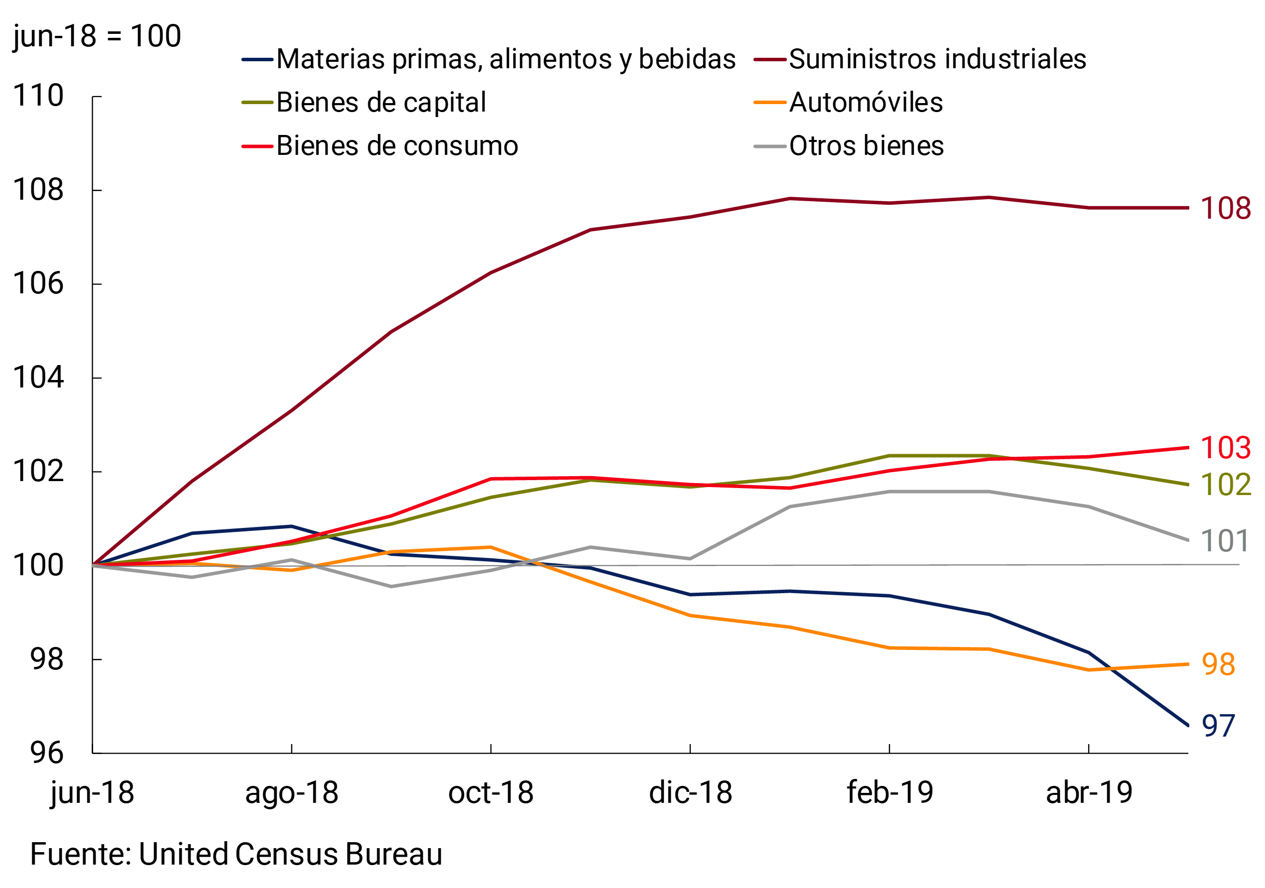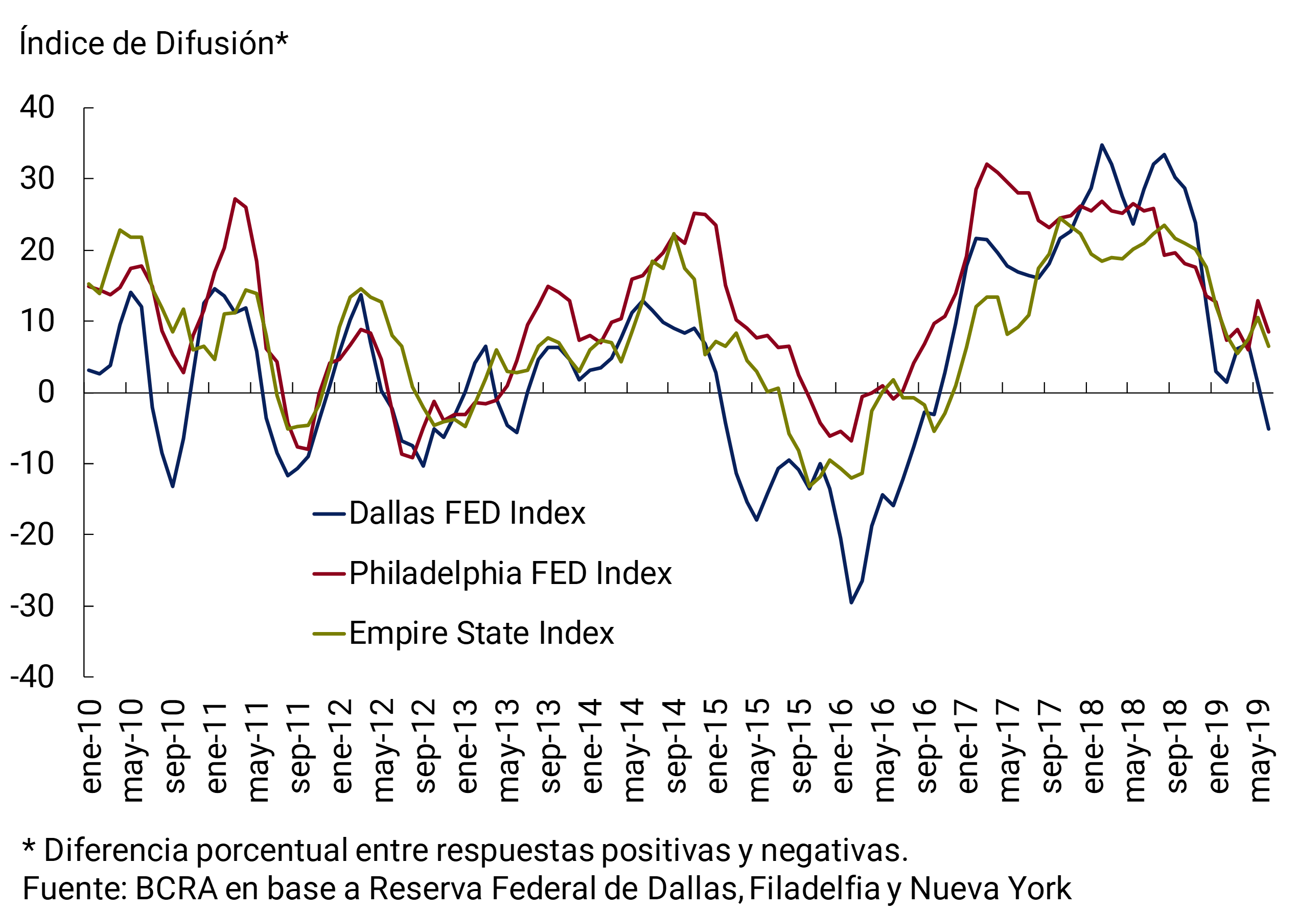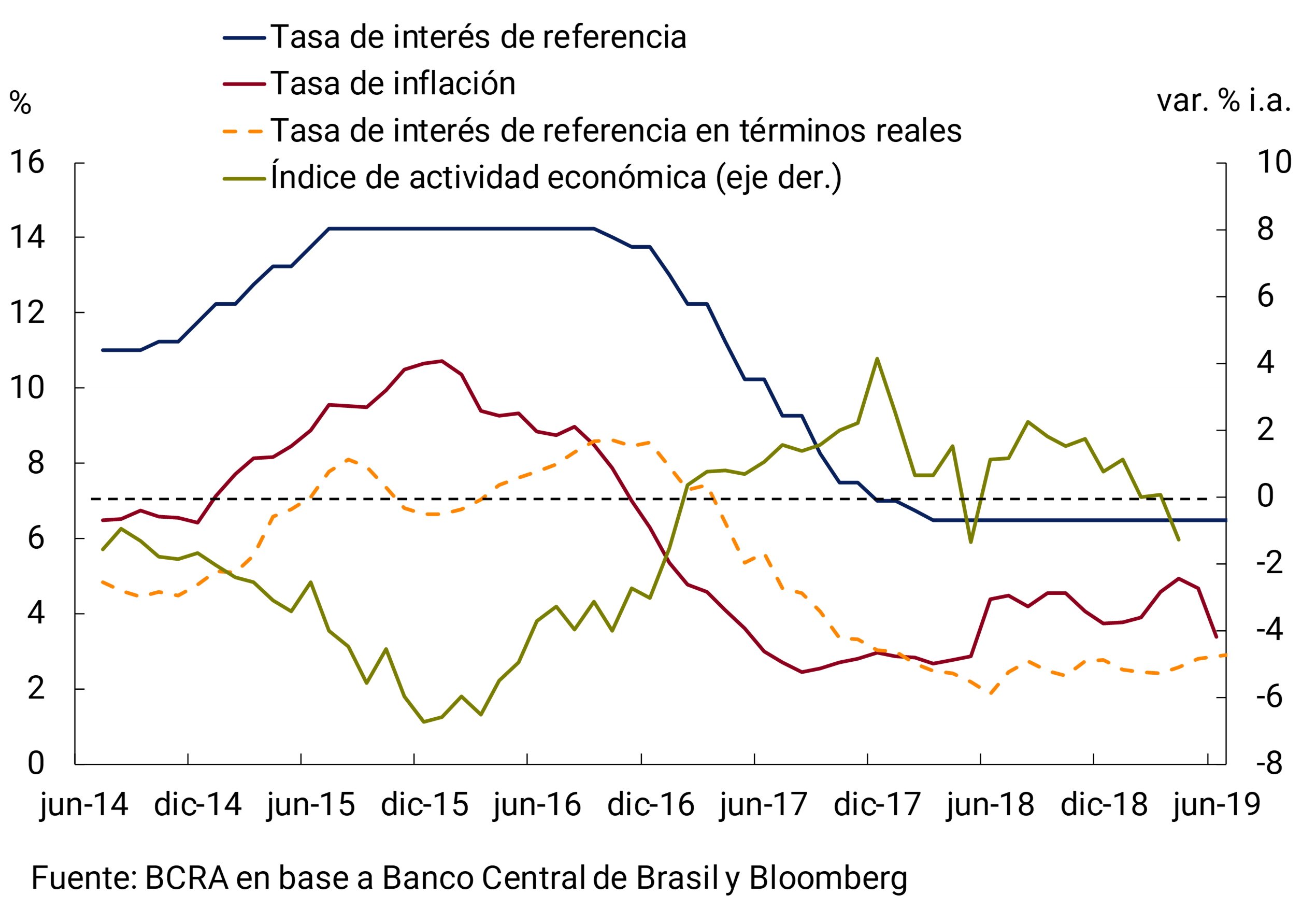 Gran parte de la disminución de las expectativas de crecimiento de nuestros socios comerciales está vinculada al peor desempeño esperado de Brasil. El crecimiento de este país fue negativo en el primer trimestre en 0,2% s.e. (respecto del trimestre previo) principalmente por la performance de la inversión y de las exportaciones. En igual sentido, los datos de actividad mensuales medidos por el estimador IBC-Br del Banco Central de Brasil (BCB) mostraron en los primeros cuatro meses del año tasas de variación negativas. Por otro lado, las estimaciones más recientes de la encuesta Focus del BCB prevén un crecimiento para 2019 de 0,8% i.a., 1,2 p.p. menor que el crecimiento que se preveía en abril. La menor demanda externa debido al menor nivel de actividad global esperado, las incertidumbres políticas locales, y las reformas fiscales son factores que impactan negativamente en el crecimiento brasileño de 2019.