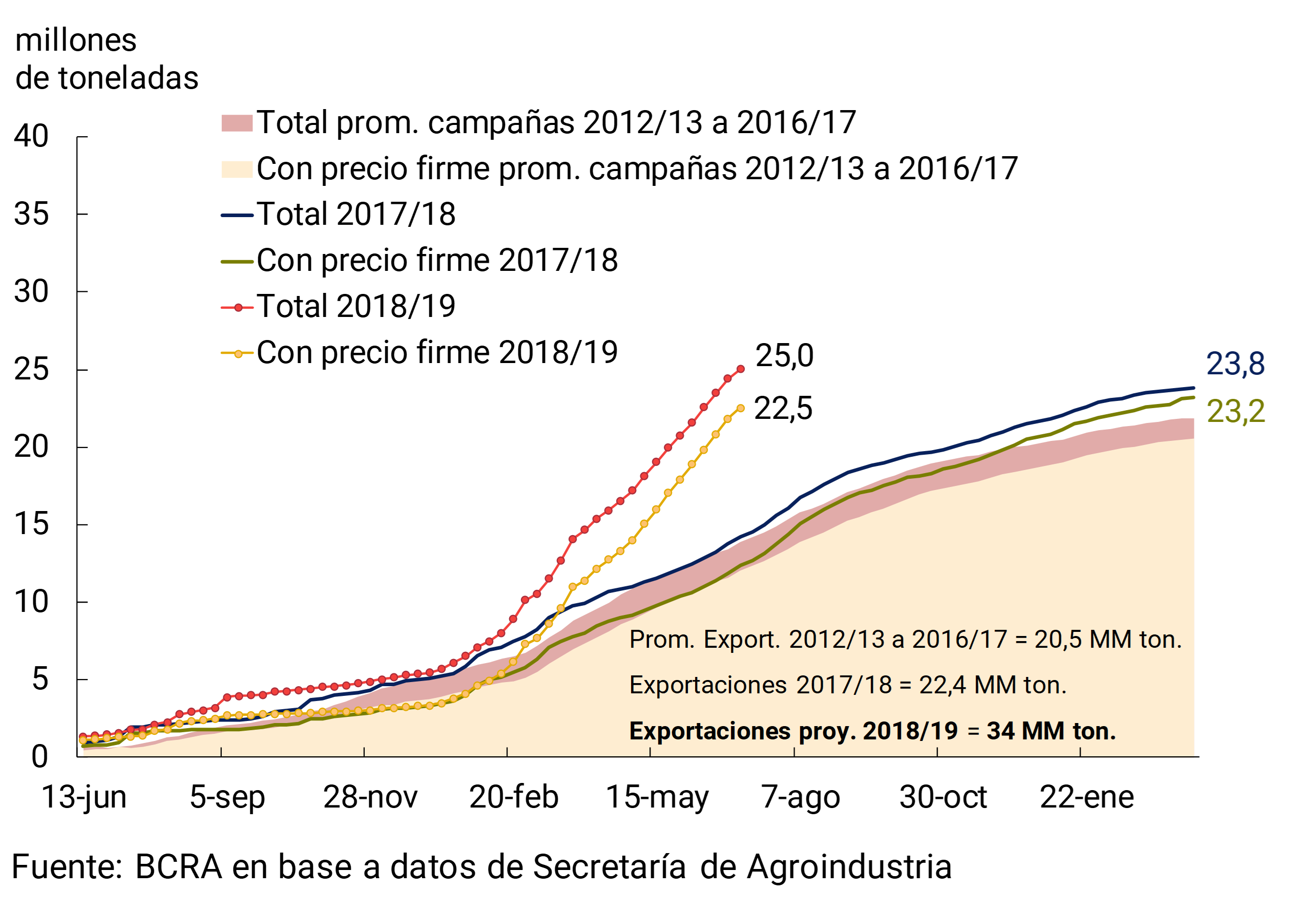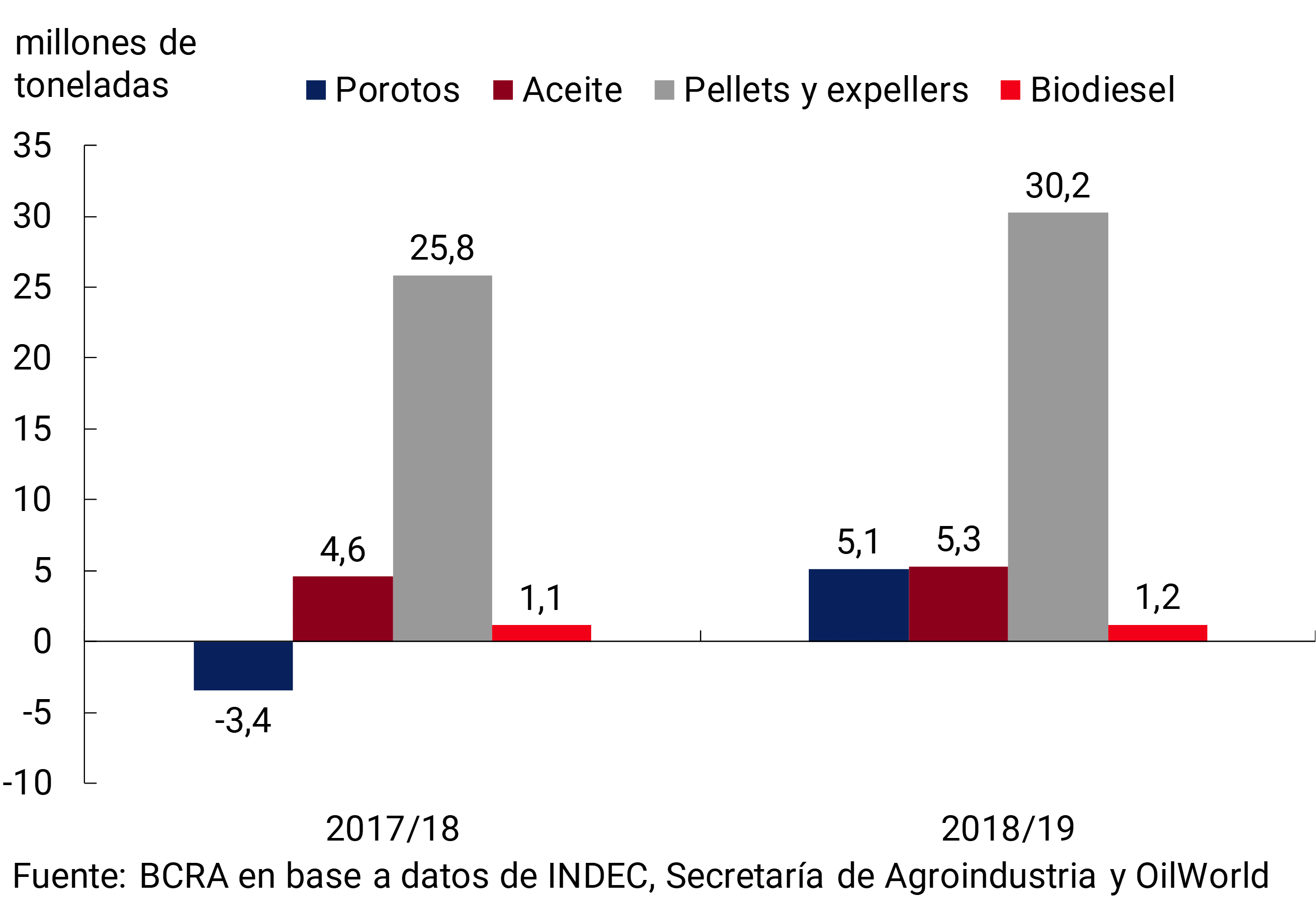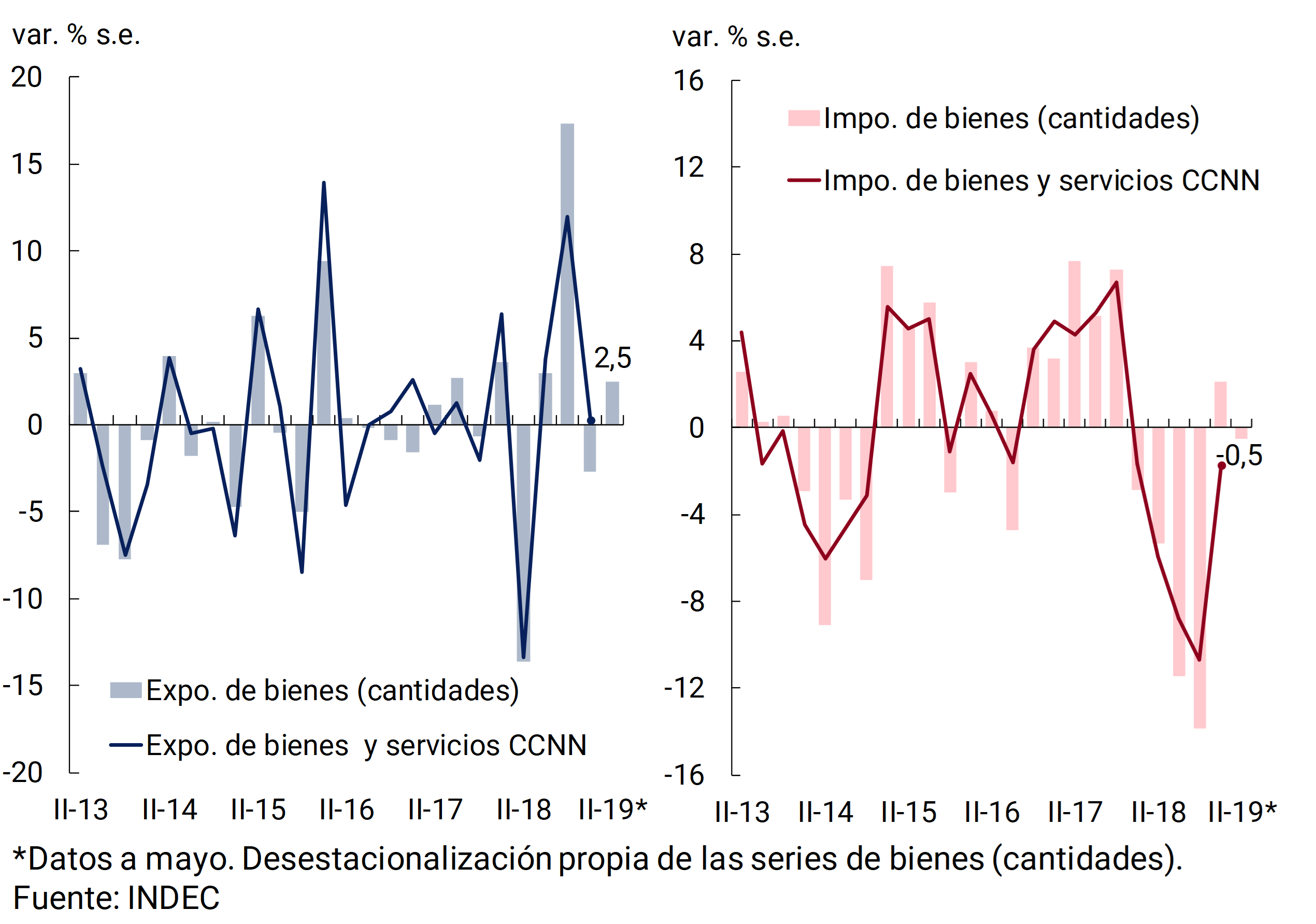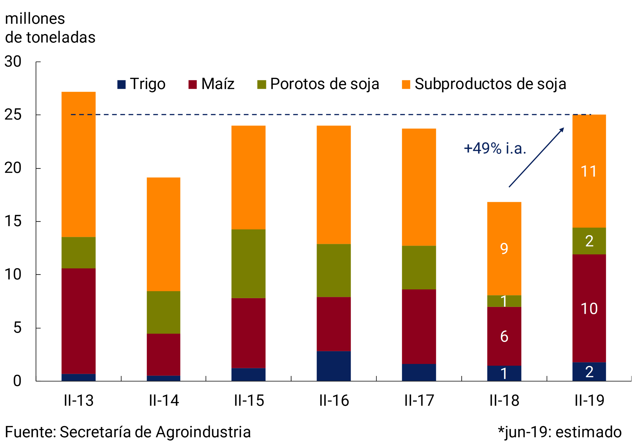 Para lo que resta del año se espera que las exportaciones continúen siendo traccionadas fundamentalmente por el sector agrícola. Luego de una cosecha récord, en el segundo semestre se concretaría el 73% de las exportaciones de porotos de soja, el 60% de las ventas de subproductos y el 44% de los envíos de maíz estimados para 2019 (ver apartado Cosecha Agrícola). Por su parte, se estima que, luego de haber encontrado un piso en marzo, las importaciones consoliden una reactivación, en la medida que lo demande la actividad económica.