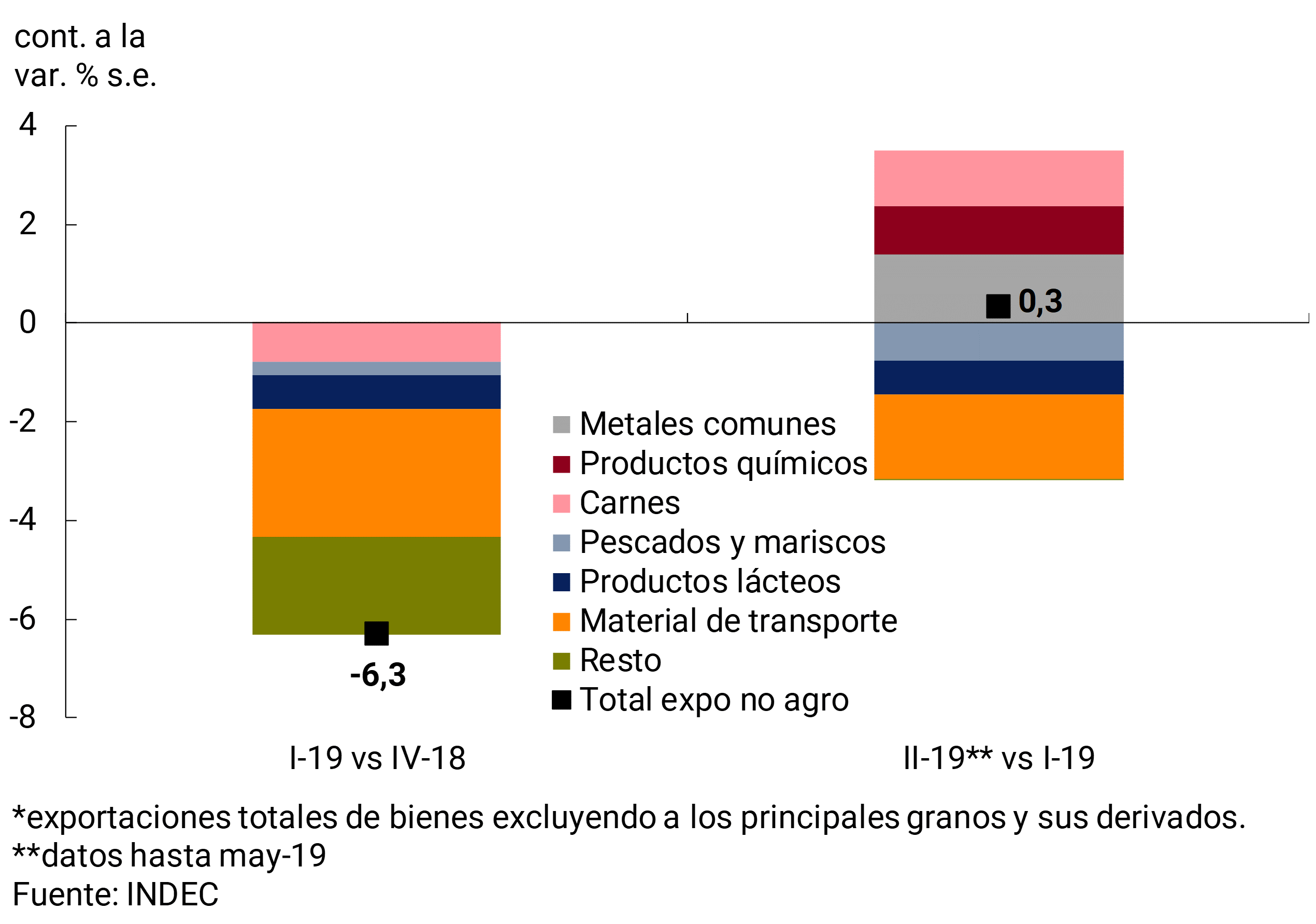 En el período abril-mayo de este año las exportaciones no agrícolas se elevaron apenas un 0,3% s.e. luego de un negativo primer trimestre en el que cayeron de forma difundida. De todas maneras, se ubicaron 1,7% por encima del año pasado y acumulan una suba desestacionalizada de 27% respecto del mínimo de dic-15. Los sectores que mostraron una recuperación de las exportaciones durante el segundo trimestre respecto al anterior fueron: metales comunes (22% s.e.; 27% i.a.), carn es (19% s.e.; 33% i.a.) y productos químicos (10% s.e., 2% i.a.). Por el contrario, las ventas externas de material de transporte terrestre, de productos lácteos y de pescados y mariscos se redujeron por segundo trimestre consecutivo y se ubicaron en niveles inferiores a los del mismo período de 2018 (ver Gráfico 3.11).