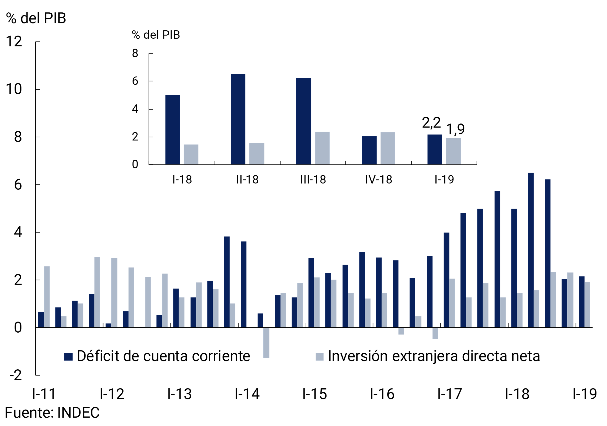 De esta evolución de los flujos comerciales de bienes en el segundo trimestre se desprende la continuidad del proceso de corrección de las cuentas externas de la economía argentina que comenzó en el segundo semestre de 2018. La suba del tipo de cambio real durante 2018 permitió que por primera vez desde 2014 la economía argentina inicie el año con un déficit de cuenta corriente desestacionalizado y anualizado en torno al 2%, un nivel similar a los ingresos netos anuales de inversión extranjera directa que recibe Argentina (ver Gráfico 3.12).