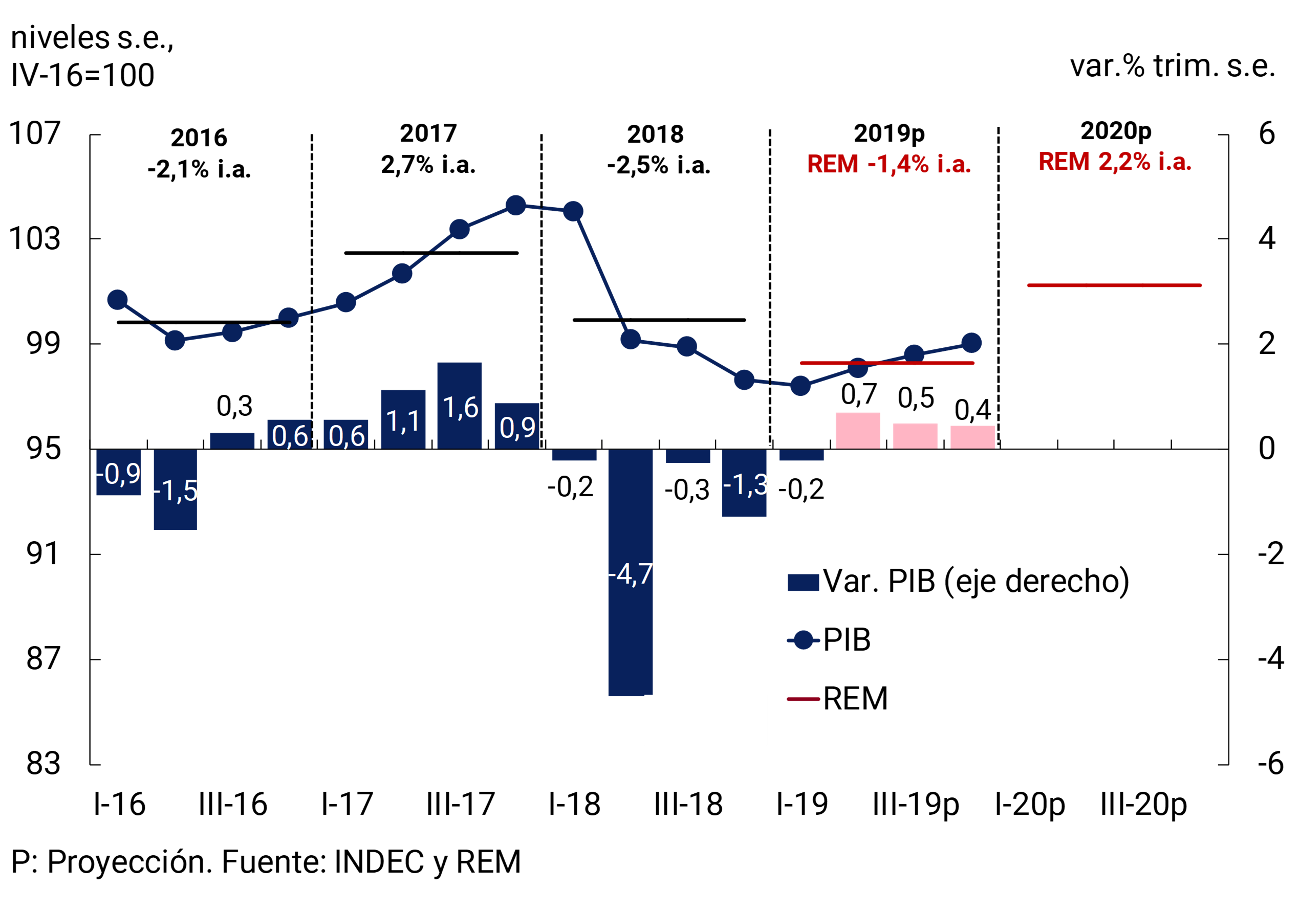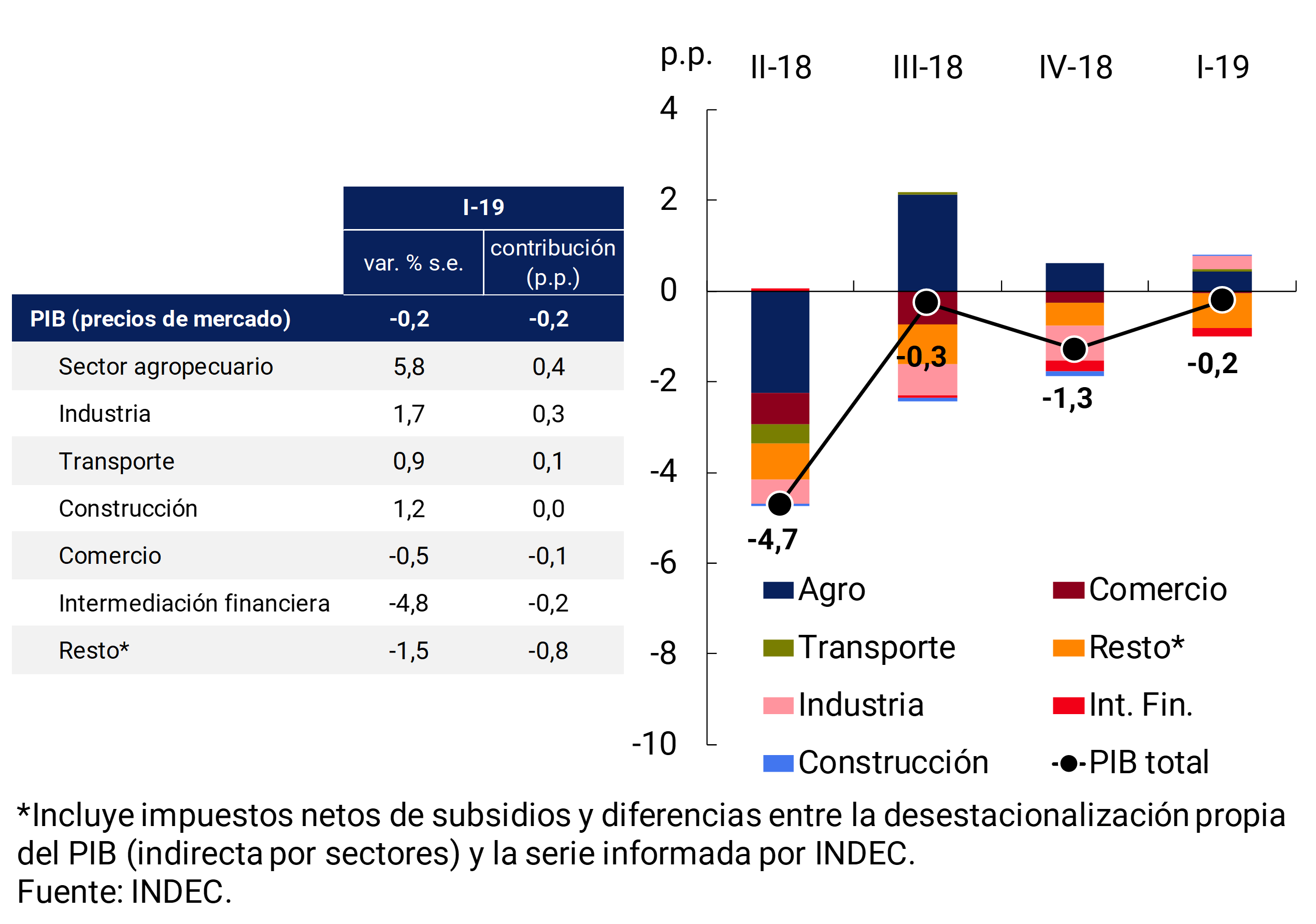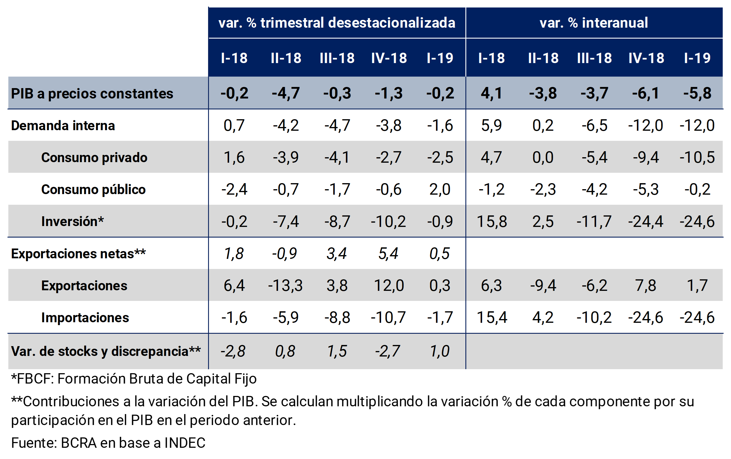 En el primer trimestre de 2019 el PIB se contrajo 0,2% trimestral s.e. y 5,8% respecto de igual período del año anterior. El resultado estuvo en línea con lo previsto por los analistas de mercado del REM de mayo y por debajo de lo esperado en la última Predicción Contemporánea del PIB (0,5% s.e; PCP-BCRA). La leve contracción del primer trimestre se explicó por una fuerte caída transitoria de la actividad en marzo, asociada a la mayor volatilidad cambiaria, que interrumpió la recuperación que había comenzado en diciembre.