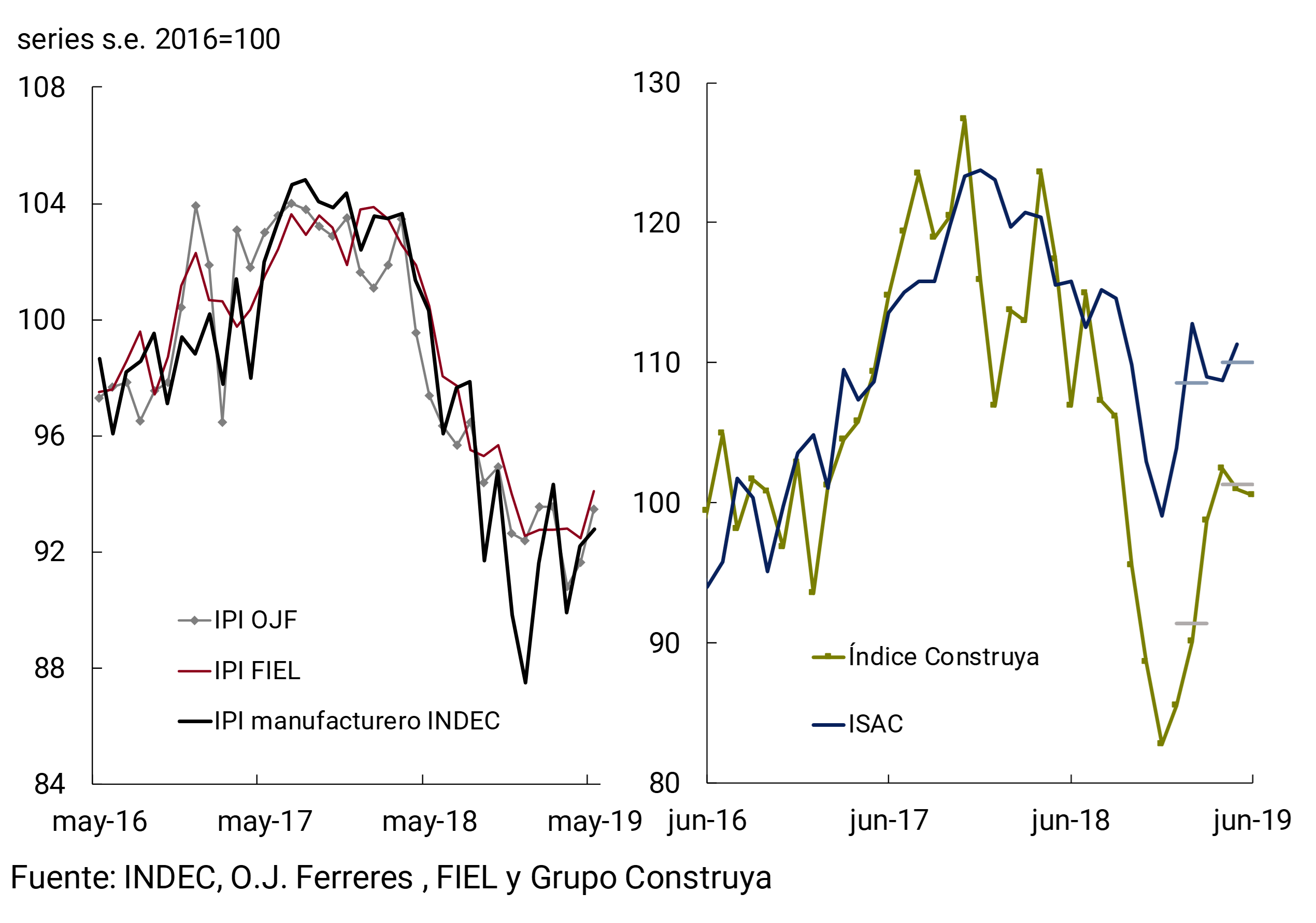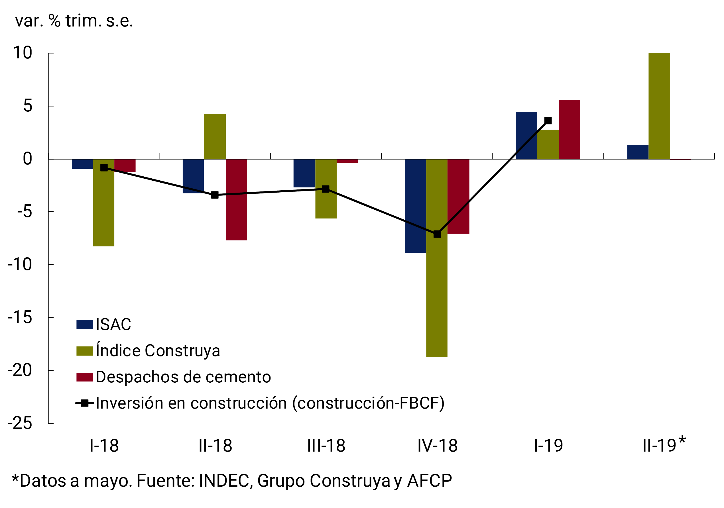 El buen desempeño de la construcción se explicó tanto por la reactivación de obras privadas como por el mayor ritmo de ejecución de obras públicas. El mayor dinamismo de las obras privadas se desprende de la evolución de los insumos típicamente utilizados en este tipo de construcciones, como Pisos y revestimientos cerámicos (+9,5% s.e. entre abril y mayo respecto del primer trimestre) y Yeso (+5,3% s.e. en el mismo lapso). En cuanto a la obra pública, según los datos de Construar15, los montos involucrados en los llamados a licitación pública (de los Estados nacional, provinciales y municipales) subieron 61% i.a. en términos nominales en el primer trimestre de 2019 cifra que deflactada por el Índice del Costo de la Construcción del INDEC significó un incremento de 11,1% i.a. en términos reales.
