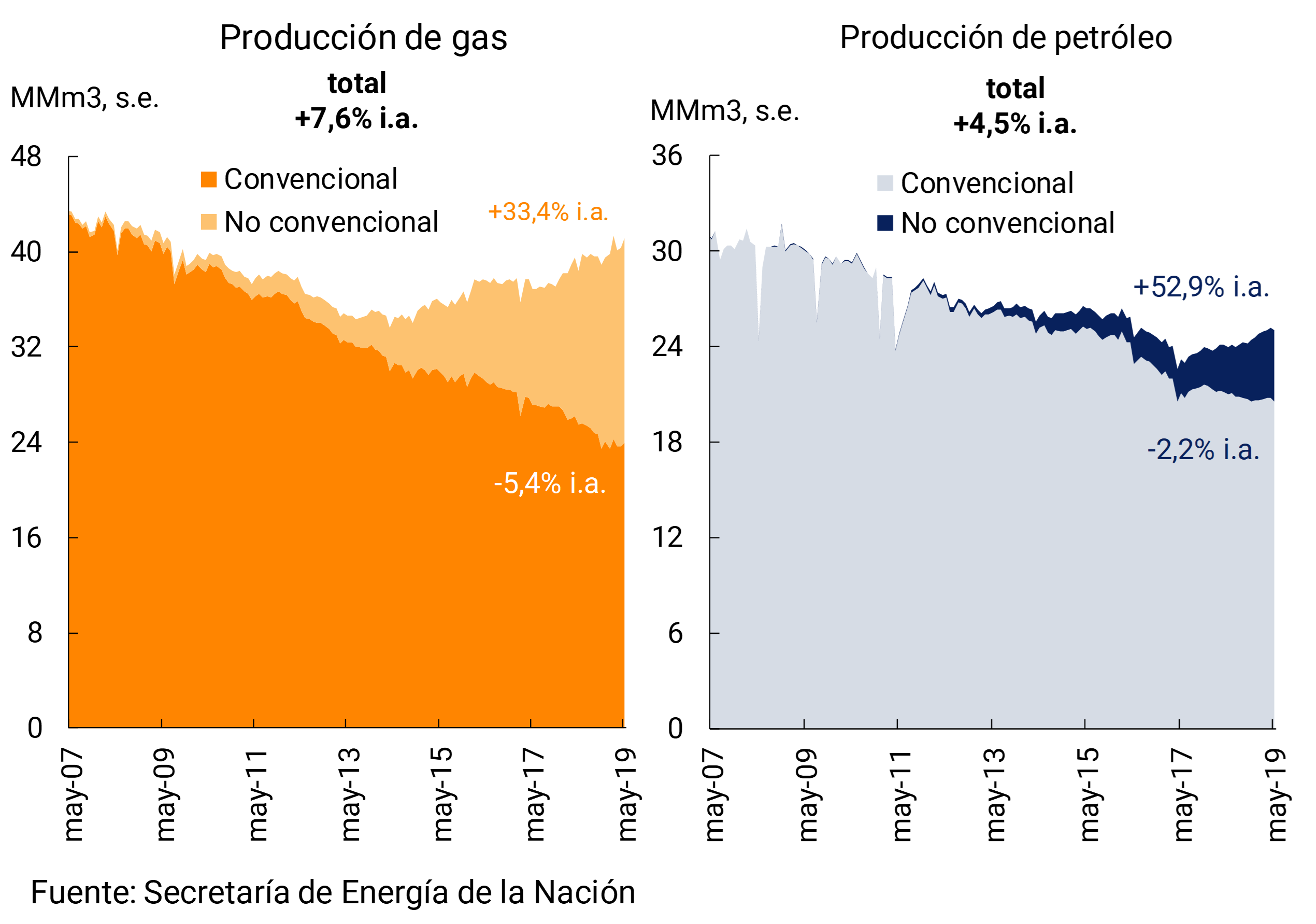El Grupo 2 —Explotación de minas y canteras, Administración pública y Transporte— se compone de sectores que se recuperaron desde fines del año pasado y que, de continuar con la tendencia reciente, podrían crecer en términos interanuales durante el segundo trimestre de 2019. La producción de petróleo (+4,5% i.a. en mayo) y gas (+7,6% i.a. en mayo) lidera al sector de Explotación de minas y canteras con un efecto multiplicador sobre otros sectores económicos. La extracción de petróleo y gas no convencionales —provenientes del yacimiento Vaca Muerta— creció 52,9% i.a. y 33,4% i.a. respectivamente, superando la merma de la producción de los pozos convencionales (ver Gráfico 3.15). El sector de Transporte viene recuperándose traccionado por el crecimiento del agro y el turismo, se espera que en mayo alcance una tasa de crecimiento interanual positiva de entre 1% y 2%. En el marco de un proceso de consolidación fiscal, el sector de Administración pública ha registrado un quiebre estructural desde 2016 creciendo a una tasa baja en términos históricos17. Entre diciembre de 2017 y agosto de 2018 acumuló una contracción de 1% y luego comenzó a recuperarse alcanzando en abril un leve crecimiento de 0,2% i.a.