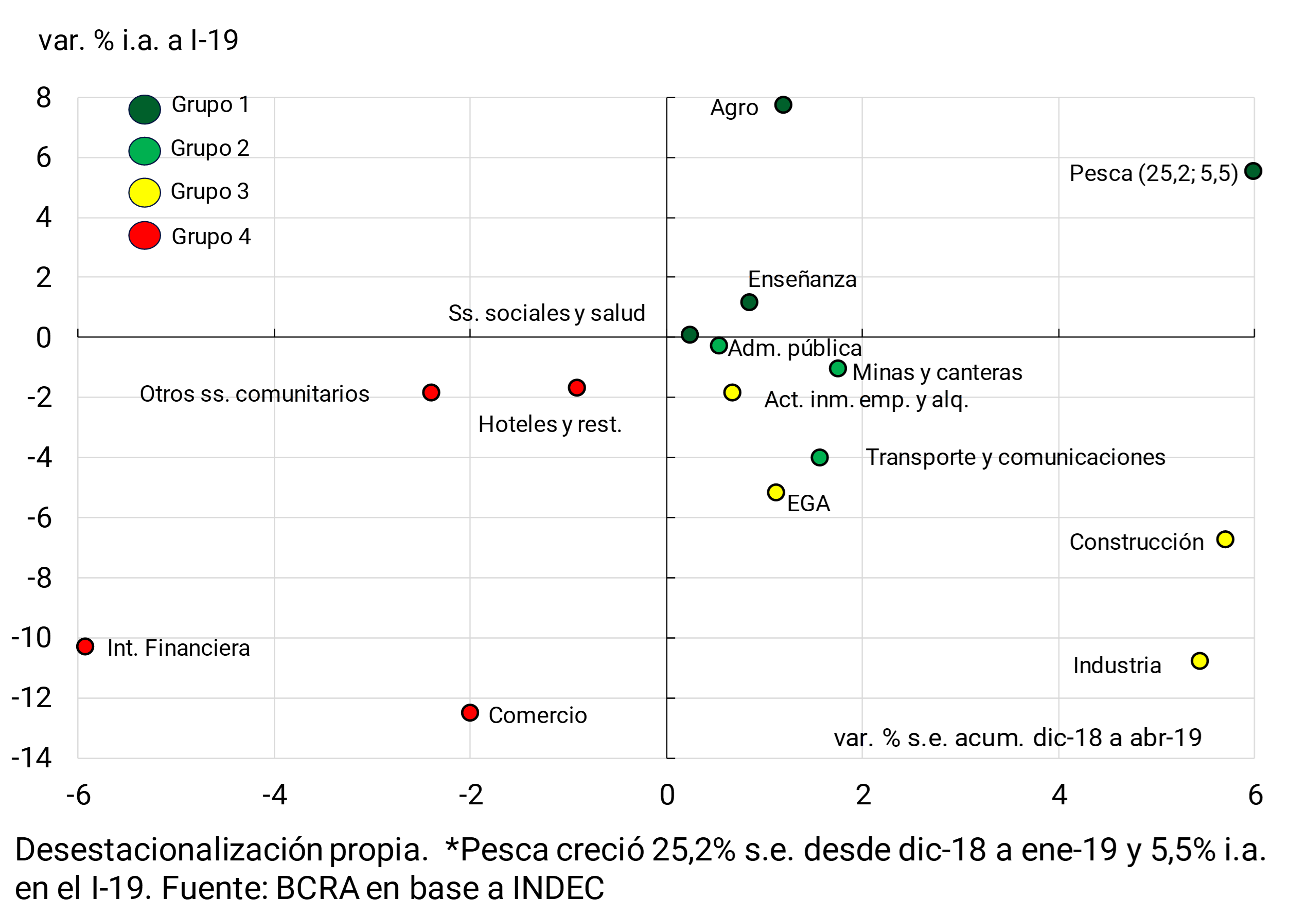 El Grupo 1 —Agropecuario, Pesca, Enseñanza y Servicios sociales y de salud— está conformado por las actividades que vienen mejorando desde mediados de 2018 y que durante el primer trimestre de 2019 alcanzaron o superaron el nivel de igual período del año previo. El sector más relevante de este grupo es el Agropecuario, el cual rebotó en el tercer trimestre de 2018 (en términos desestacionalizados) luego de la caída originada por la sequía, y desde entonces continuó creciendo gracias a la buena cosecha de los principales cultivos (ver Apartado Cosecha Agrícola). Según datos del EMAE el producto agropecuario creció en abril 40,2% interanual. Por su parte, el producto de la Pesca no se vio afectado por la recesión y tuvo un buen desempeño en 2018 (5,4% i.a.). El crecimiento continuó durante los primeros meses de 2019 registrando en abril una suba interanual de 35%. En tanto, los servicios de Enseñanza y Salud se desaceleraron durante 2018 sin llegar a ingresar en una fase recesiva16.