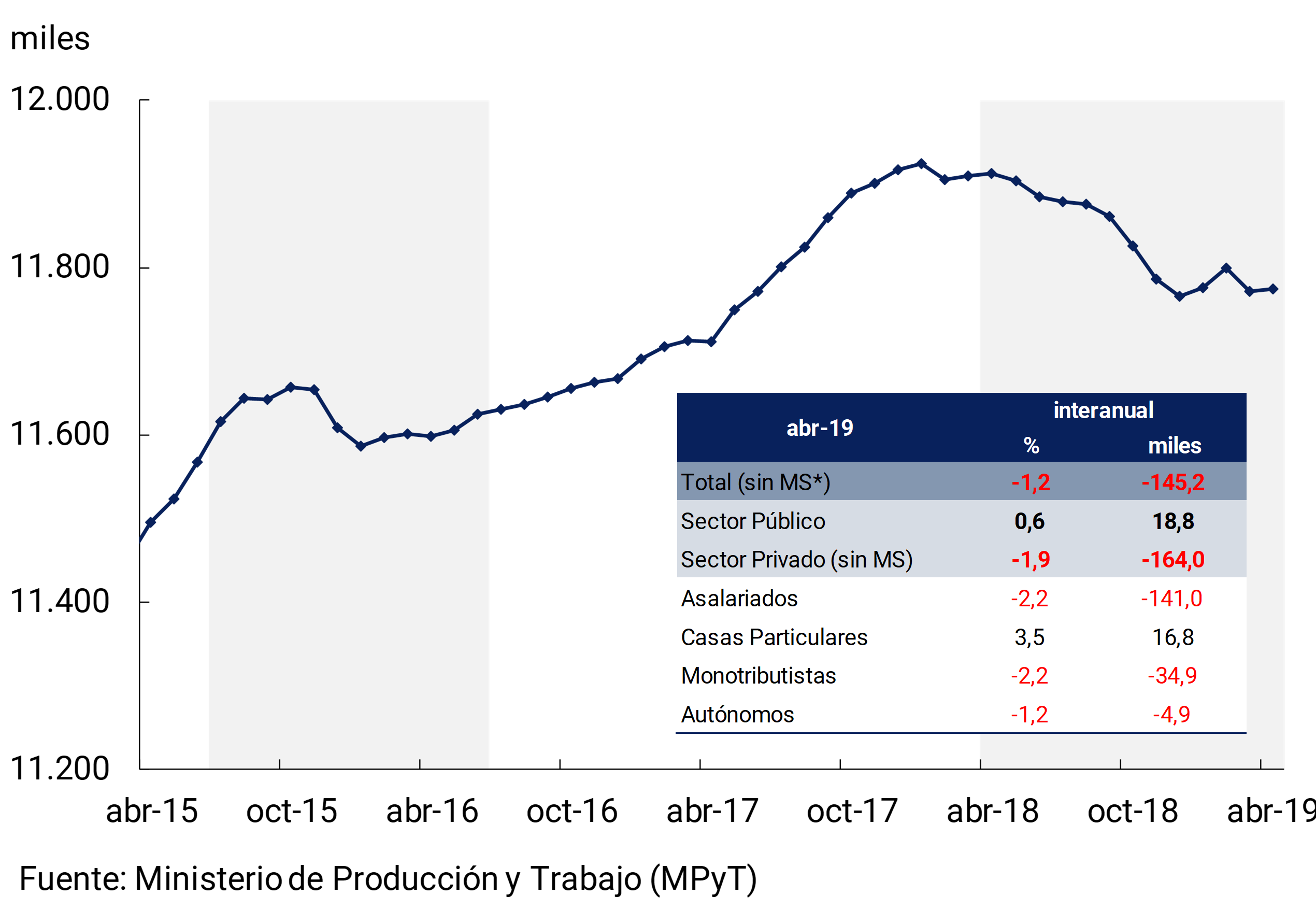 Según cifras de la EPH, durante el primer trimestre el sector informal y el empleo por cuenta propia siguieron compensando el impacto de la caída del empleo registrado. Ello posibilitó que la tasa de empleo exhiba una relativa estabilidad en el último año19. Este crecimiento del empleo no logró cubrir el de la oferta laboral, llevando a que la tasa de desempleo alcanzara 10,1% i.a. (1 p.p. interanuales).