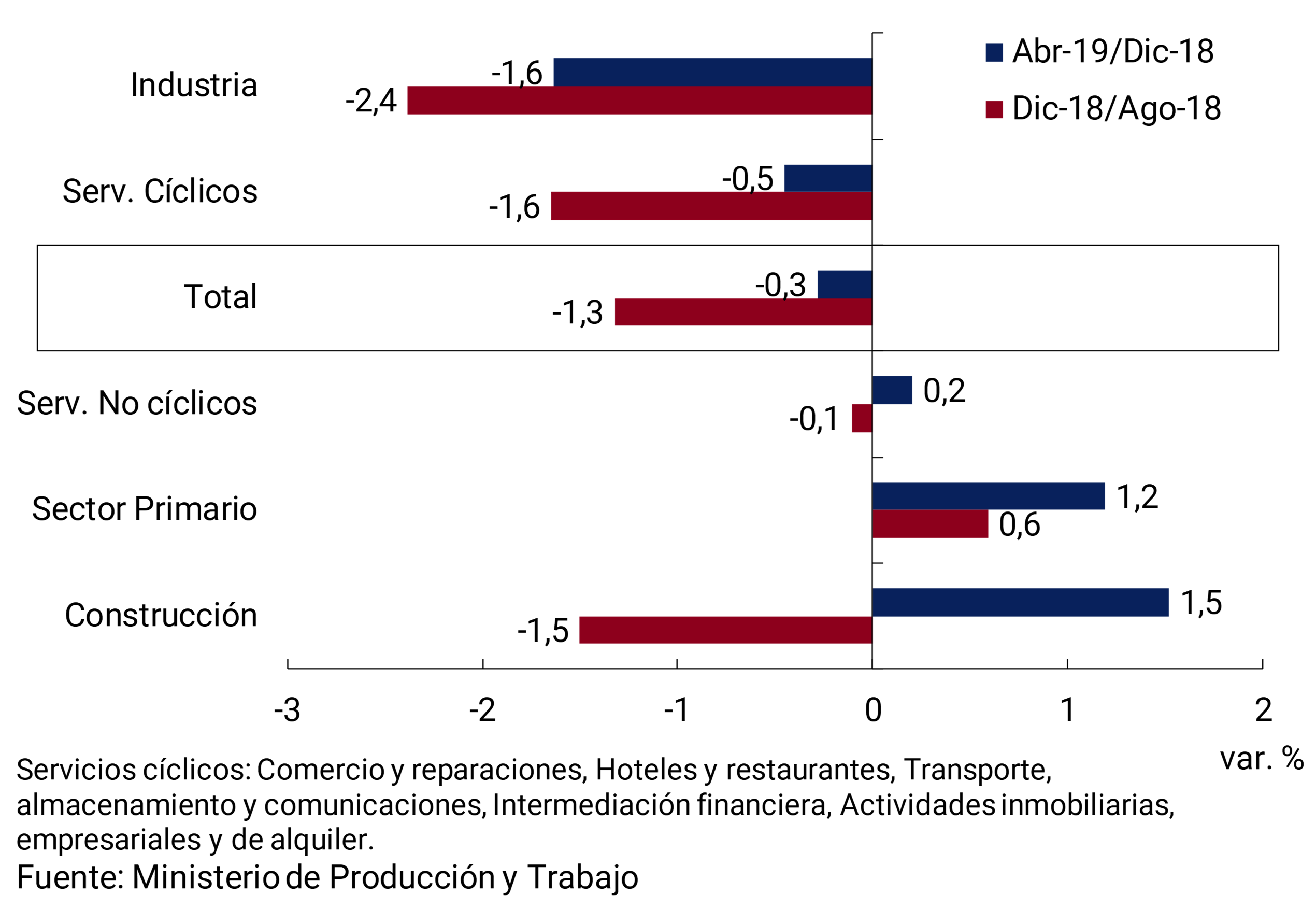 La leve caída de la economía durante el primer trimestre (-0,2% s.e.) se explicó por la caída transitoria de la actividad en marzo y se concentró en sólo cuatro de los dieciséis sectores del PIB. Un conjunto de importantes actividades —Agro, Industria, Construcción, Explotación de Minas y Canteras, y Transporte— crecieron con respecto al trimestre anterior.