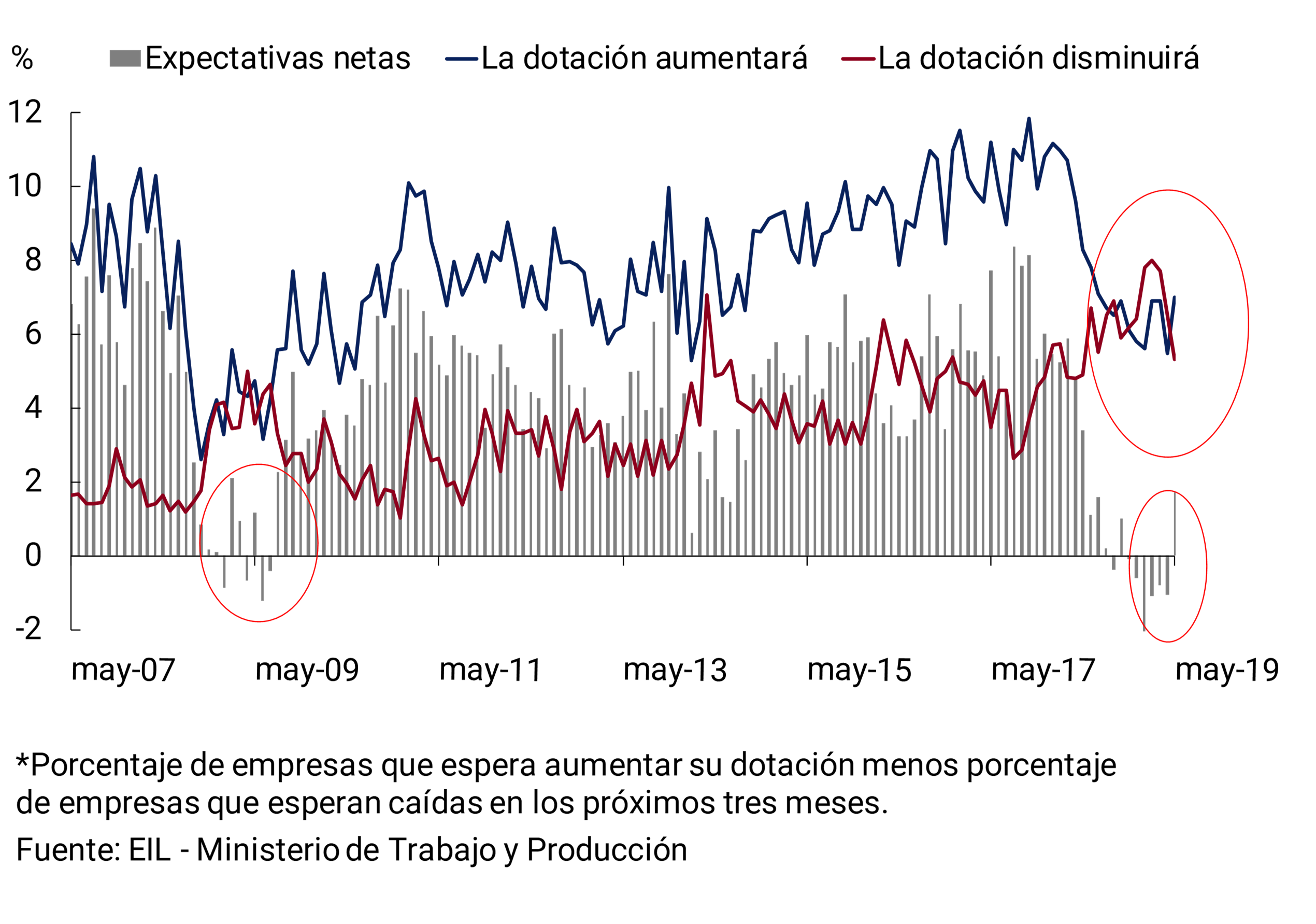 Las empresas prevén una recuperación del empleo formal a partir de junio. Según el relevamiento de mayo de la Encuesta de Indicadores Laborales (EIL), las expectativas de creación de empleo —para los próximos 3 meses— fueron positivas, luego de 6 meses con registros negativos. Este resultado se debió fundamentalmente a una importante caída de las expectativas de disminución del personal y a una suba prevista de la dotación de personal (ver Gráfico 3.19).