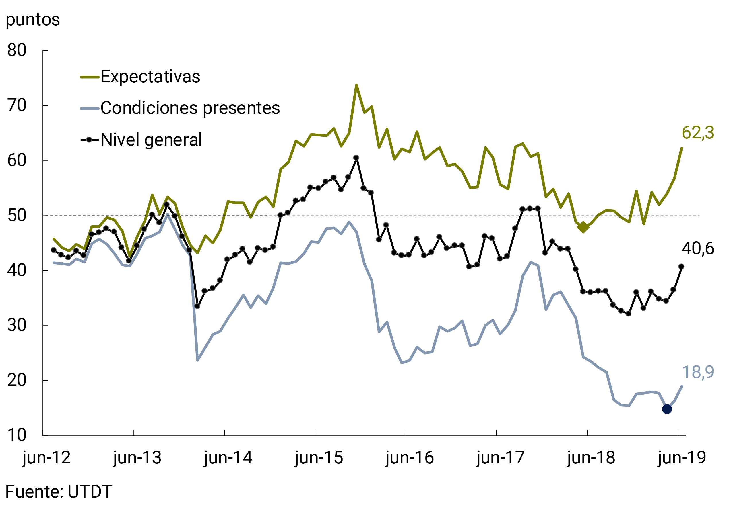 Durante el segundo trimestre la actividad económica retomó la recuperación iniciada en diciembre que había sido transitoriamente interrumpida en marzo. Al impacto positivo sobre la actividad de la cosecha agrícola récord y la movilización de recursos asociados con Vaca Muerta, se sumó un incremento de la confianza de los consumidores. La demanda interna se recuperó en un marco de mejores condiciones financieras internacionales y menor volatilidad cambiaria. El REM estima una suba de 0,7% s.e. trimestral para el segundo trimestre de 2019. El Índice Líder de Actividad (ILA-BCRA) de mayo alcanzó todos los criterios necesarios para confirmar que la actividad entraría en una fase expansiva.
