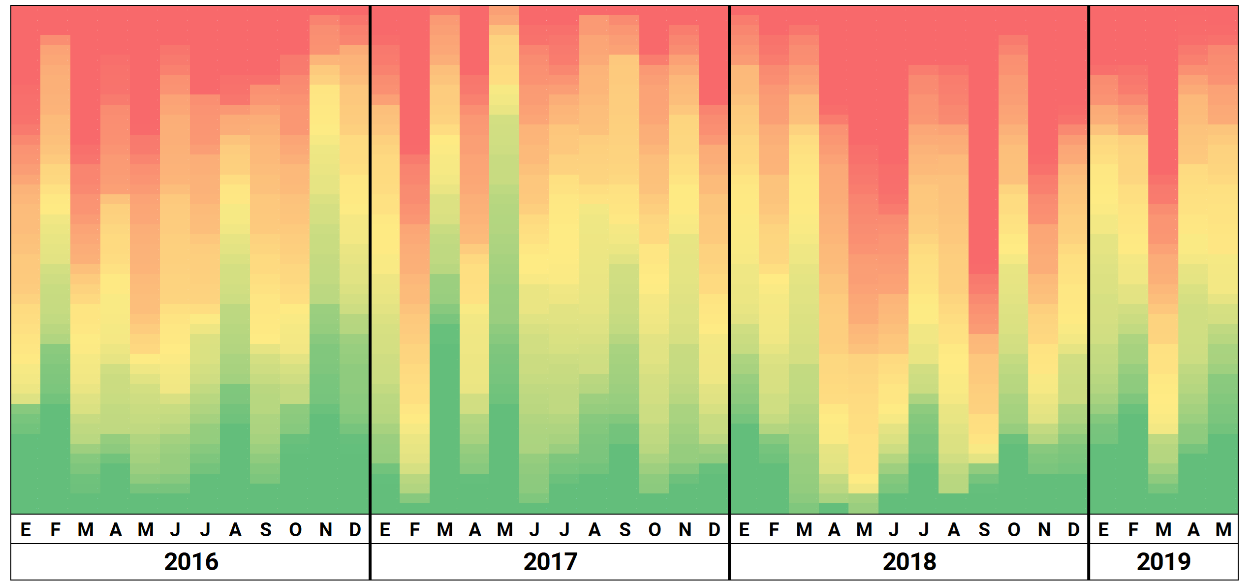 La difusión e intensidad del crecimiento de un conjunto amplio de indicadores de actividad aporta evidencia en el mismo sentido que el ILA-BCRA 6. Como puede apreciarse en el siguiente gráfico, desde diciembre —a excepción de marzo— el crecimiento de este grupo de variables ha sido más difundido e intenso (las áreas rojas se redujeron y se intensificaron las verdes; ver Gráfico 3.3.).