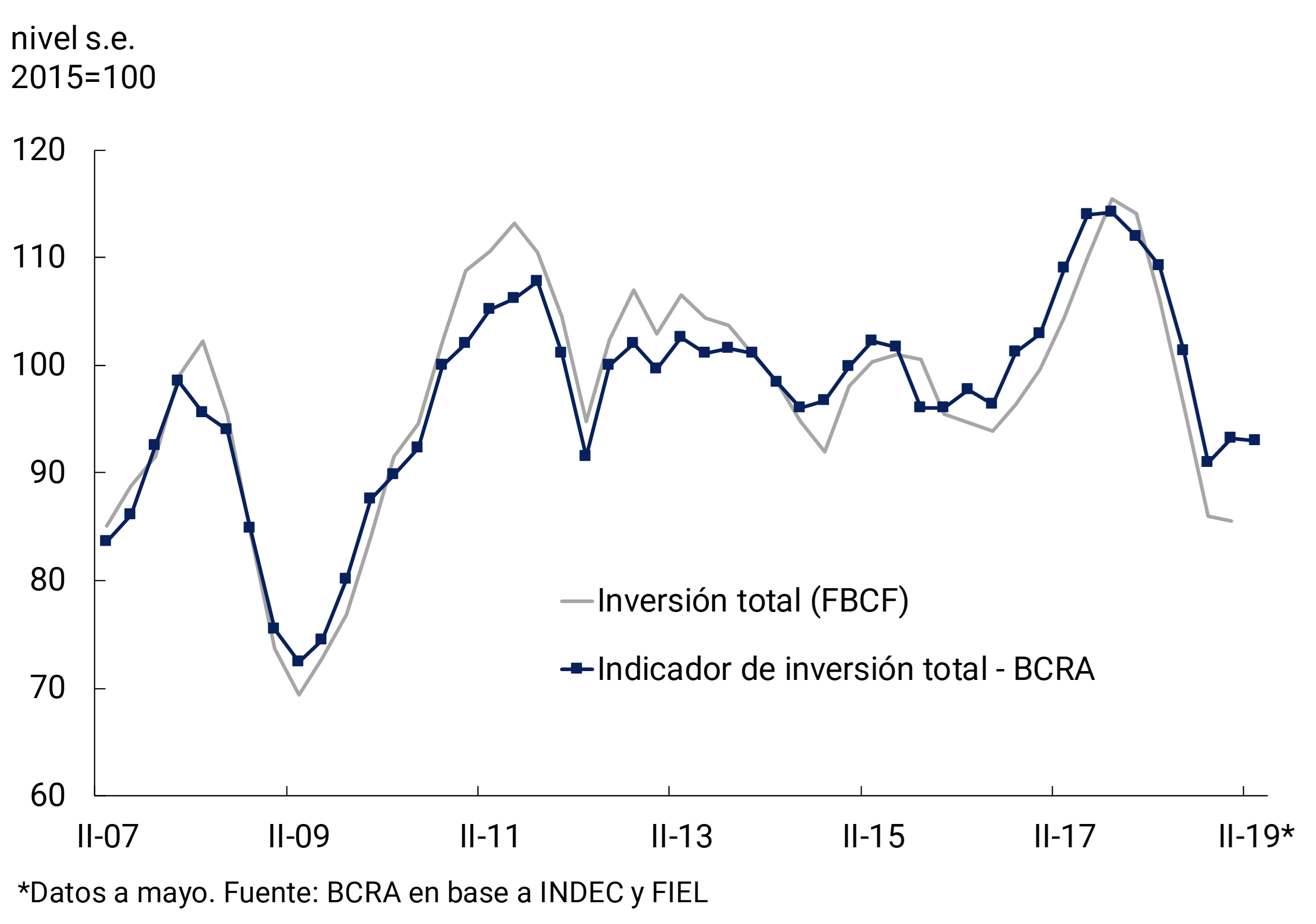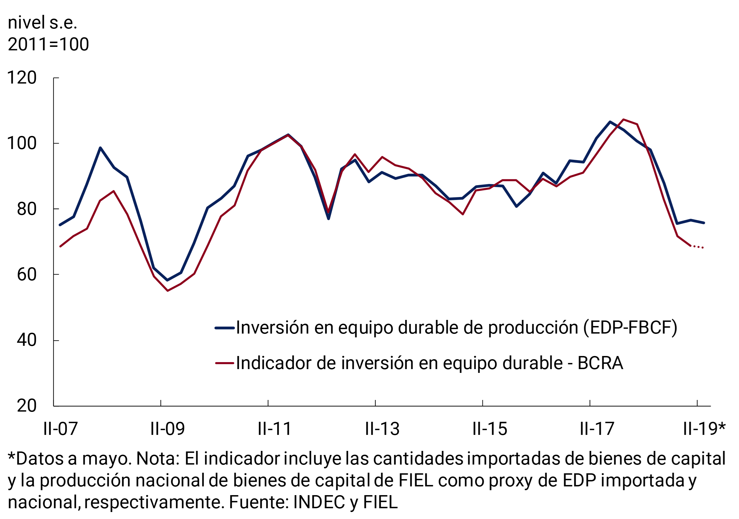 Con respecto a la inversión, se recortó considerablemente la caída observada en el último trimestre de 2018 (-10,2% s.e.). La contracción de 0,9% s.e. en el primer trimestre se explicó por una fuerte disminución del gasto en Equipamiento durable de producción (-5,8% s.e.) que fue atenuada por un aumento de la Construcción (3,6% s.e.). Con datos parciales del segundo trimestre, el indicador de inversión-BCRA —que se había recuperado levemente en el primer trimestre— se mantuvo estable (ver Gráfico 3.6).