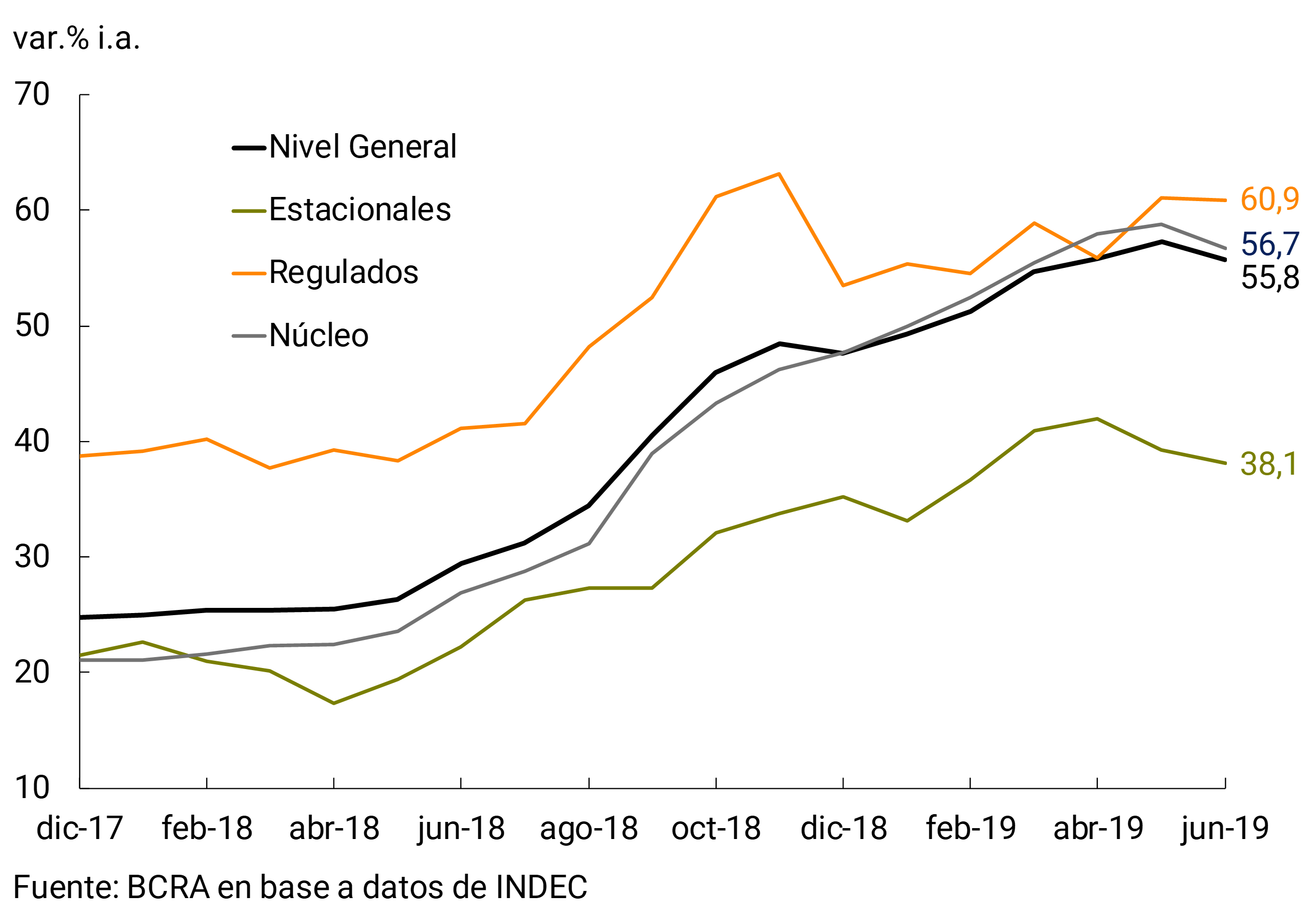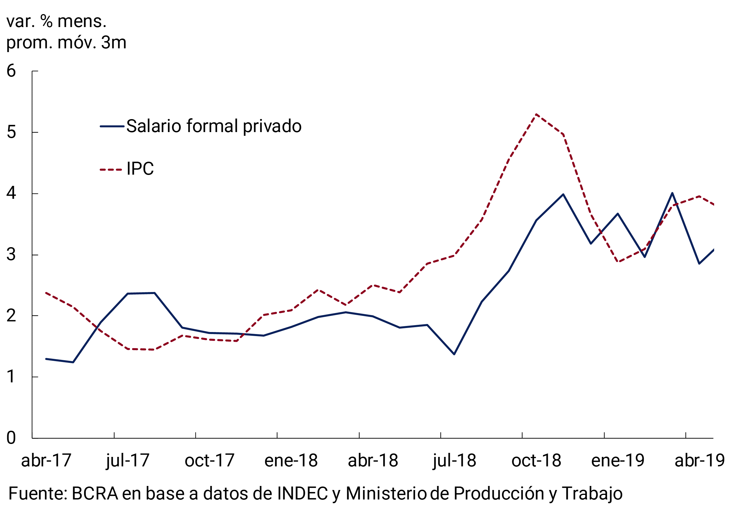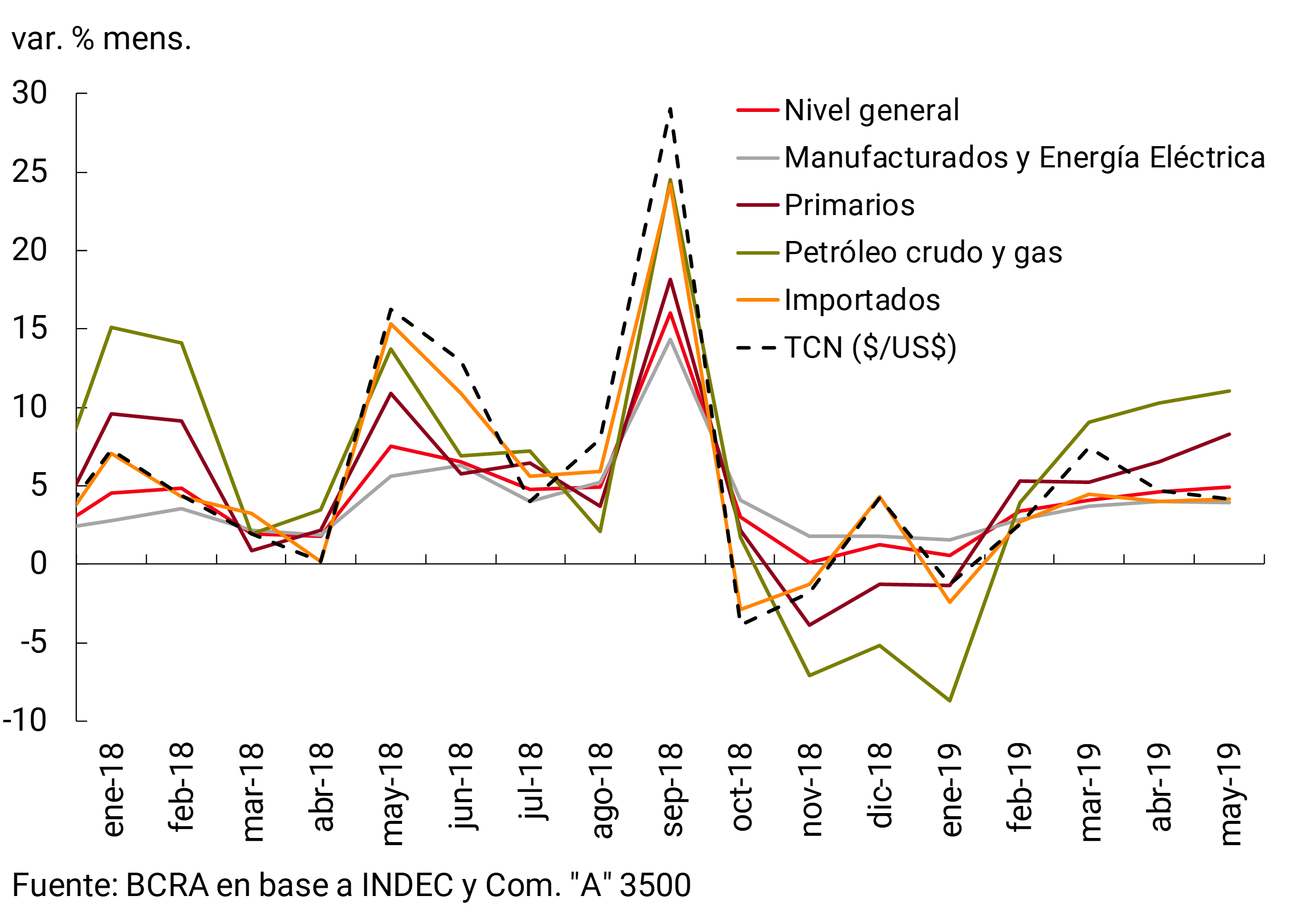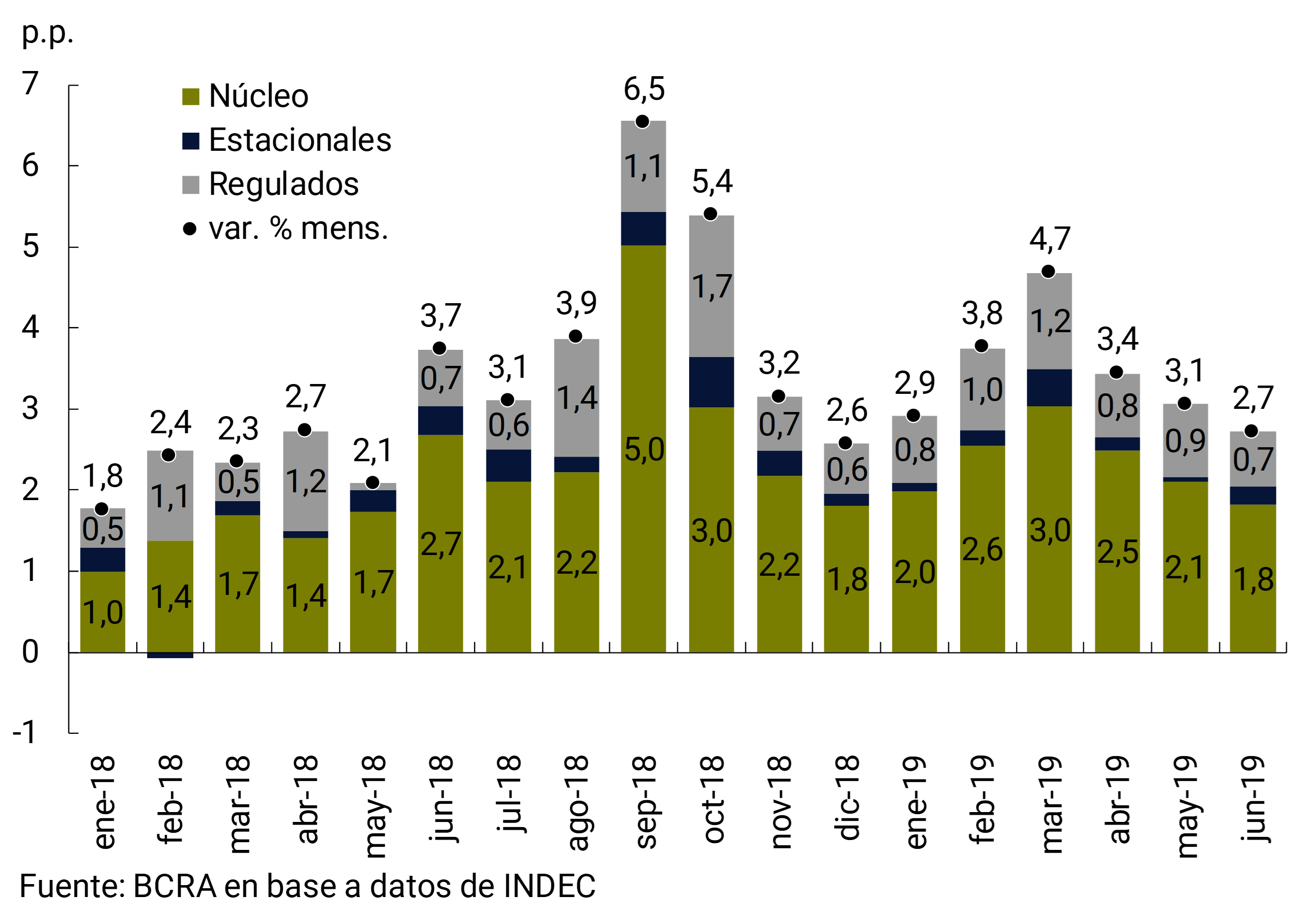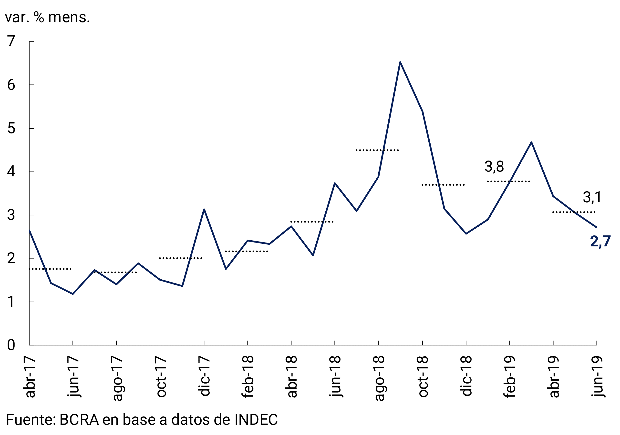 El esquema de agregados monetarios redujo la volatilidad nominal registrada hasta el tercer trimestre del año pasado, y la inflación comenzó a descender desde el pico de 6,5% mensual registrado en septiembre de 2018. No obstante, durante el primer trimestre de 2019, la concentración de aumentos de los precios regulados, a lo que se le sumaron los efectos rezagados de la depreciación cambiaria de 2018 y un nuevo episodio de volatilidad cambiaria, hicieron que la inflación vuelva a aumentar.