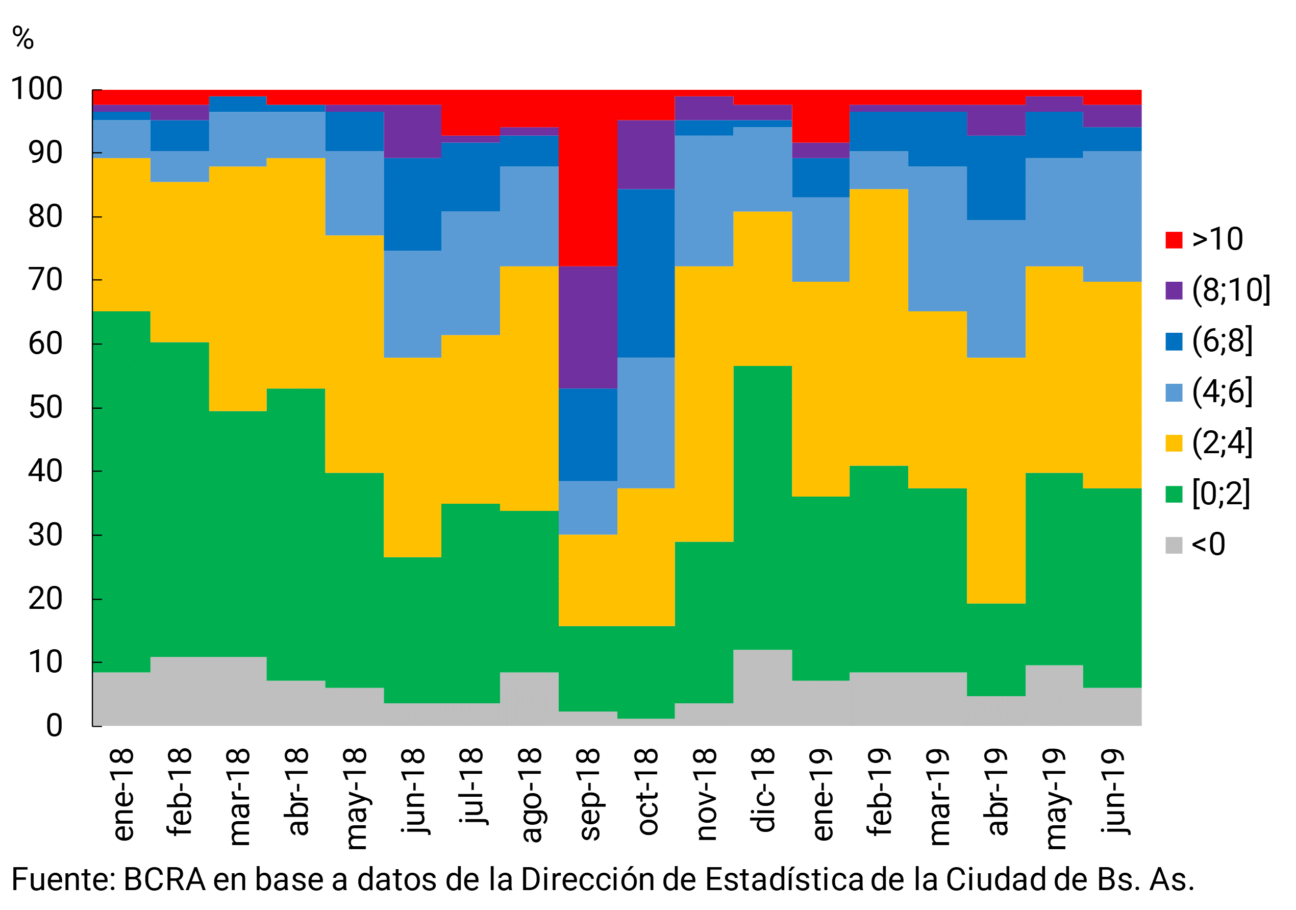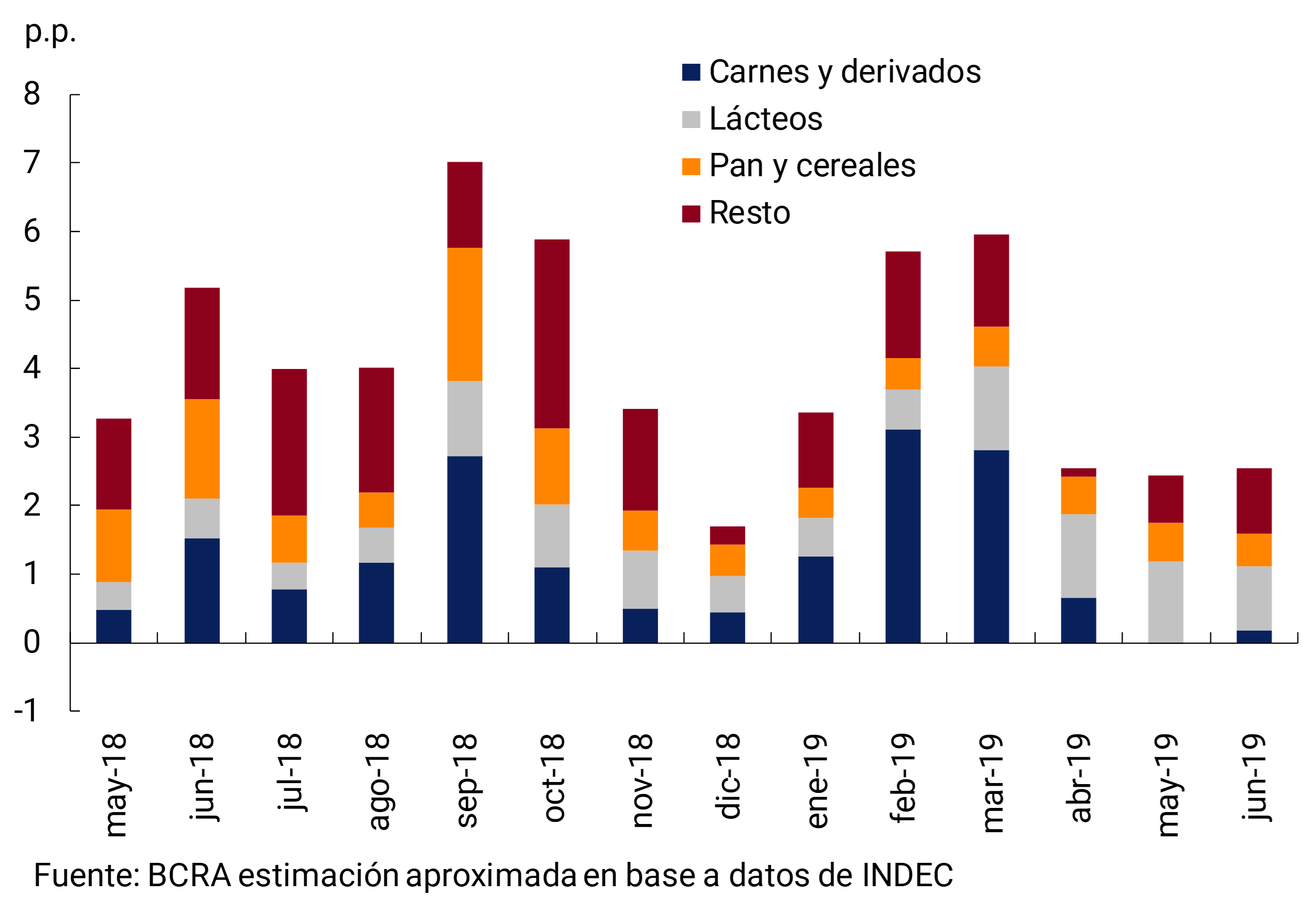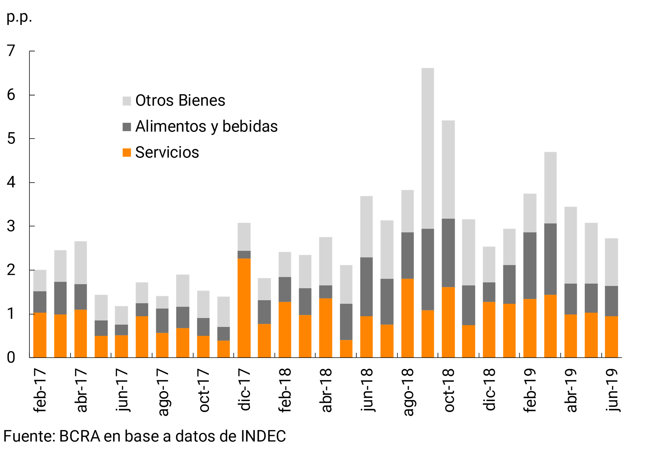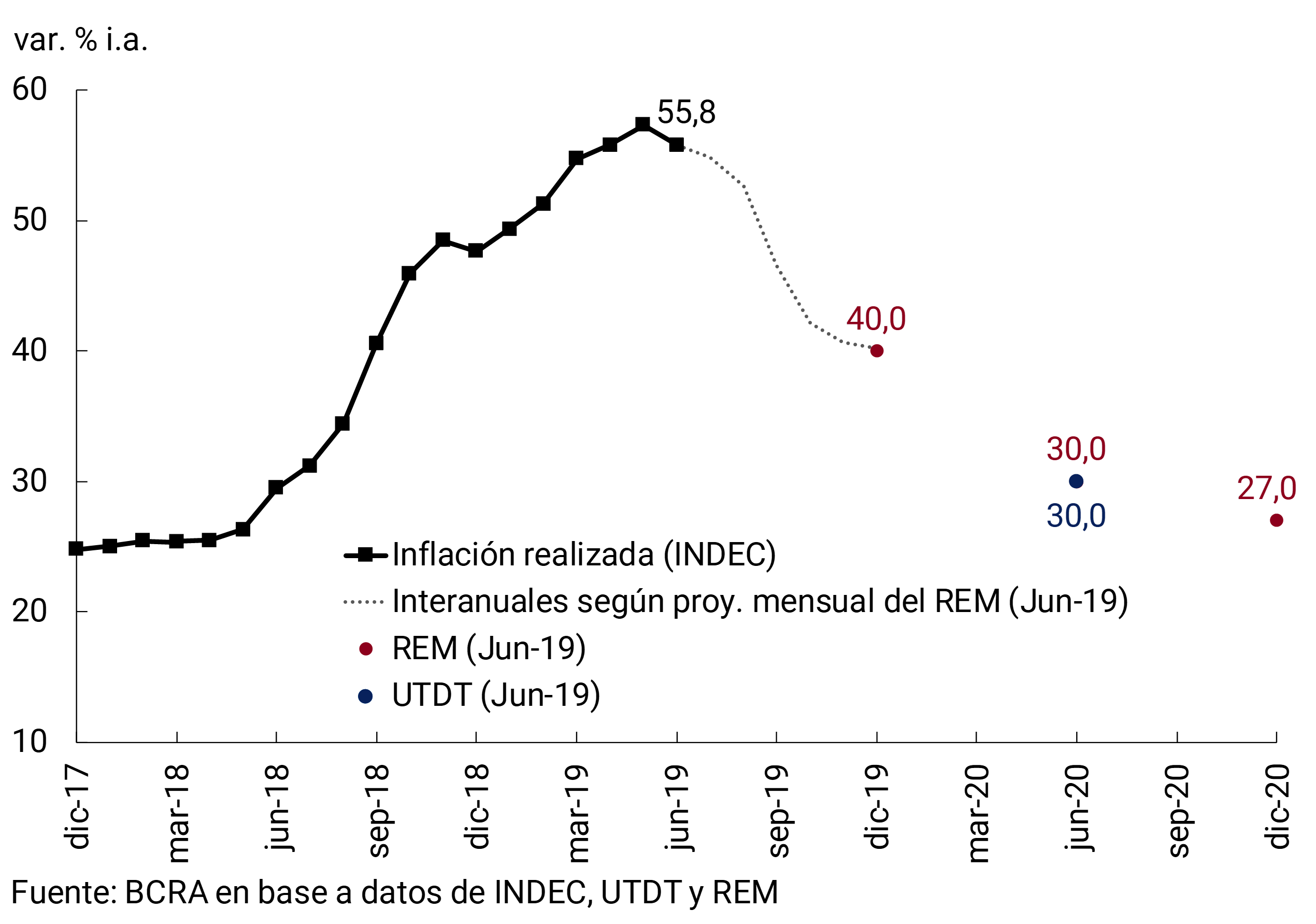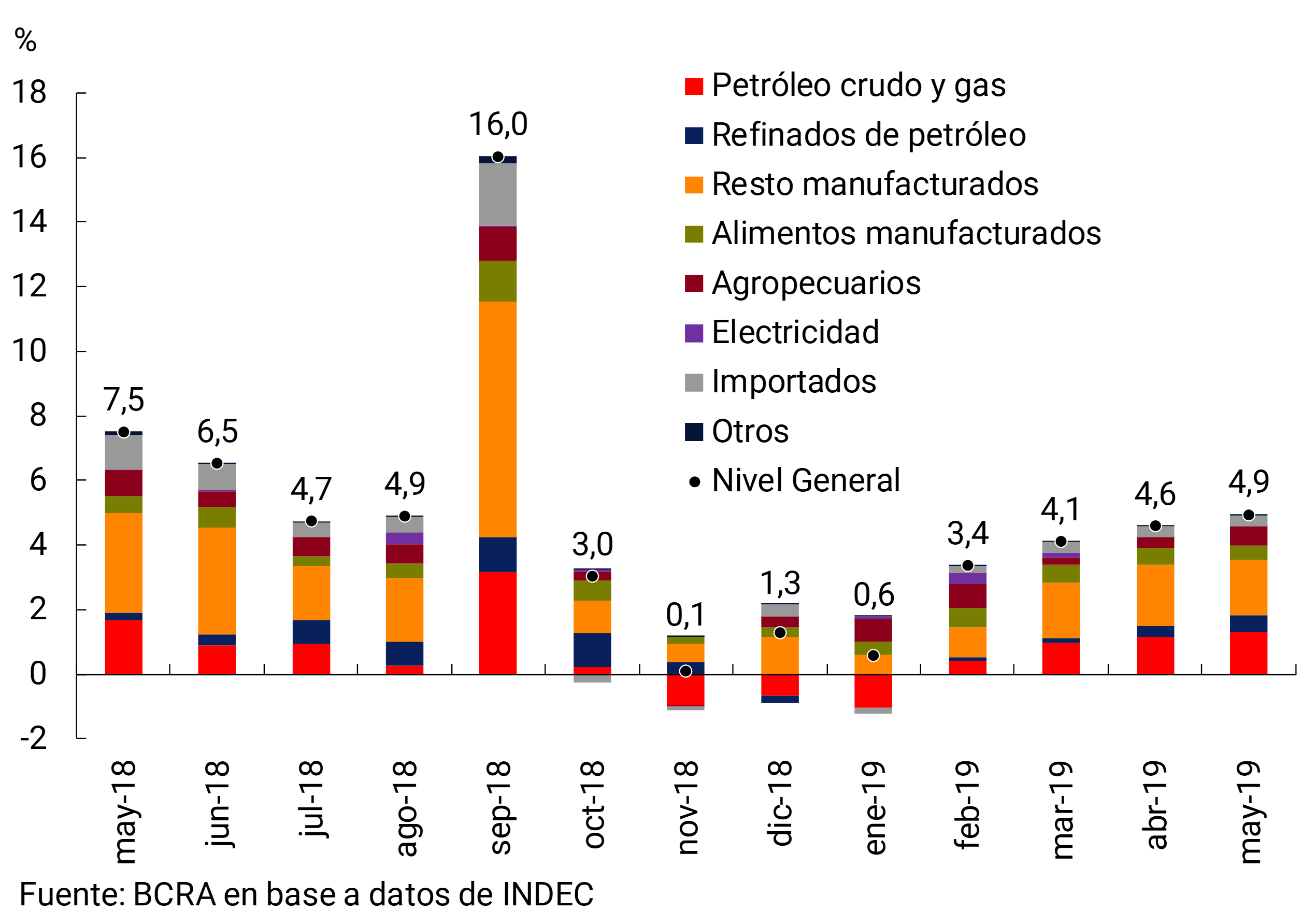 El esquema de agregados monetarios redujo la volatilidad nominal registrada hasta el tercer trimestre del año pasado, y la inflación comenzó a descender desde el pico de 6,5% mensual registrado en septiembre de 2018. No obstante, durante el primer trimestre de 2019, la concentración de aumentos de los precios regulados, a lo que se le sumaron los efectos rezagados de la depreciación cambiaria de 2018 y un nuevo episodio de volatilidad cambiaria, hicieron que la inflación vuelva a aumentar.