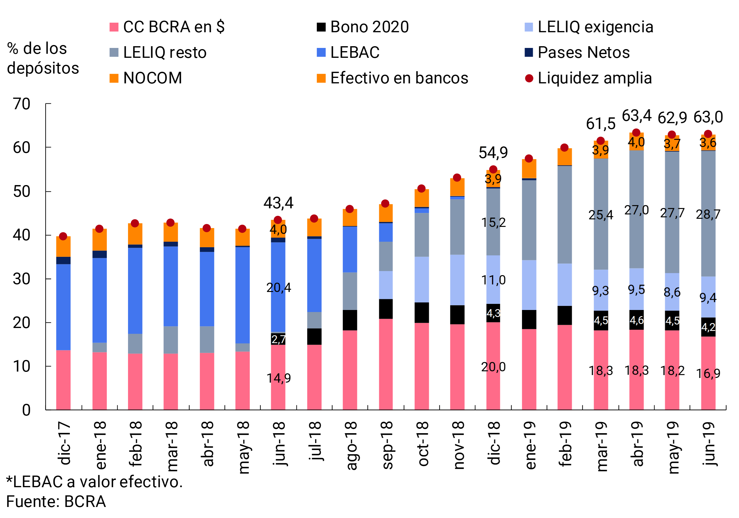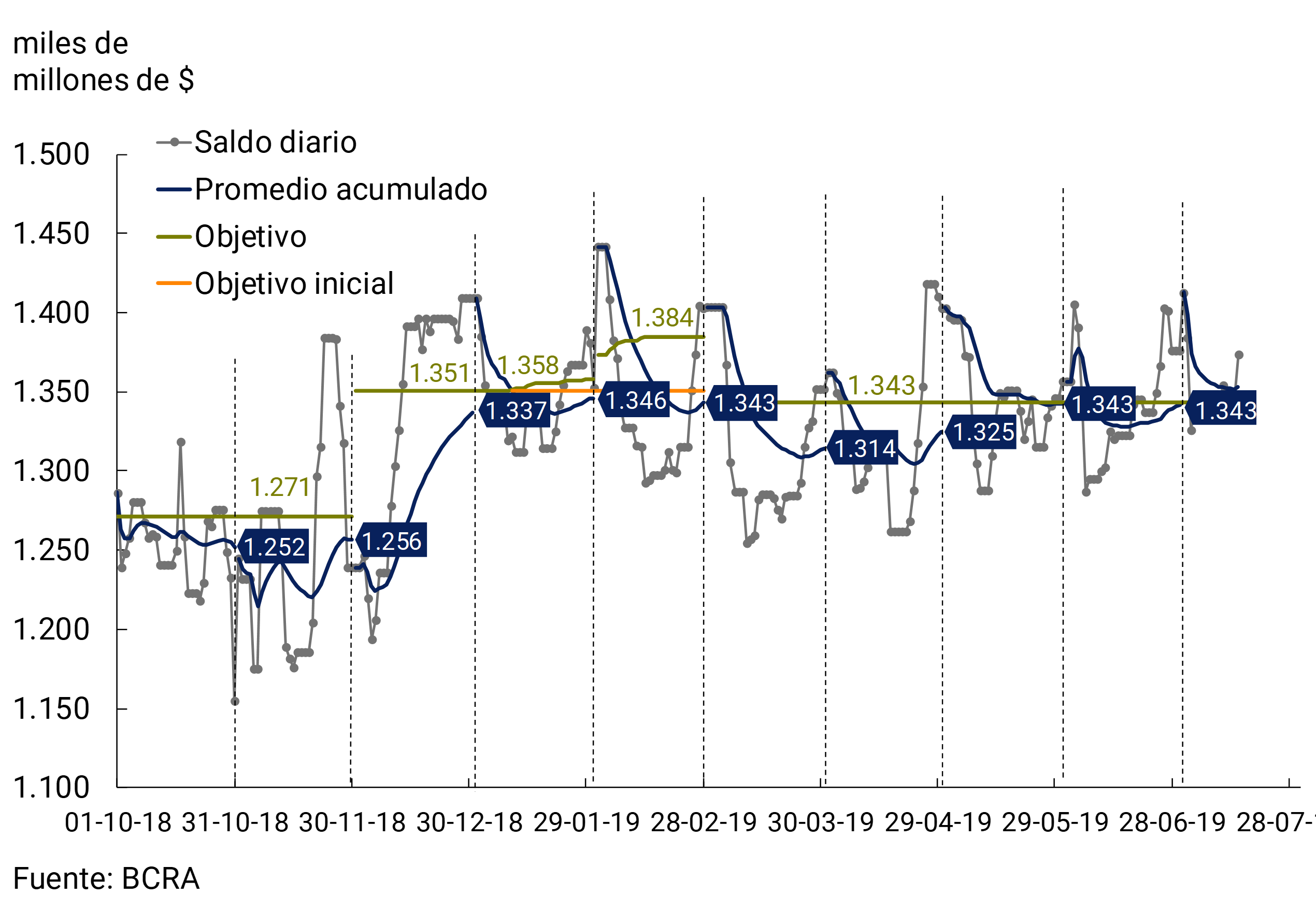 Complementariamente, y para contribuir también a fortalecer la transmisión de la tasa de interés de las LELIQ, se decidió reducir en 3 p.p. la exigencia de efectivo mínimo sobre depósitos a plazo fijo a partir de julio. Esto representa una reducción de la demanda de base monetaria por encajes de aproximadamente $45 mil millones que compensa la suba estacional de la demanda por circulante. Con el fin de no relajar la política monetaria, superado este fenómeno estacional, la meta de la base monetaria será reducida a partir de agosto hasta llegar a $1.298,2 mil millones en octubre, compensando totalmente el efecto de la baja de encajes.