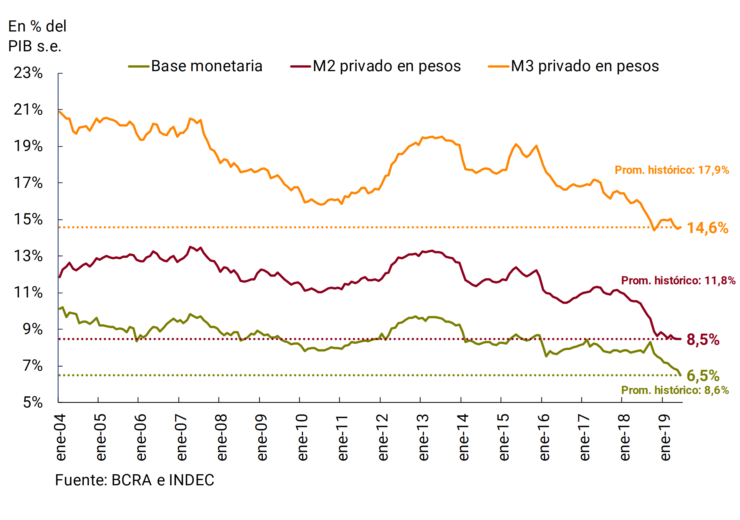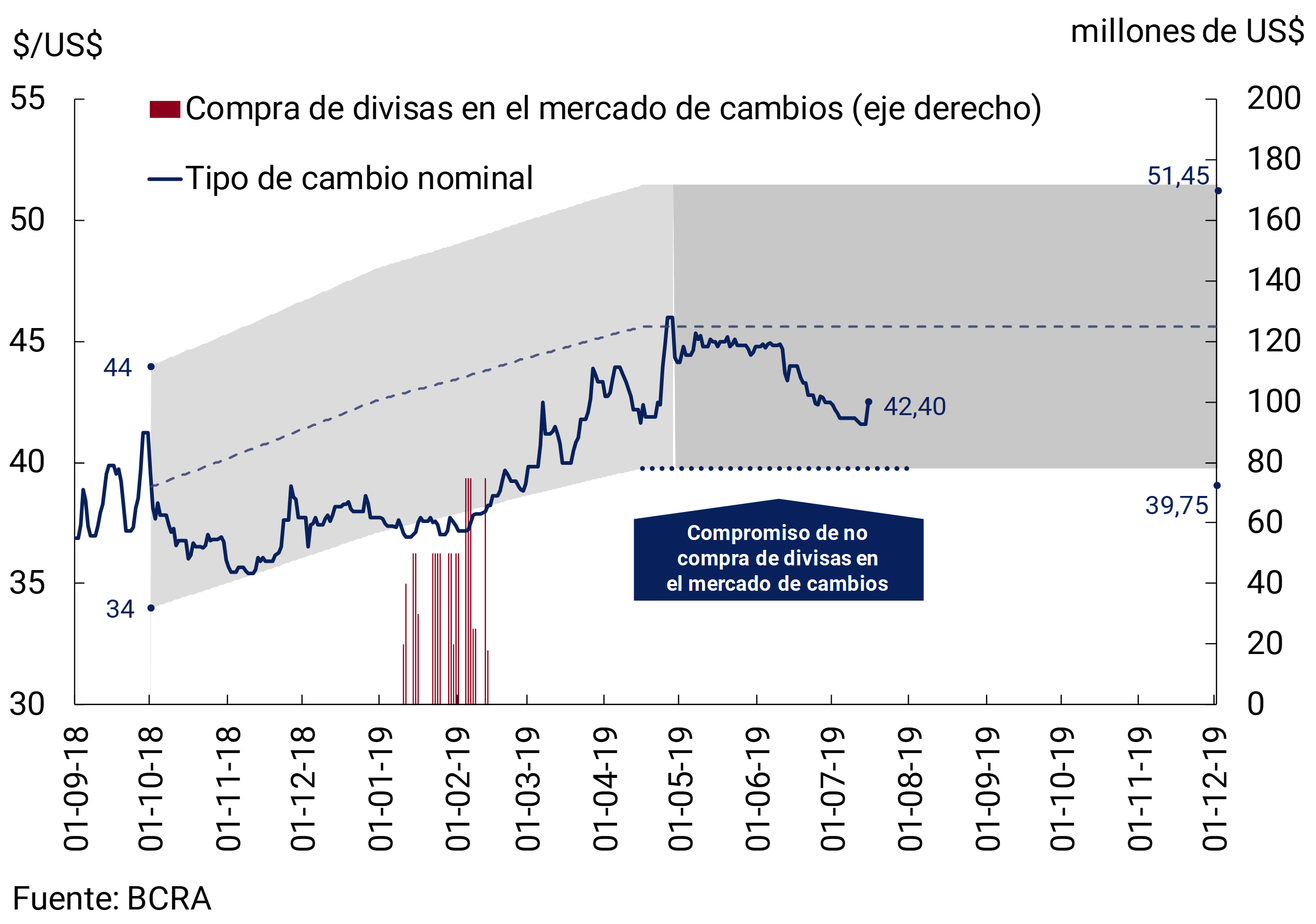 Frente a esta situación, el Comité de Política Monetaria (COPOM) tomó una serie de medidas adicionales durante marzo y abril de 2019 para reforzar el esquema monetario-cambiario: 1) redujo en $43 mil millones la meta de base monetaria, eliminó el ajuste estacional de la meta previsto para junio y extendió a todo 2019 el compromiso de cero crecimiento de la base monetaria, inicialmente previsto hasta junio de 2019; 2) estableció un mínimo a la tasa de interés de referencia; 3) fijó en cero el crecimiento de los límites de la zona de referencia cambiaria, dejándose constantes el límite superior en 51,448 pesos por dólar y el límite inferior de 39,755 pesos por dólar hasta fin de año, y decidió abstenerse de comprar divisas si el tipo de cambio se ubicara por debajo de la zona de referencia; y 4) dispuso que se podrán realizar ventas de divisas en el mercado cambiario ante episodios de volatilidad excesiva, incluso si el tipo de cambio se encontrara dentro de la zona de referencia (ver apartado 3).