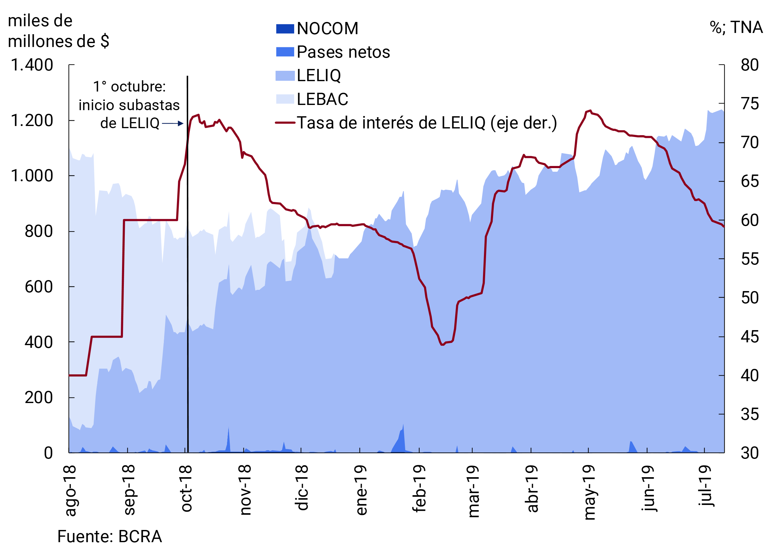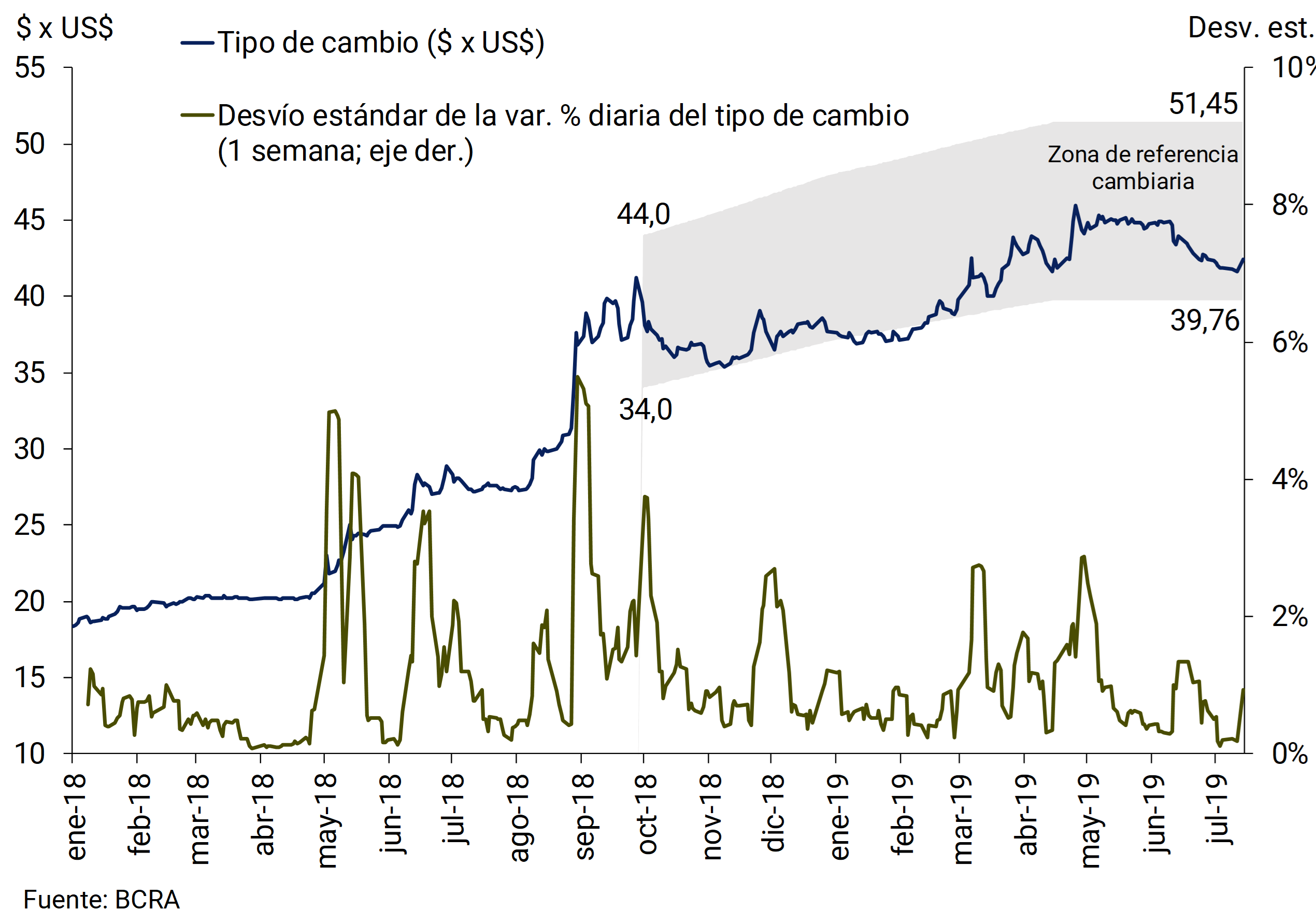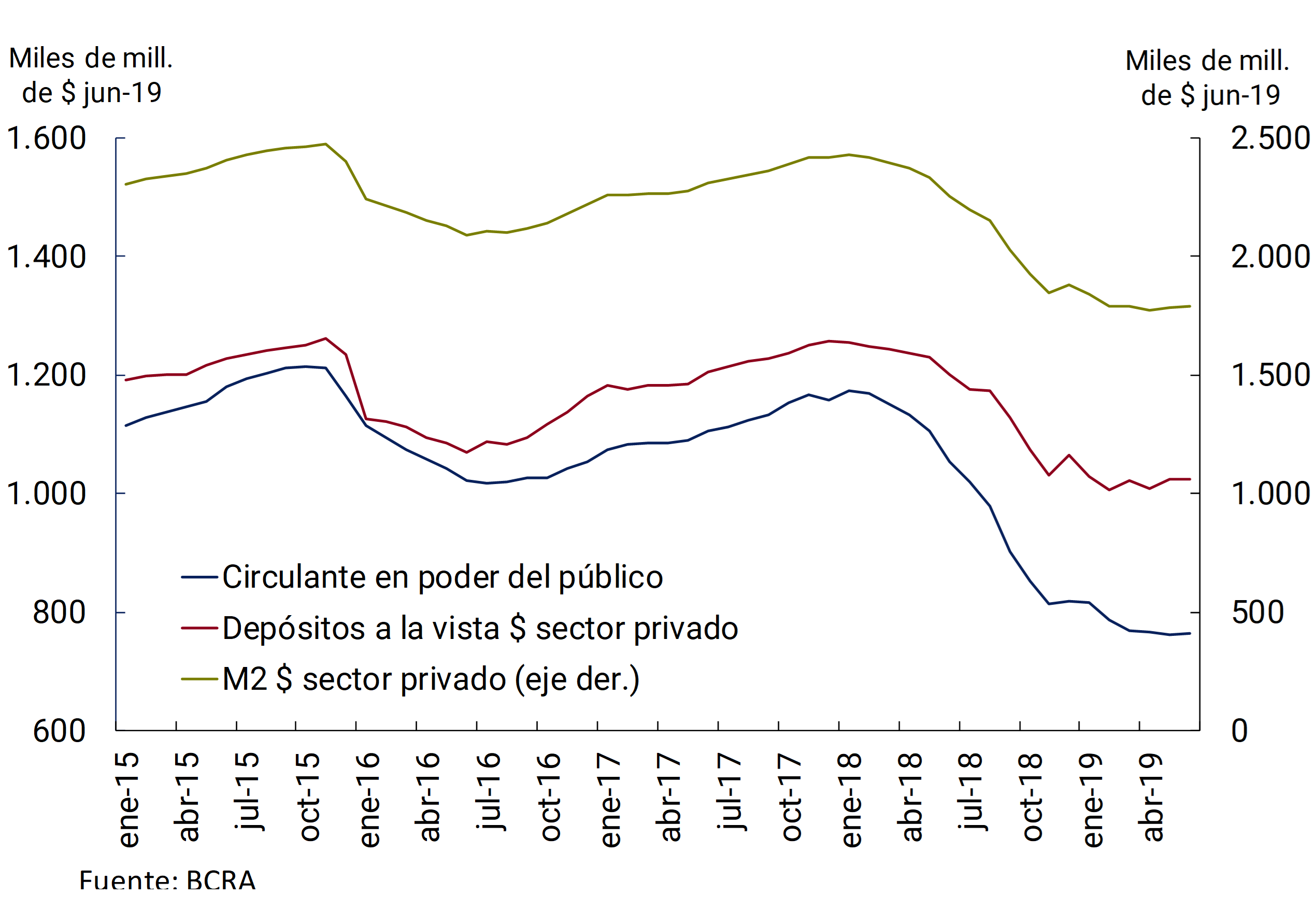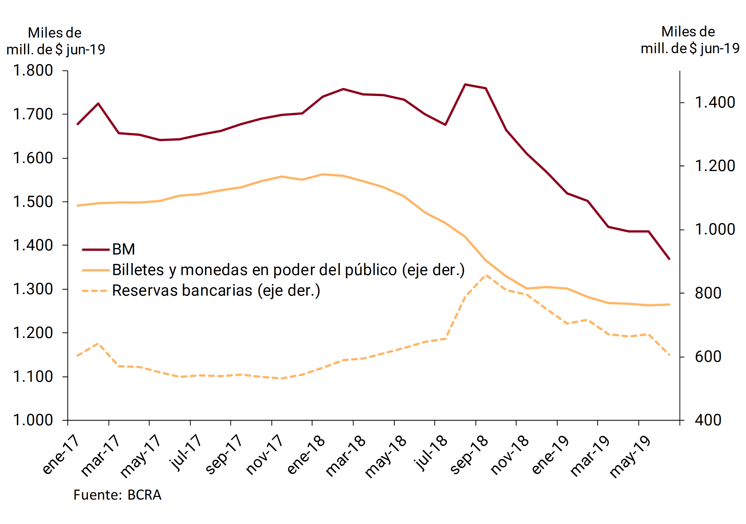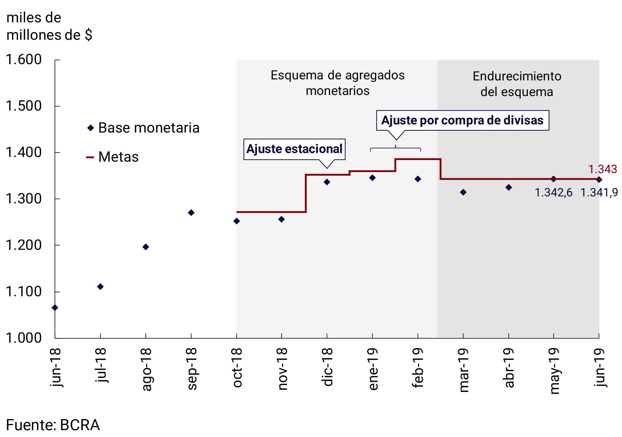 El Banco Central de la República Argentina lleva adelante, desde octubre de 2018, un esquema basado en un estricto control de la base monetaria y la definición de una zona de referencia cambiaria (antes llamada zona de no intervención cambiaria). Durante el segundo trimestre del año el Banco Central siguió cumpliendo cada mes su meta de crecimiento cero de base monetaria (BM), que se mantuvo en $ 1.343,2 mil millones.