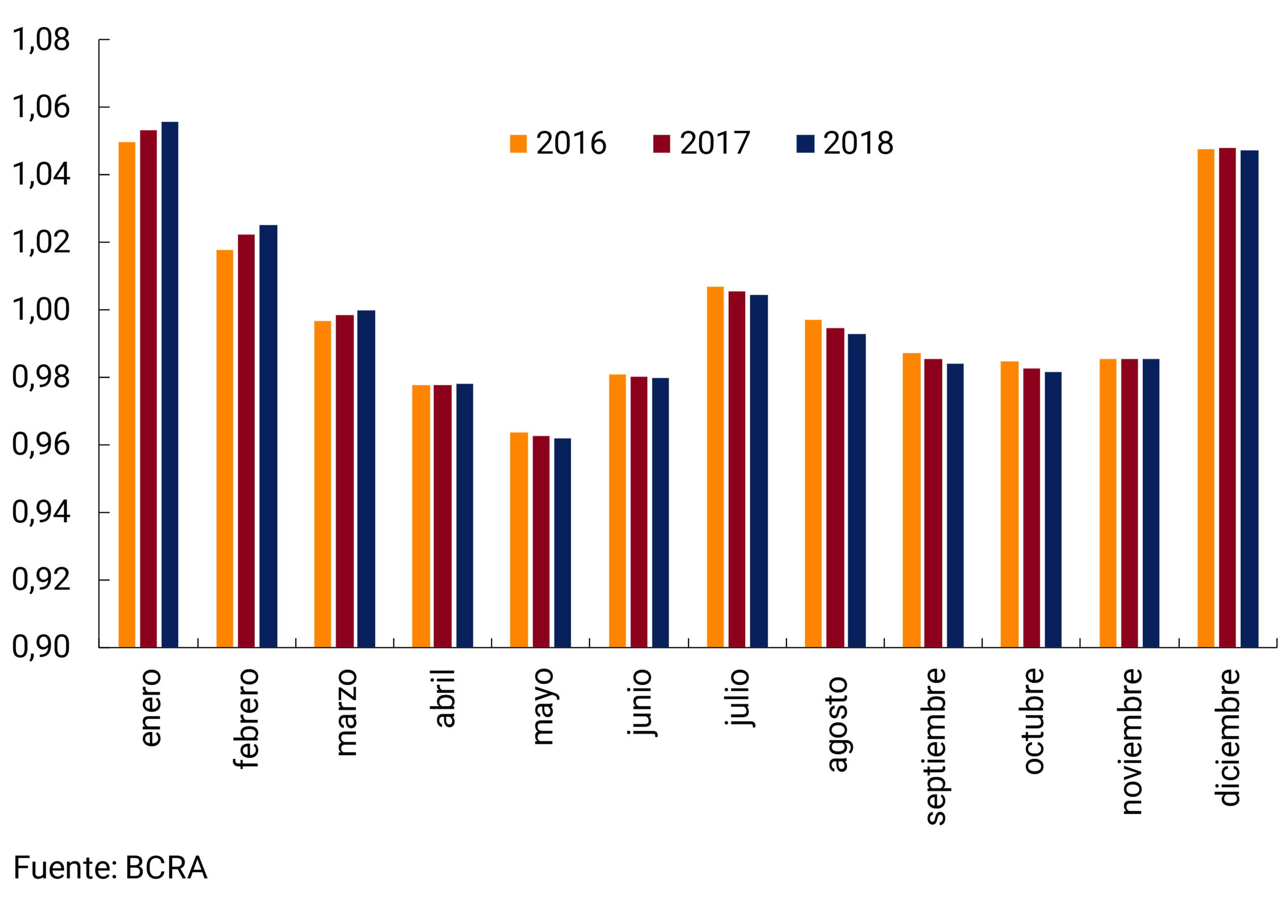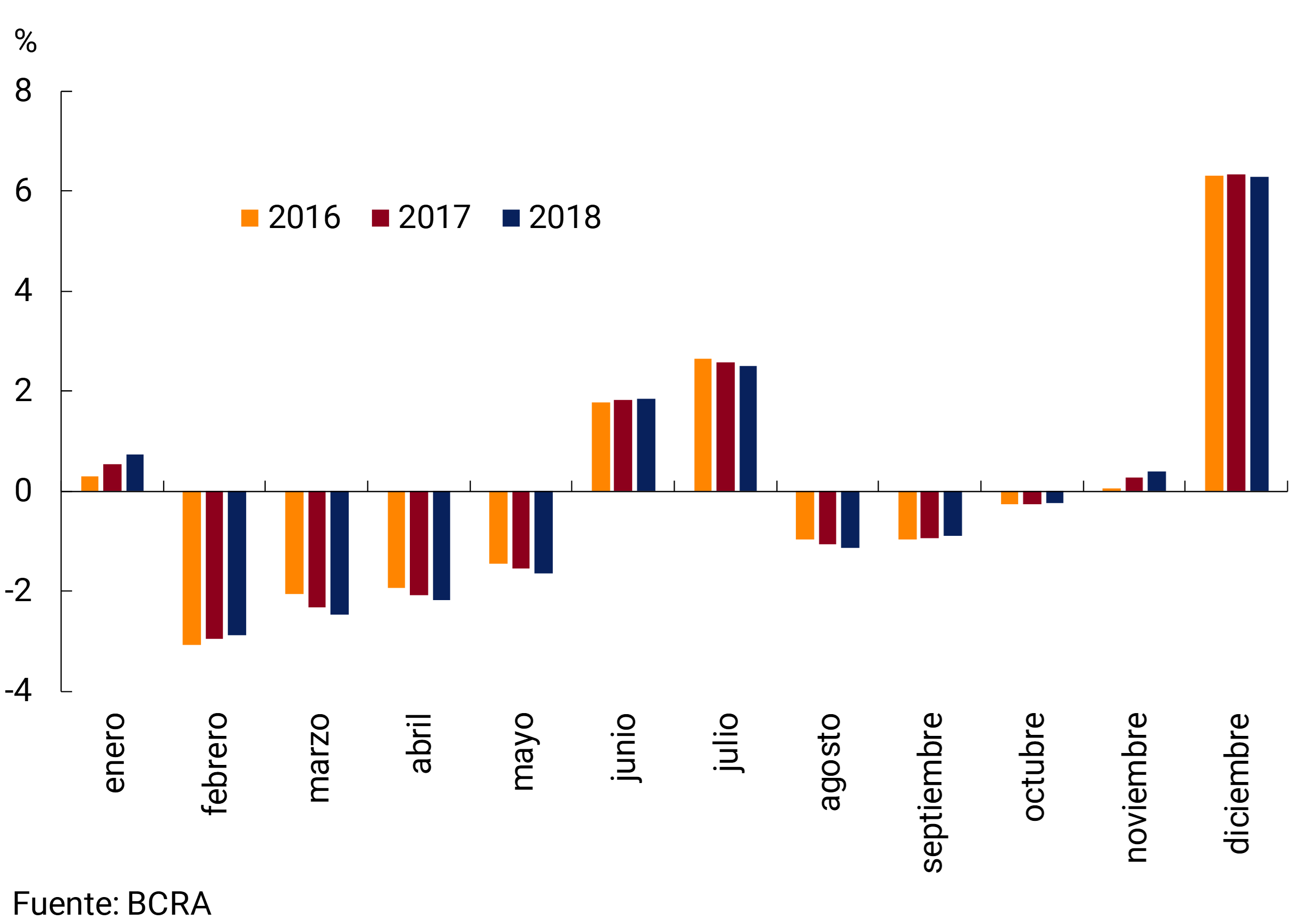 El cumplimiento de la meta resulta particularmente exigente en los meses de junio y julio, debido al comportamiento estacional de la demanda de BM, que se incrementa por el pago del medio aguinaldo y los mayores gastos del receso invernal. Para permitir una mejor administración de las condiciones de liquidez en este período, el BCRA dispuso establecer una posición conjunta de encaje para los meses de julio-agosto, y para los meses de diciembre-enero donde se repite un fenómeno similar (ver apartado 4).