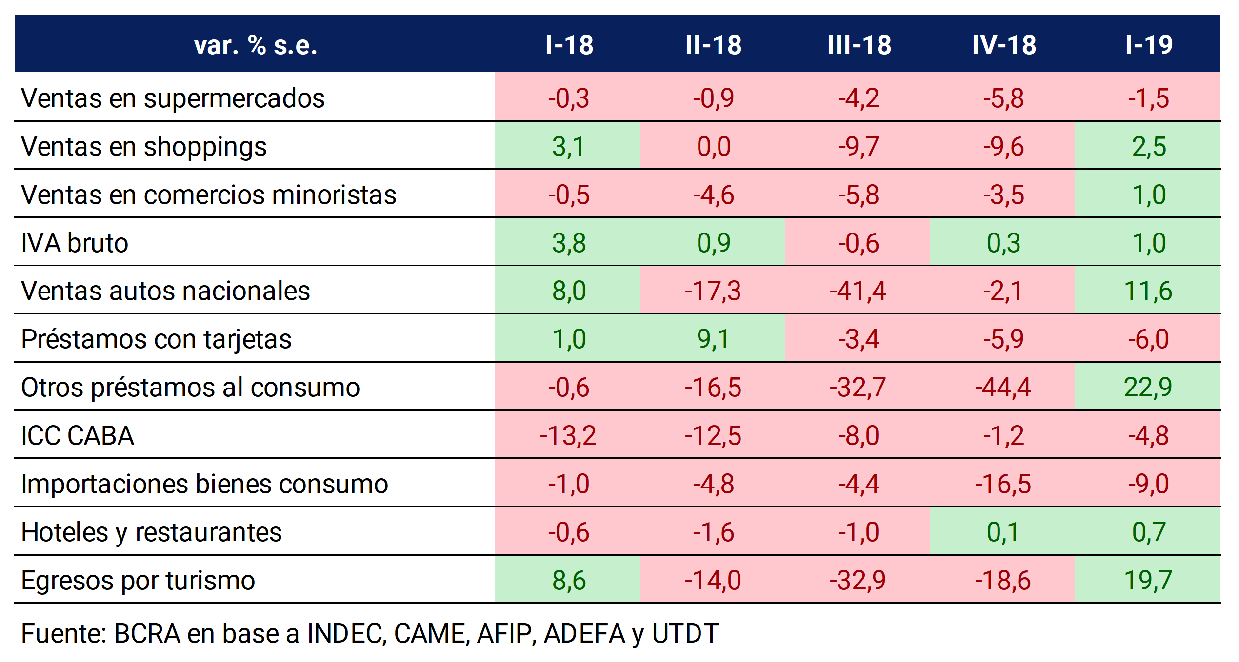 El Consumo privado registró una nueva caída durante el primer trimestre de 2019 a pesar de que varios indicadores parciales mostraron una mejora. Entre ellos se destacan el crecimiento de los volúmenes de ventas en shoppings (2,5% s.e.), las ventas de autos nacionales (11,6% s.e.) y el otorgamiento neto de préstamos al consumo (22,6%) (ver Tabla 3.2).