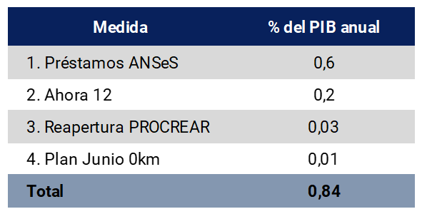 Para incentivar las ventas de automóviles, el plan Junio 0km12 tiene bonificaciones que rondan los $50.000 y $90.000, de acuerdo con el precio del automóvil elegido. Adicionalmente, la Ciudad de Buenos Aires y la Provincia de Buenos Aires reducirán el impuesto a los sellos (a unidades de menos de $750.000) que se cobra con el patentamiento13. El costo fiscal de este programa sería parcialmente compensado por la recaudación impositiva derivada de la venta de una mayor cantidad de automóviles. Las distintas medidas mencionadas podrían alcanzar en su conjunto alrededor de 0,8 p.p. del PIB (ver Tabla 3.3).