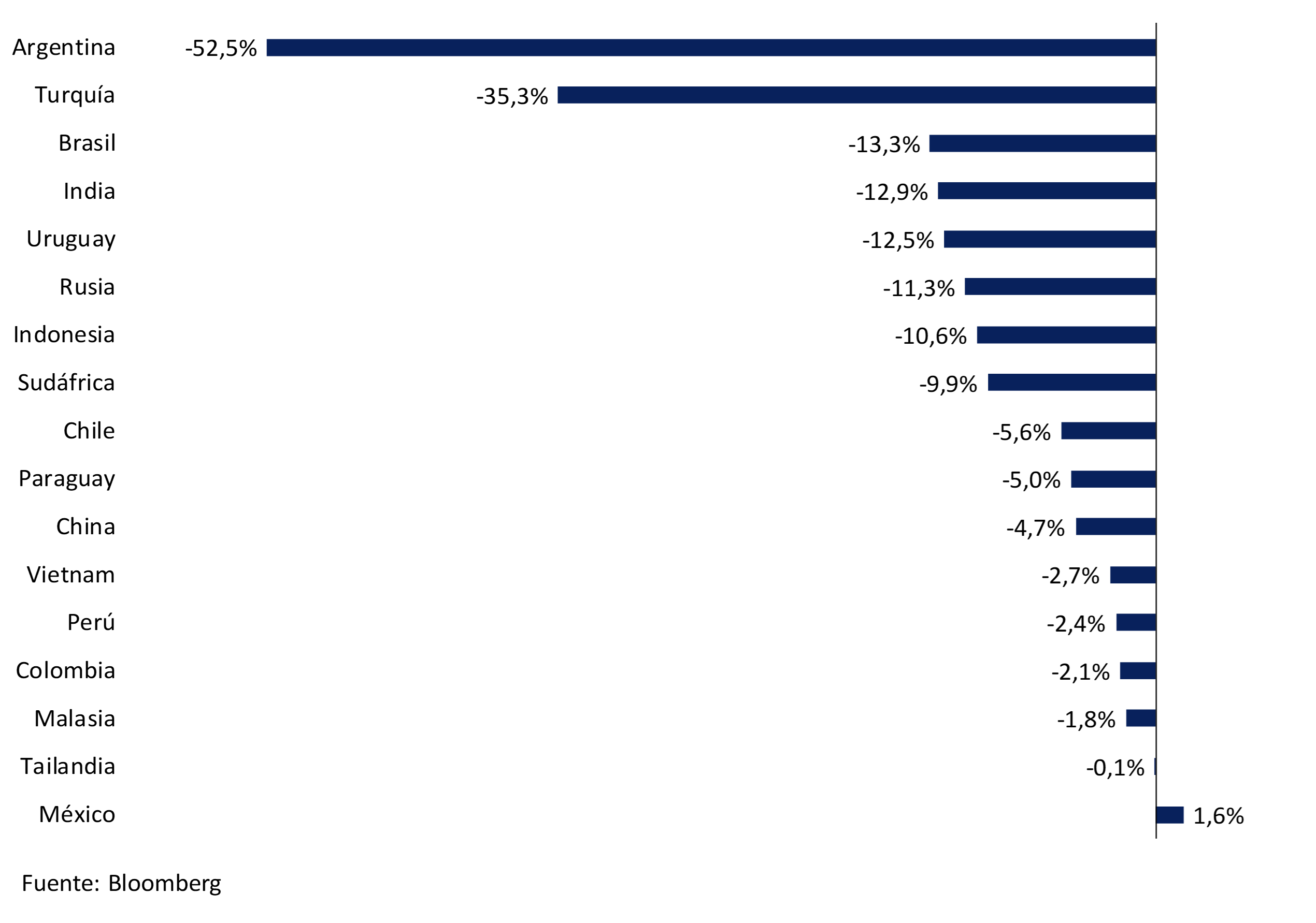 Hasta el 9 de agosto la lira turca acumulaba en el año una depreciación del 31,6%. Ese día, Estados Unidos duplicó las tarifas a las importaciones de acero y aluminio provenientes de Turquía, argumentando que debía protegerse del uso del tipo de cambio como herramienta competitiva. Esto provocó nuevas depreciaciones de la lira. Con déficit de cuenta corriente persistente desde el año 2002, (un 5,4% del PIB estimado para este año), Turquía acumuló endeudamiento externo y depende de nuevo financiamiento para cubrir la brecha externa. Para enfrentar el desfavorable contexto externo endureció de manera indirecta las condiciones monetarias y buscó asistencia financiera fuera de los organismos internacionales, logrando apoyo de Catar. Luego, a mediados de octubre el gobierno de Turquía volvió a colocar deuda en los mercados internacionales.
