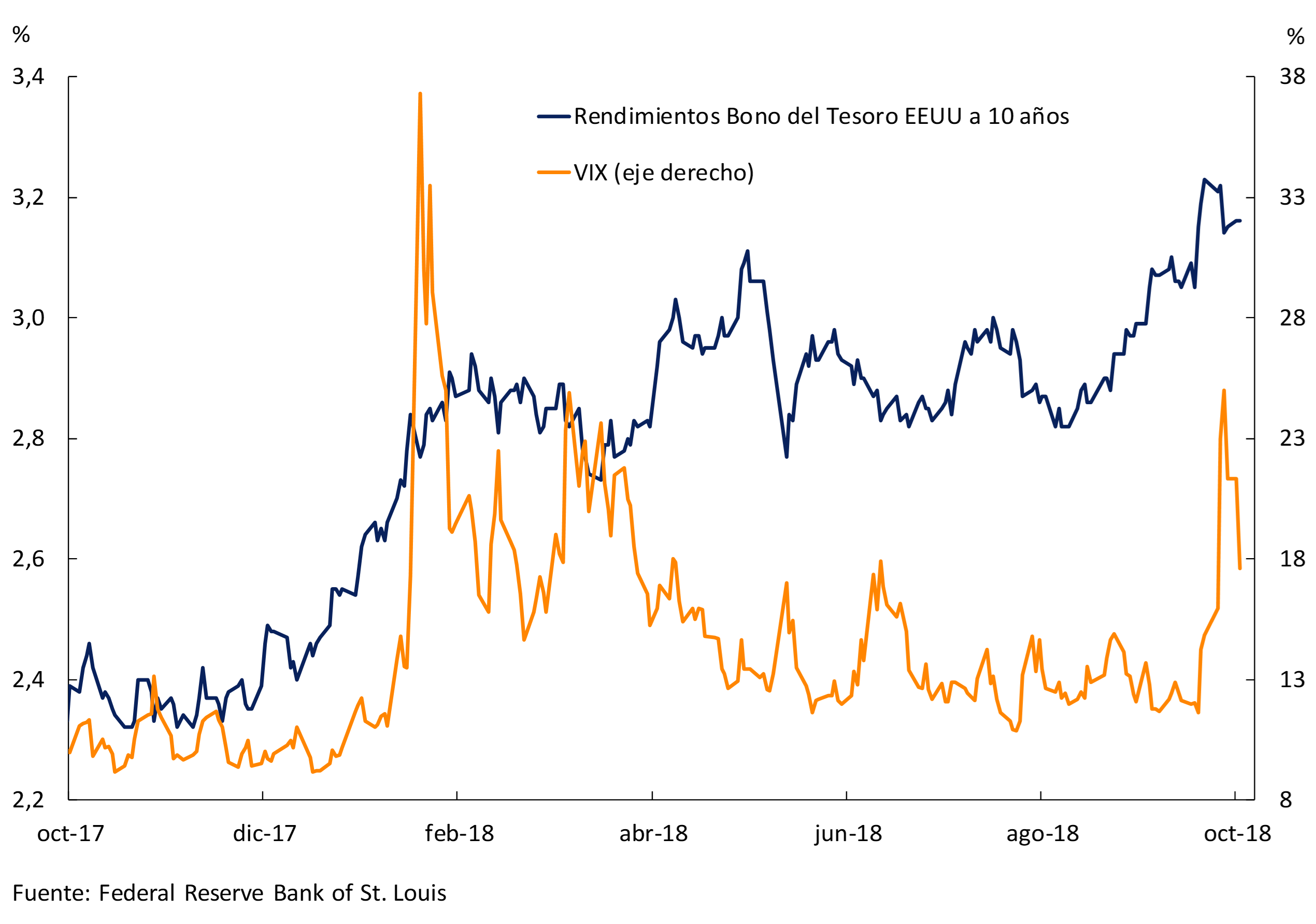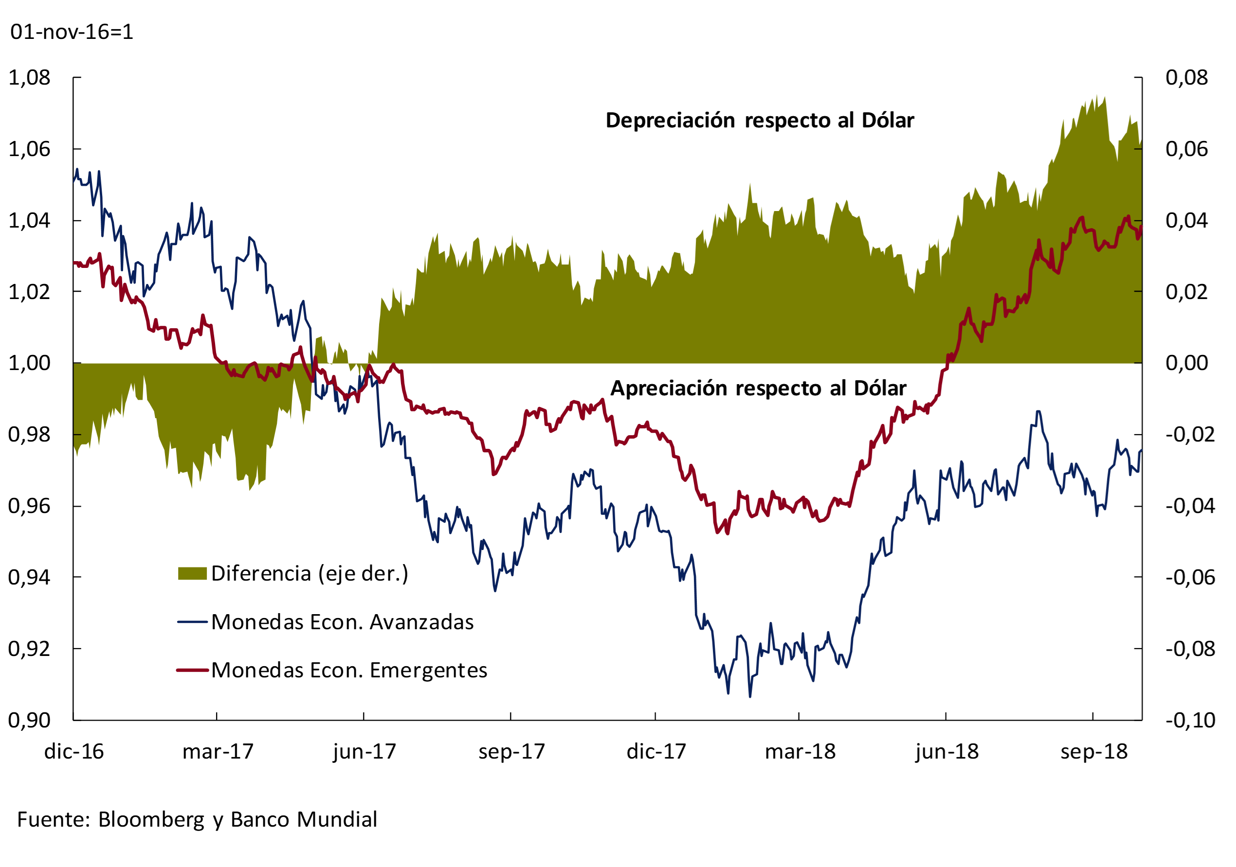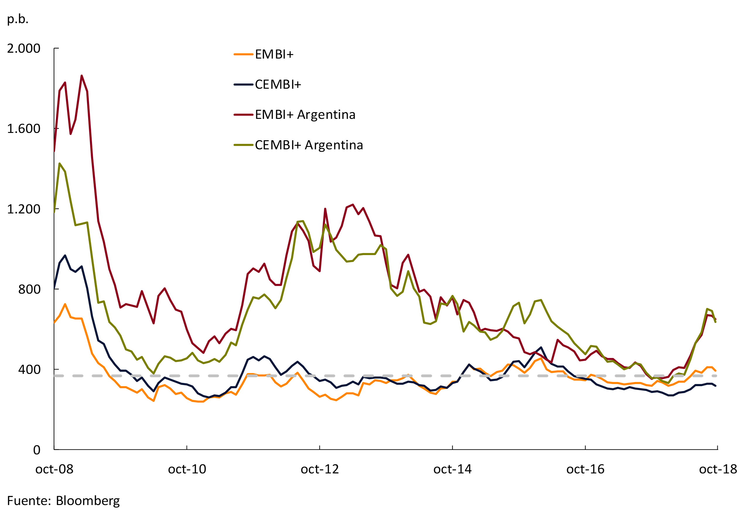 Las condiciones de acceso a los mercados financieros internacionales de las economías emergentes continuaron deteriorándose durante el tercer trimestre del año, aunque a menor ritmo que durante el trimestre previo. Entre los principales factores explicativos se cuentan la suba de tasas de interés y la expectativa de menor estímulo monetario por parte de la Reserva Federal de Estados Unidos (Fed), junto con nuevas señales de tensiones comerciales entre algunas de las economías de mayor porte. Todos estos elementos llevaron a una salida de capitales de países emergentes, a un aumento de las primas de riesgo soberano, y a una depreciación de sus monedas. Las economías más afectadas fueron aquellas con desequilibrios externos pronunciados y/o elevados niveles de endeudamiento.