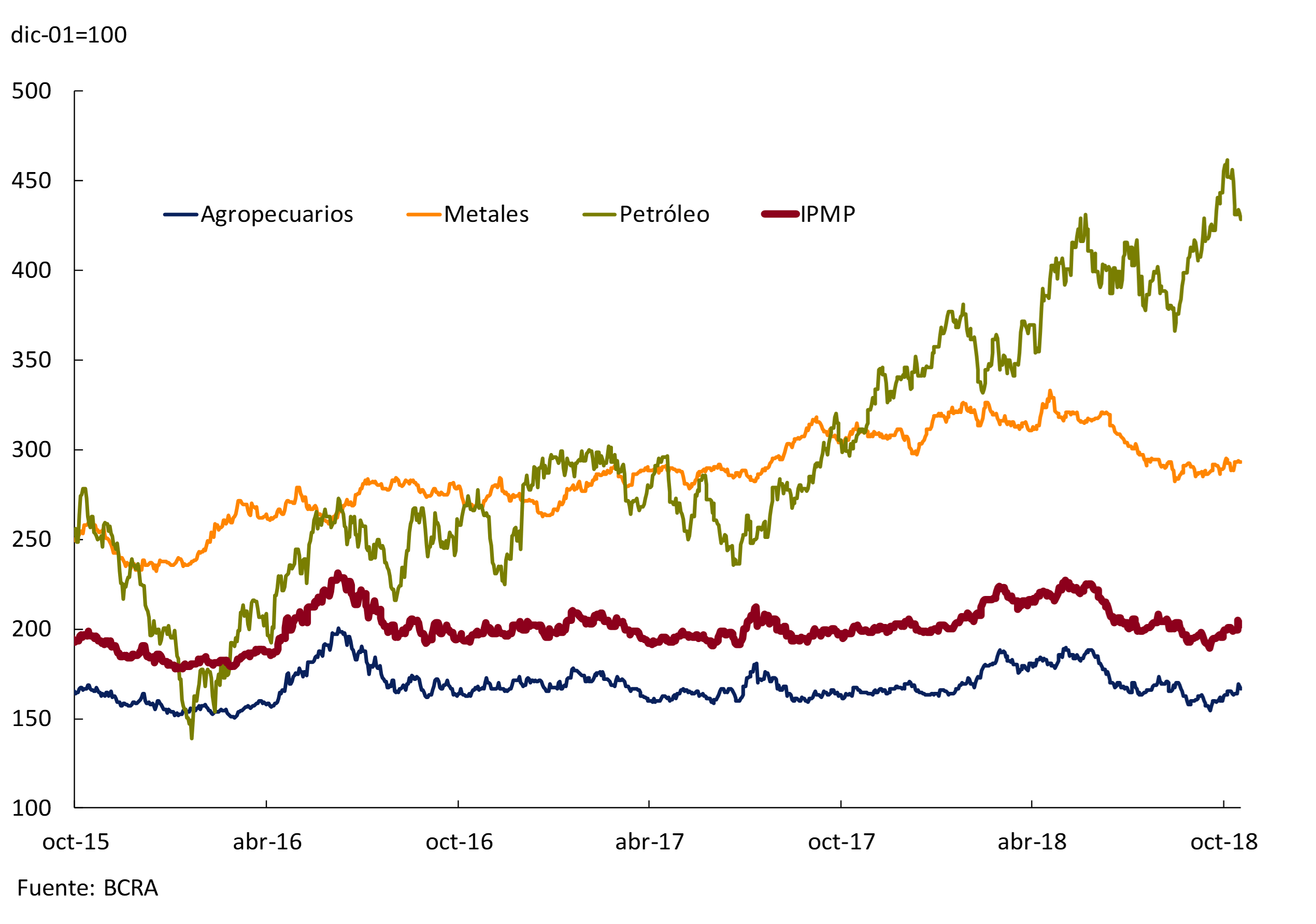 Por otra parte, los precios internacionales de las materias primas medidos en dólares4 siguieron descendiendo en el tercer trimestre, implicando valores que en el margen se ubican aproximadamente 1% por debajo de los niveles de igual período del año previo. Los precios de los productos agropecuarios y de los metales subieron durante octubre, a diferencia del precio internacional del petróleo que cayó levemente, aunque manteniéndose en torno a los niveles máximos de los últimos años (ver Gráfico 2.13).