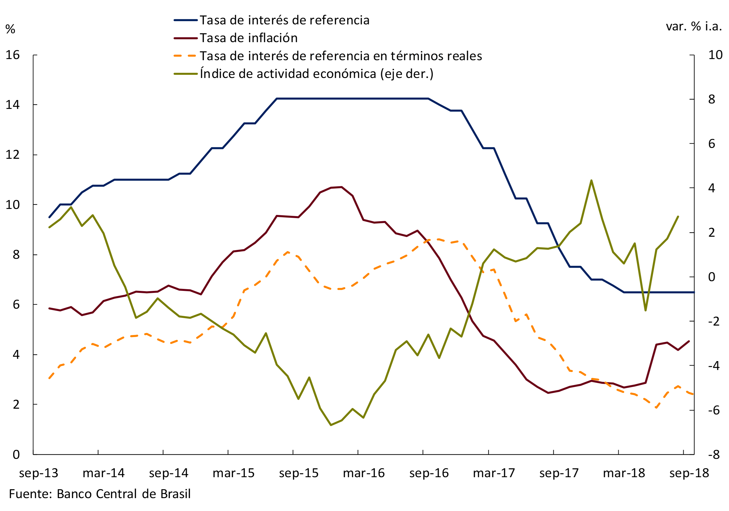 Por su parte, en el contexto del proceso electoral en Brasil, la volatilidad del tipo de cambio se incrementó: desde comienzos de agosto hasta mediados de septiembre, el real brasileño se depreció 13%, para luego revertir esa depreciación. En el trimestre, el BCB no realizó cambios en la tasa de interés de política monetaria, que se encuentra en 6,5% (ver Gráfico 2.3). Por su parte, pese a que la inflación de septiembre fue la mayor desde marzo de 2017 (4,5% interanual —i.a.—), se mantiene en torno al centro del rango meta (4,5% ± 1,5) desde hace cuatro meses. Hasta junio de este año la tasa de inflación interanual estaba por debajo de 3%, habiéndose incrementado en dicho mes en 1,5 p.p. (nuevamente vinculado al impacto de las medidas de fuerza gremiales). De acuerdo con las proyecciones de los analistas que releva Focus, la inflación finalizaría el año en 4,4%, y en 4,2% en 2019, mientras que el BCB mantendría sin cambios la tasa de política monetaria para el resto de 2018, para incrementarla a 8% en 2019.