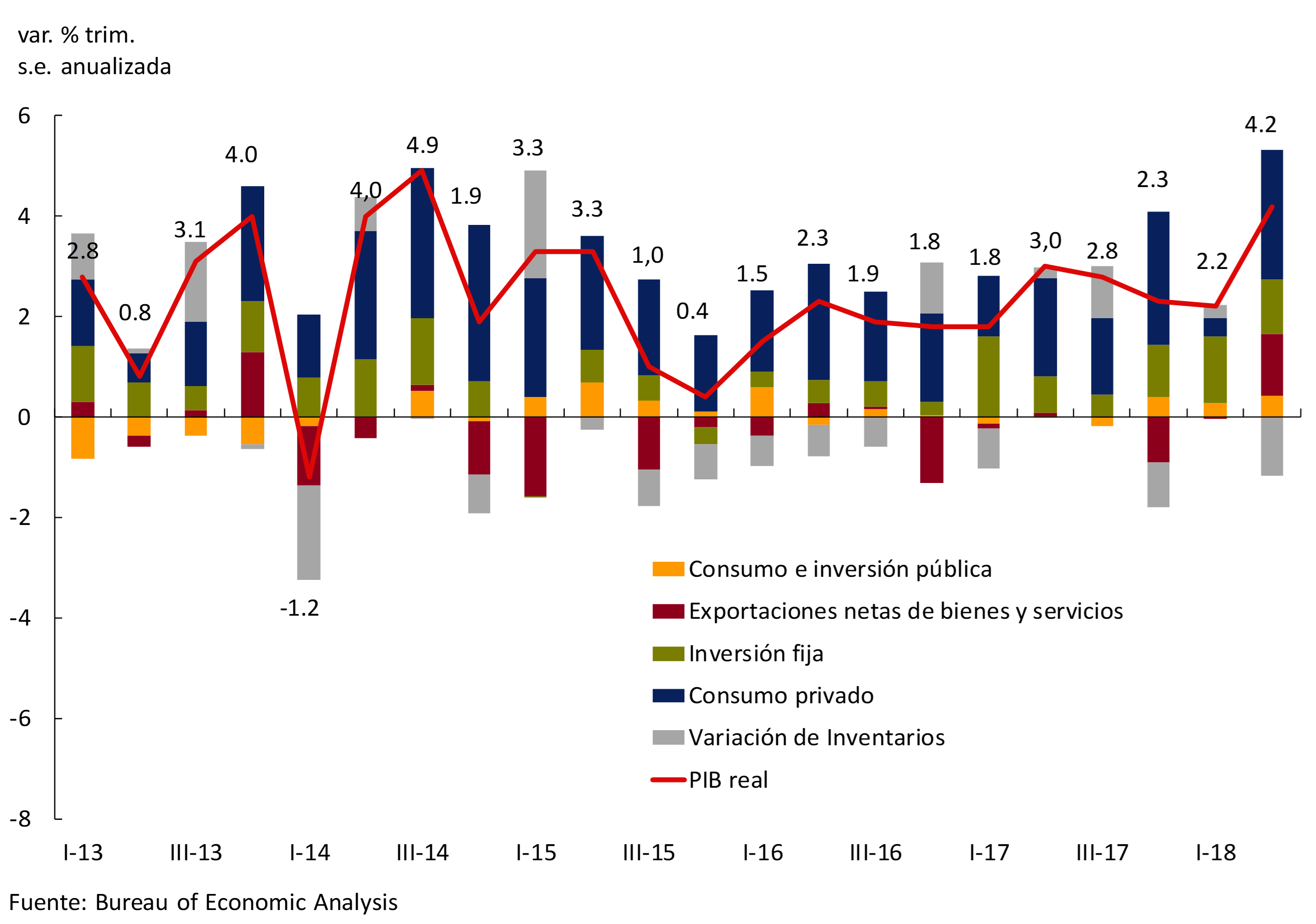 En los Estados Unidos —tercer destino de las exportaciones argentinas— la tasa de crecimiento del segundo trimestre fue de 4,2% (sin estacionalidad y anualizada), la más alta de los últimos cuatro años (ver Gráfico 2.4). Ello se debió principalmente al aporte del consumo privado —que pasó de una contribución al crecimiento de 0,3 a 2,6 p.p.— y a las exportaciones que contribuyeron con 1,2 p.p. Algunos indicadores adelantados como el GDPNow de la Reserva Federal de Atlanta están mostrando que la tasa de crecimiento de la economía norteamericana en el tercer trimestre estaría también en torno al 4,2%. Las mayores tasas de crecimiento que está registrando la economía norteamericana están vinculadas al estímulo fiscal reciente, que dejaría de tener impacto en el crecimiento en 2020.