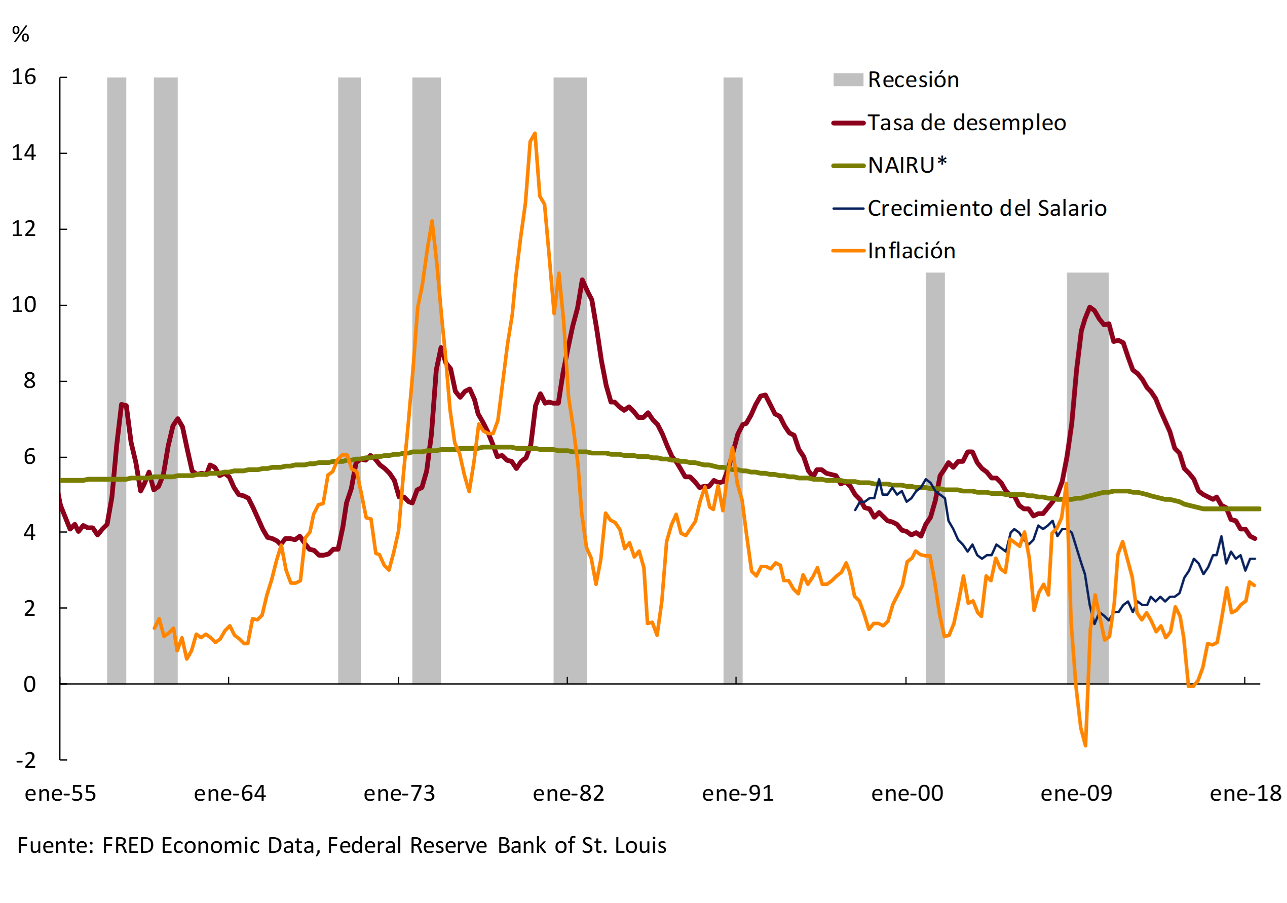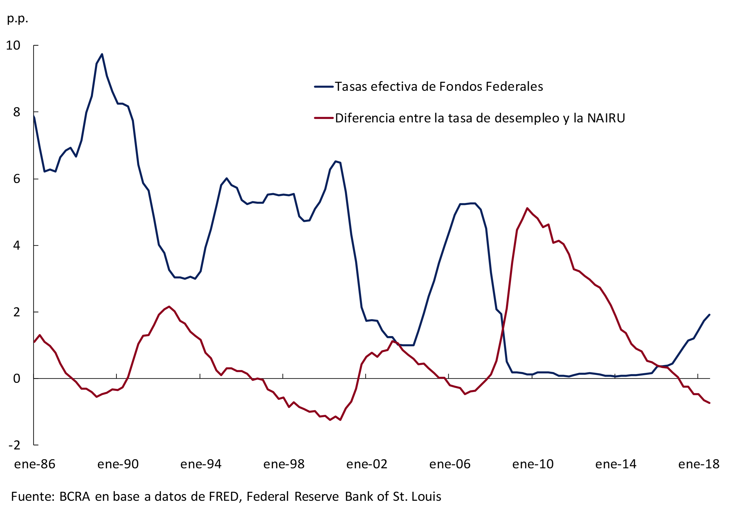 En el caso del mercado laboral, se viene registrando una aceleración en el aumento de los salarios. A su vez, la tasa de desempleo se ubicó en 3,7% en septiembre (la menor desde agosto de 1969, ver Gráfico 2.5) y -0,9 p.p. por debajo de la estimación de la NAIRU2 , algo que no ocurría desde 2001. En ese momento, la tasa de referencia de la Fed estaba en valores que más que duplicaban los actuales, lo que podría ser una señal de que la Fed aún tendría bastante margen para seguir subiendo su tasa de política monetaria (el mensaje es aún más contundente si se toma en cuenta la tasa de interés de referencia en términos reales). De todas maneras, se debe tomar en cuenta que la necesidad de subir la tasa de interés por parte de la Fed puede ser menor si en este tiempo se hubieran dado cambios estructurales que hayan incrementado el PIB potencial de los Estados Unidos (algo que se infiere del Gráfico 2.3 del IPOM de abril de este año). También, el sesgo contractivo implícito en la tasa de interés de referencia puede estar siendo subestimado porque no toma en cuenta el efecto contractivo del fin de las políticas monetarias no convencionales (programa de compra de activos).